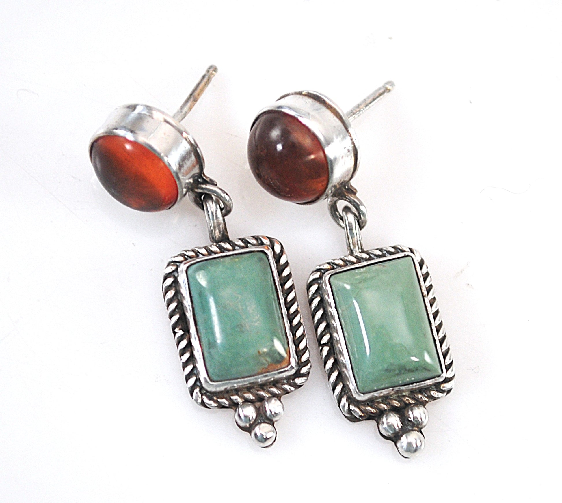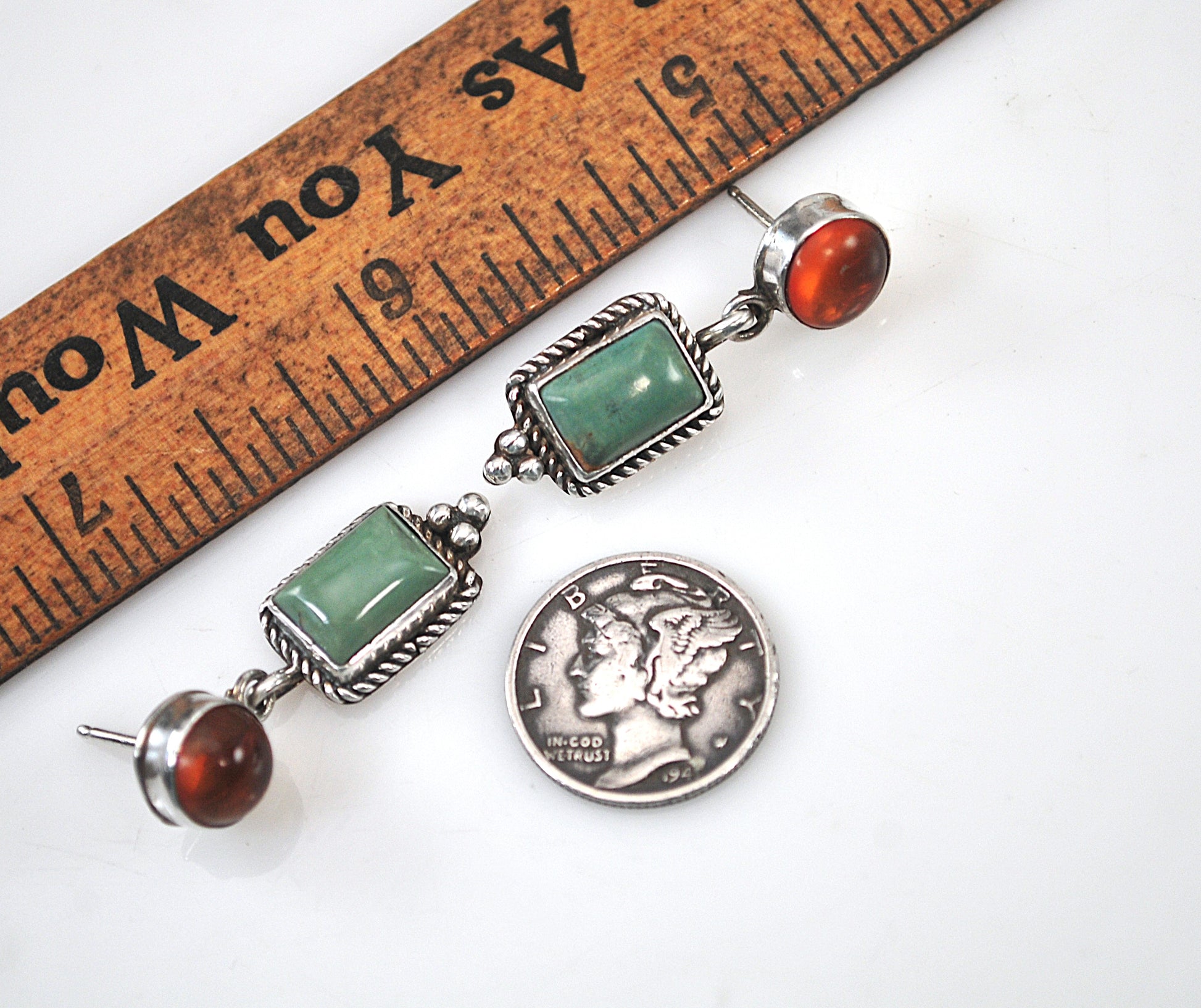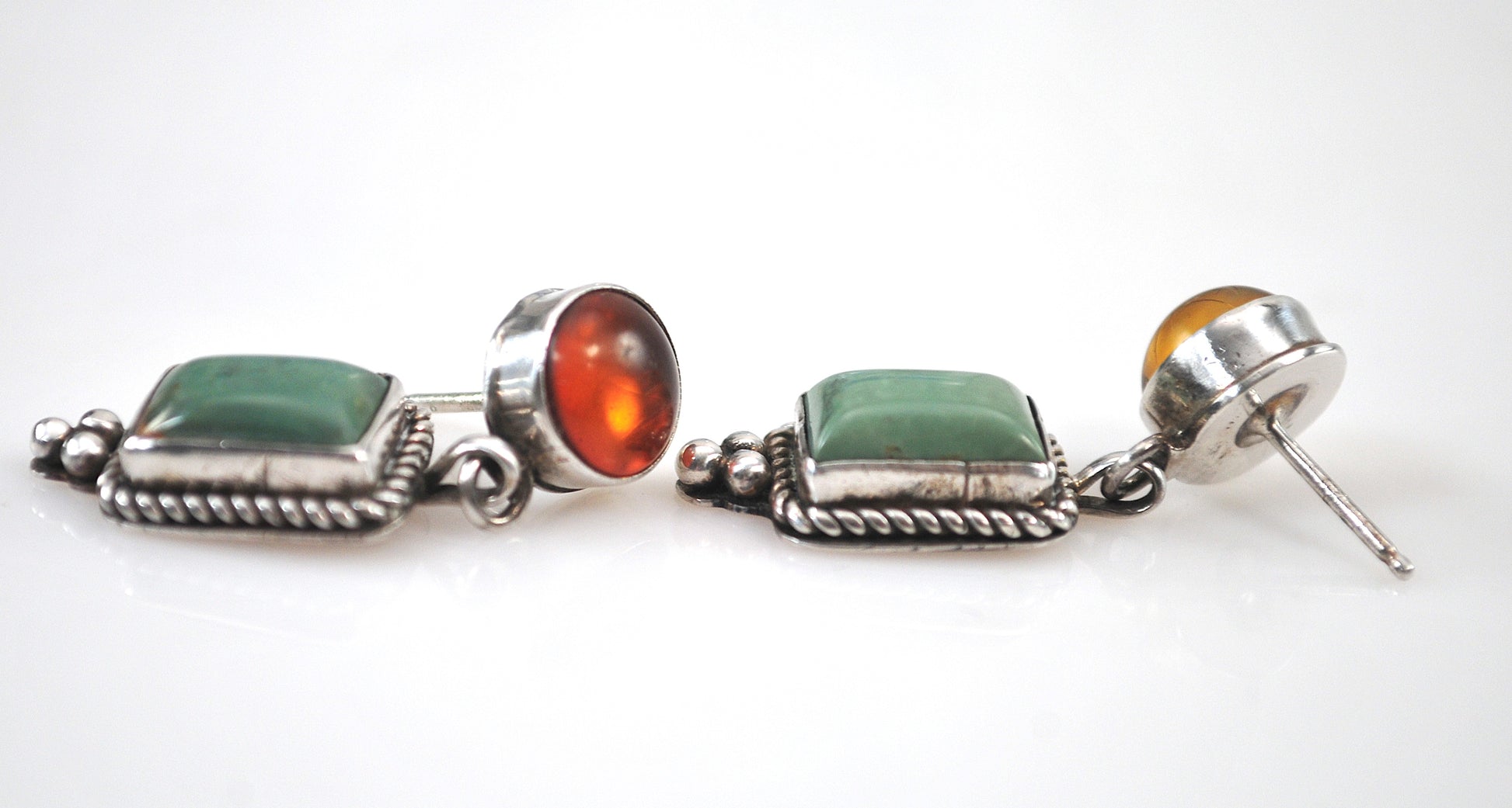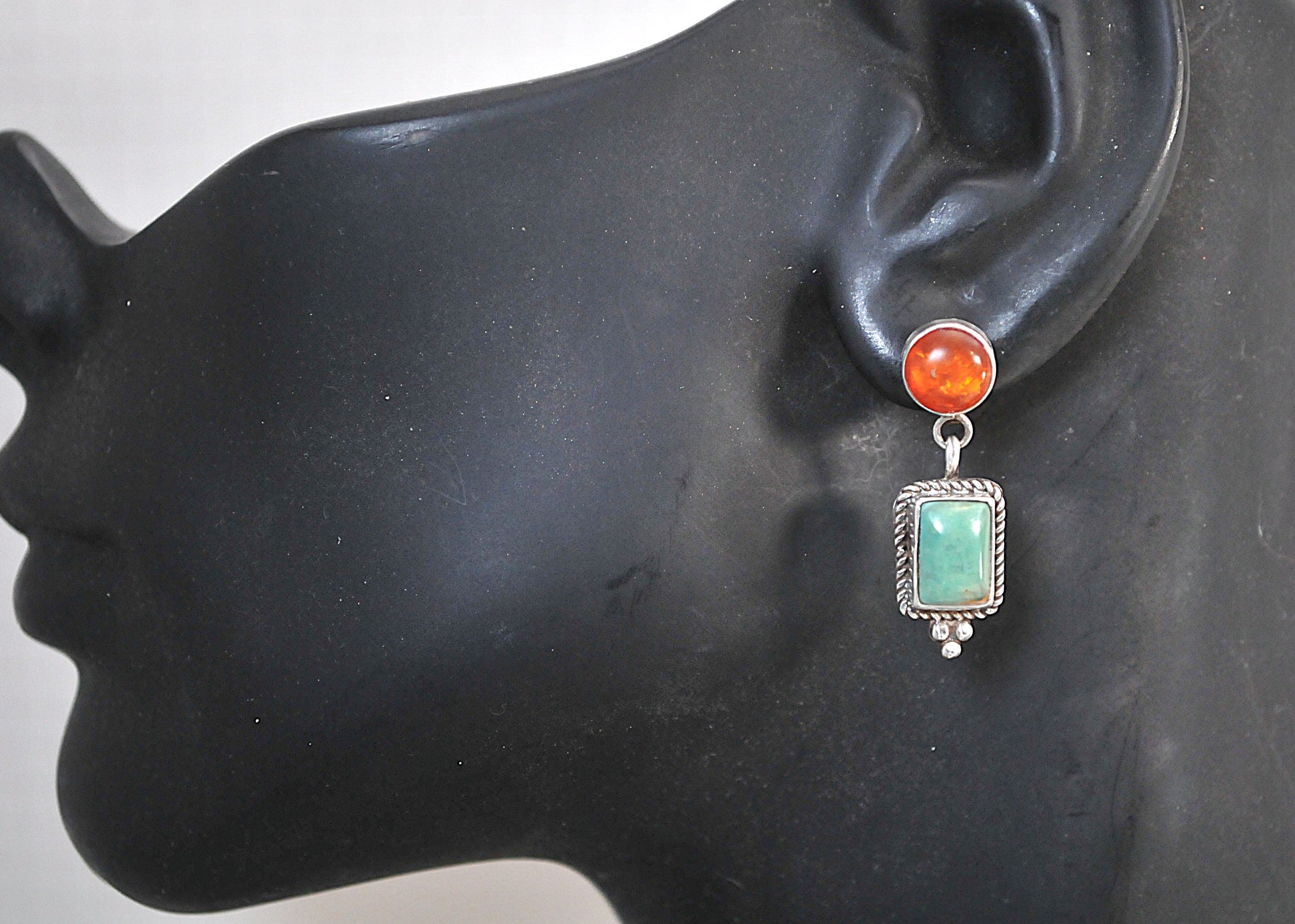 Sterling silver Native American handmade earrings are hallmarked and feature approximately 8mm round Amber over 10.5x7.5mm Green Turquoise in Southwestern settings. They come with silicone backs.