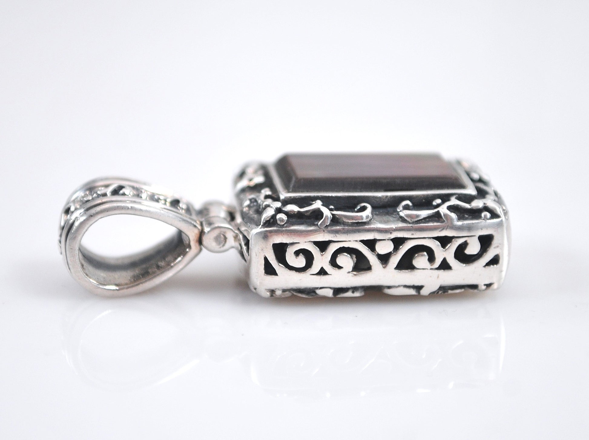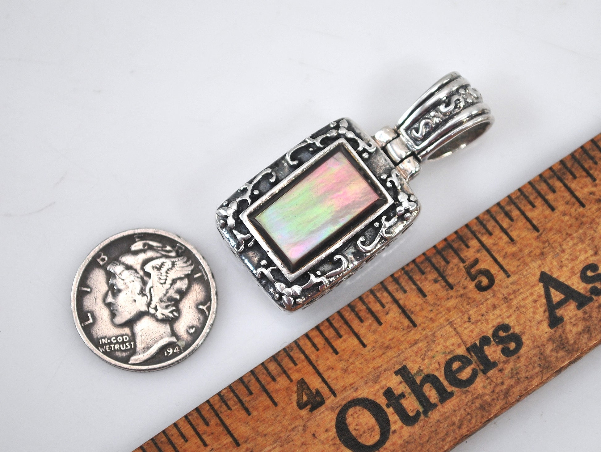 Pretty double sided sterling silver iridescent Abalone pendant is signed 925 and a maker's mark and features a scrolled design.