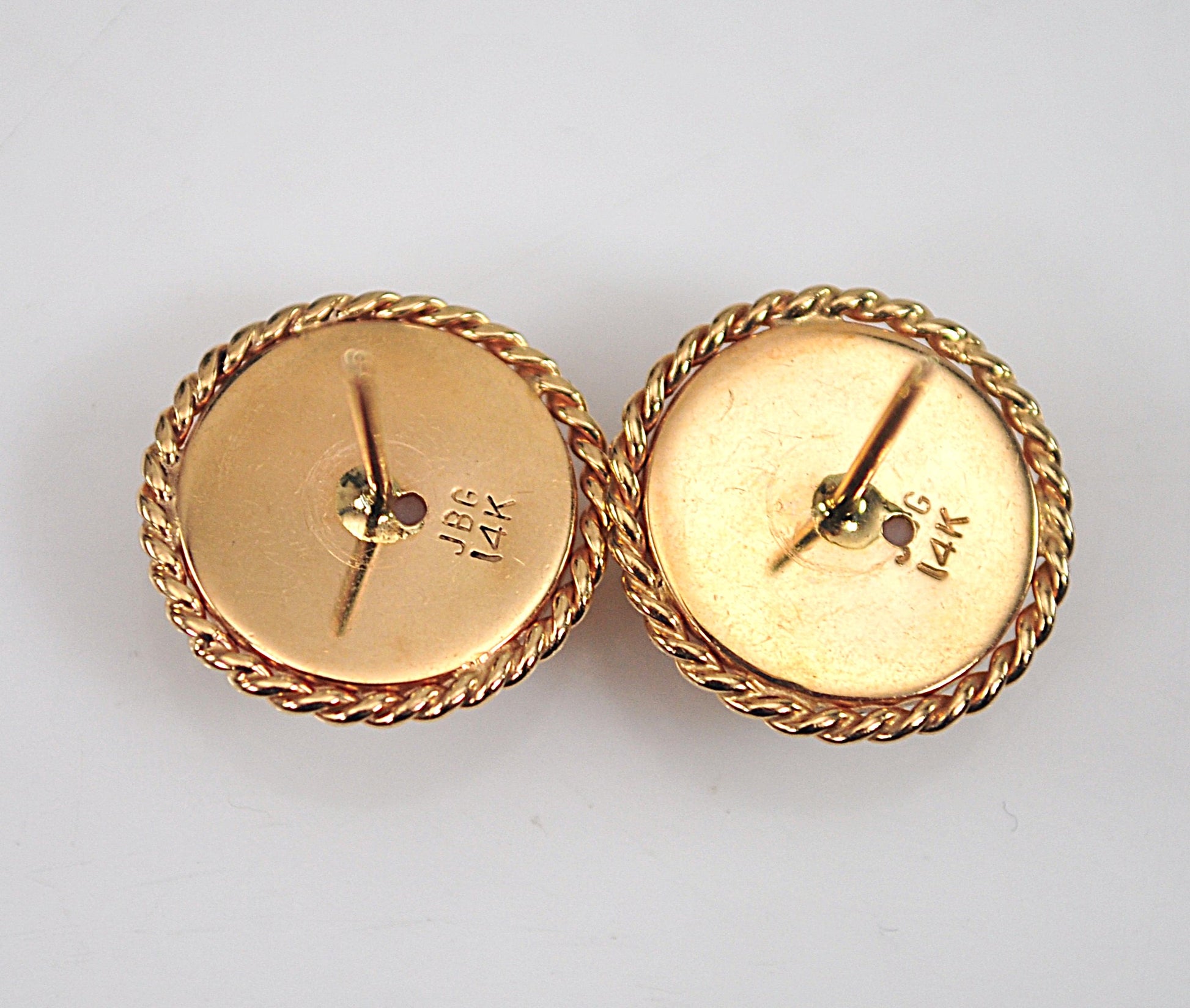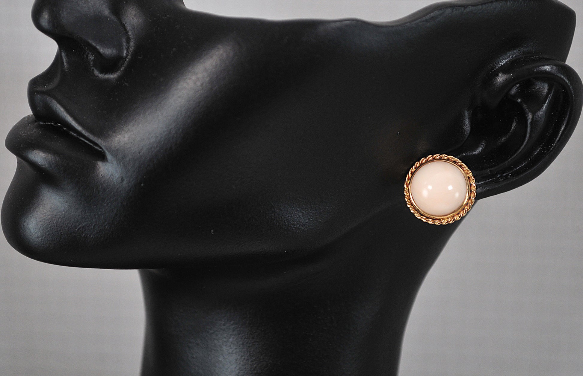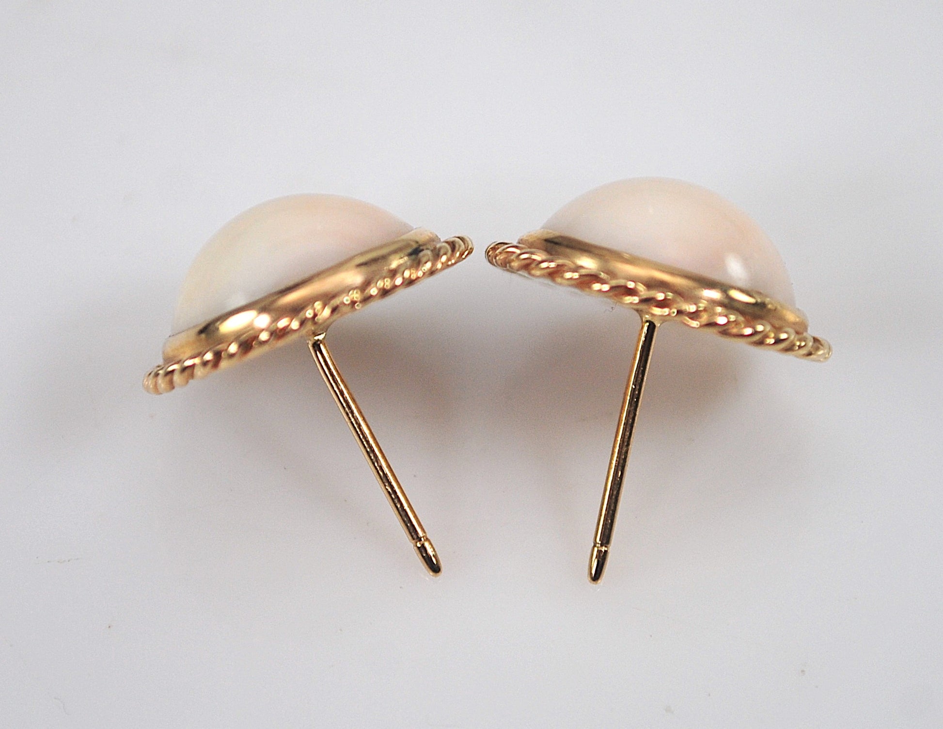 14K yellow gold stud earrings are signed JBG 14K and feature 10mm Angel Skin Coral cabochons. They come with silicone backs.