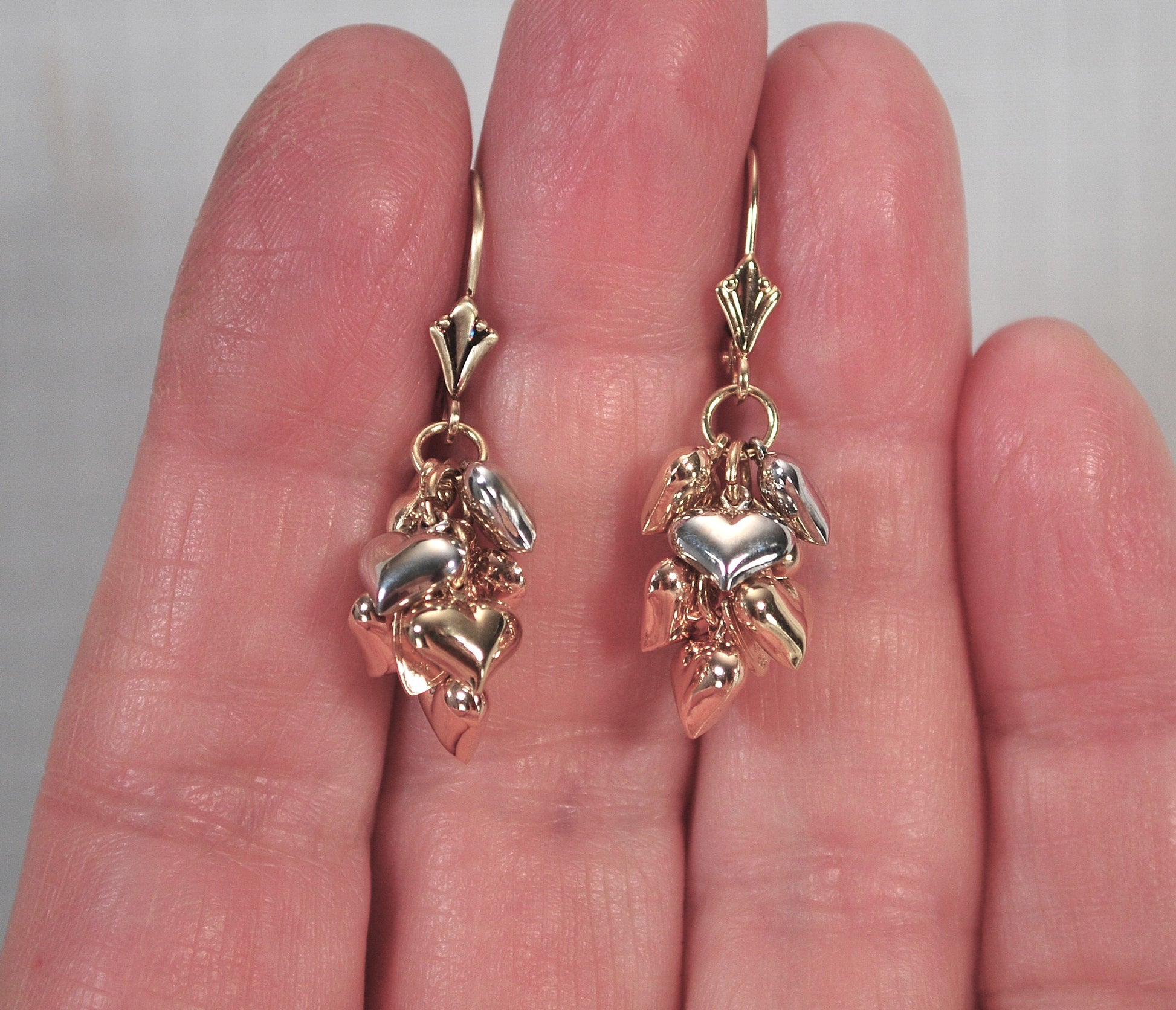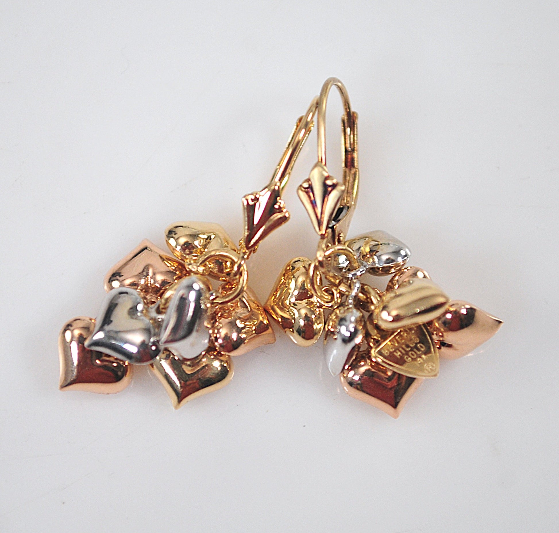 Tri-color rose gold, yellow gold and white gold puffed heart tassel earrings are signed Beverly Hills 14K Gold on hangtags on each earring and both euros are marked 14K and a hallmark. **Please note** The euro wires are slightly different shades of gold from one another. I don't know if one was replaced, but they both have the same hallmark on them. The earrings and euros have been tested as 14K gold.