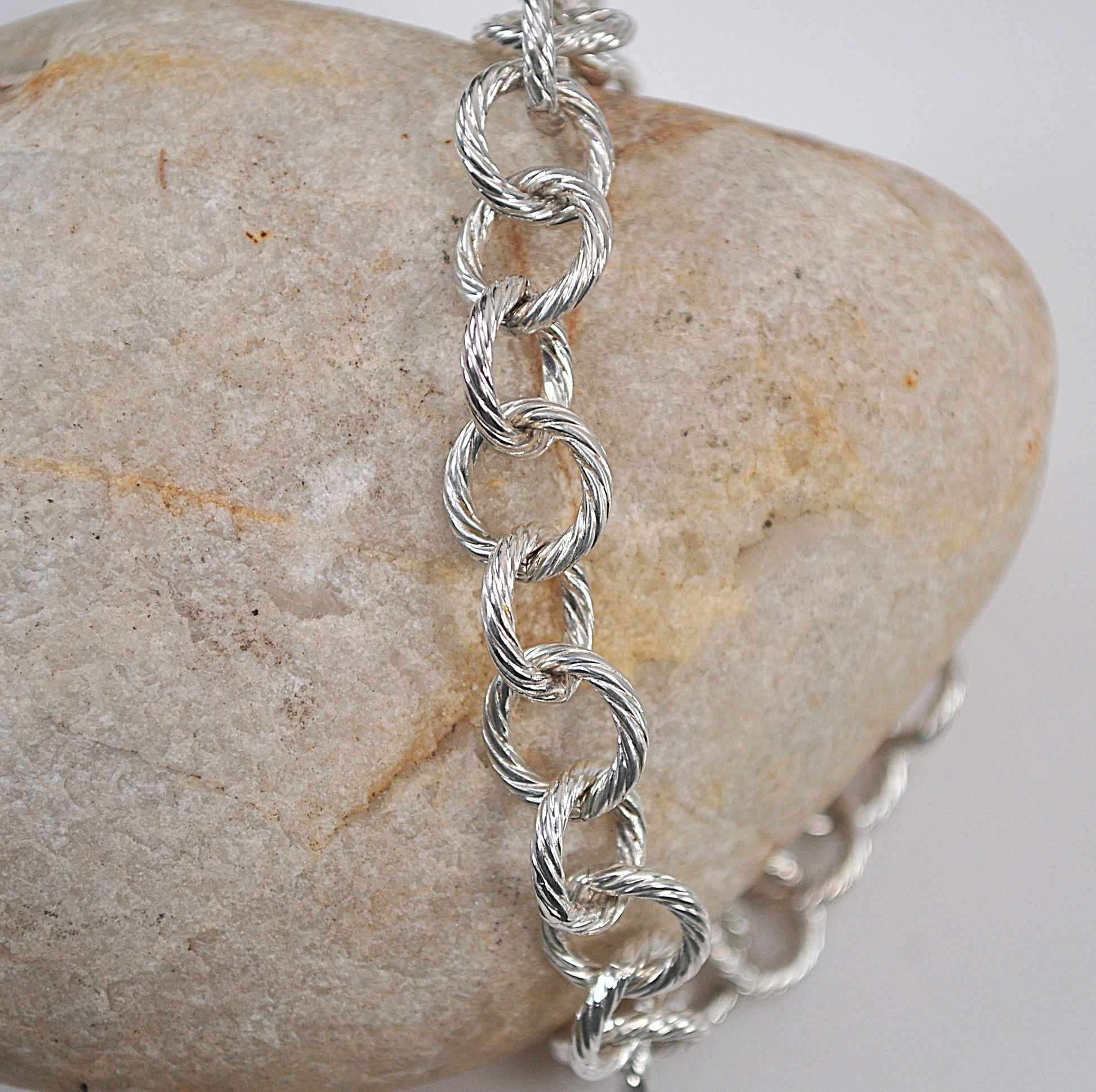 This bracelet is very shimmery and sparkly in person. Very nicely made bracelet by Providence Chain Company is signed PC .925 and features approximately 11mm round rope soldered links and a toggle closure. This is a larger wrist bracelet.