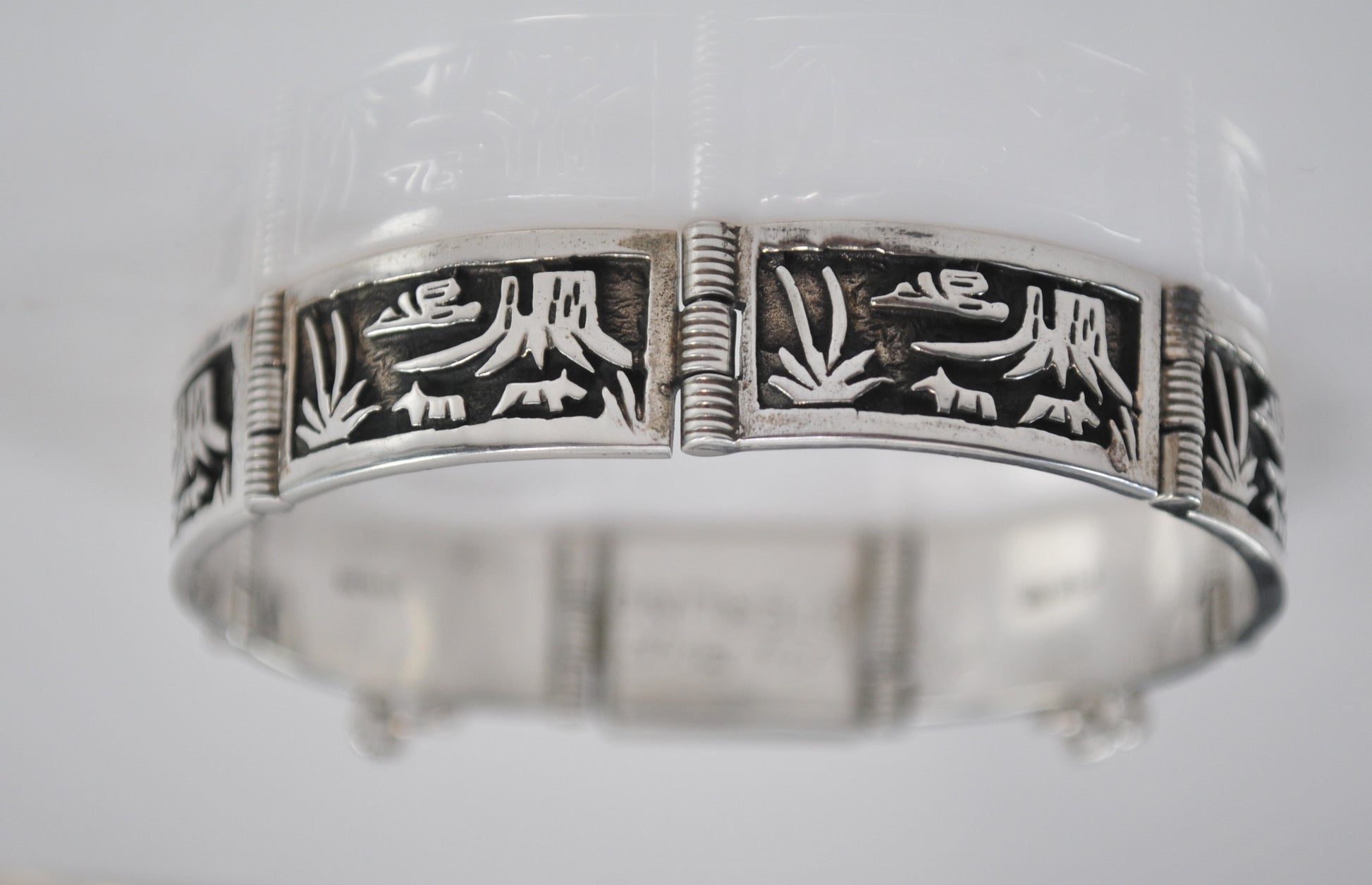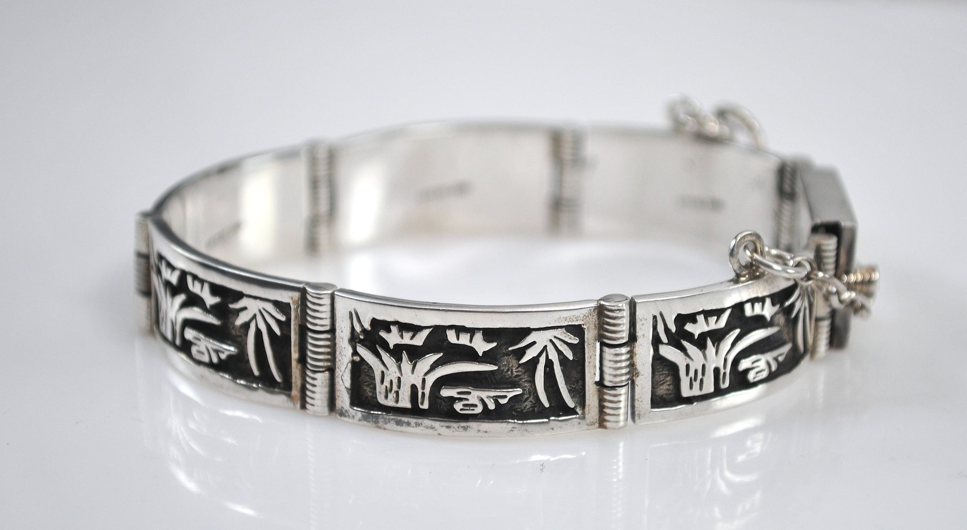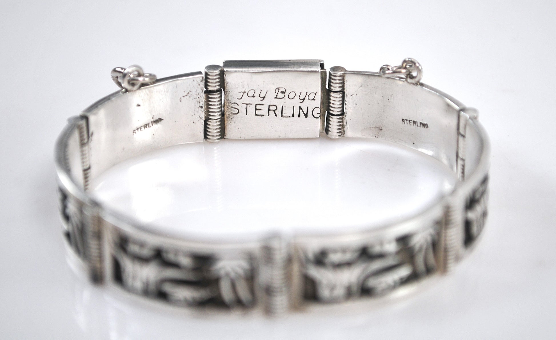 I mistakenly took photos of this bracelet upside down. I flipped some of the photos so the images could be seen the right way. Vintage Navajo sterling silver storyteller bracelet is signed JAY BOYD STERLING and features raised relief images on oxidized bases.