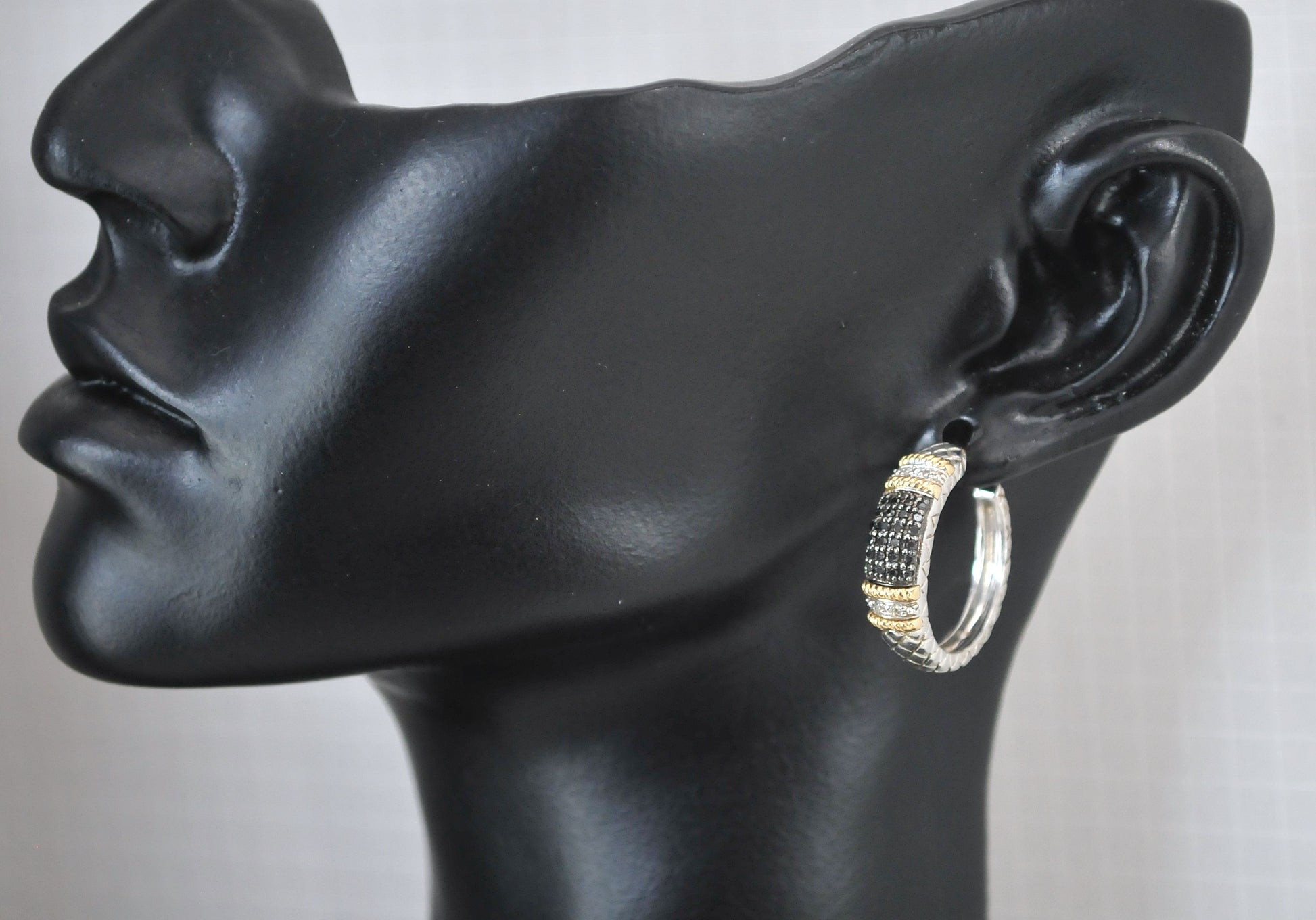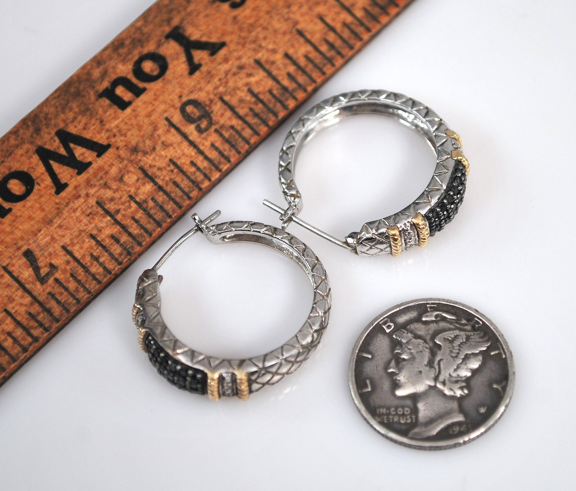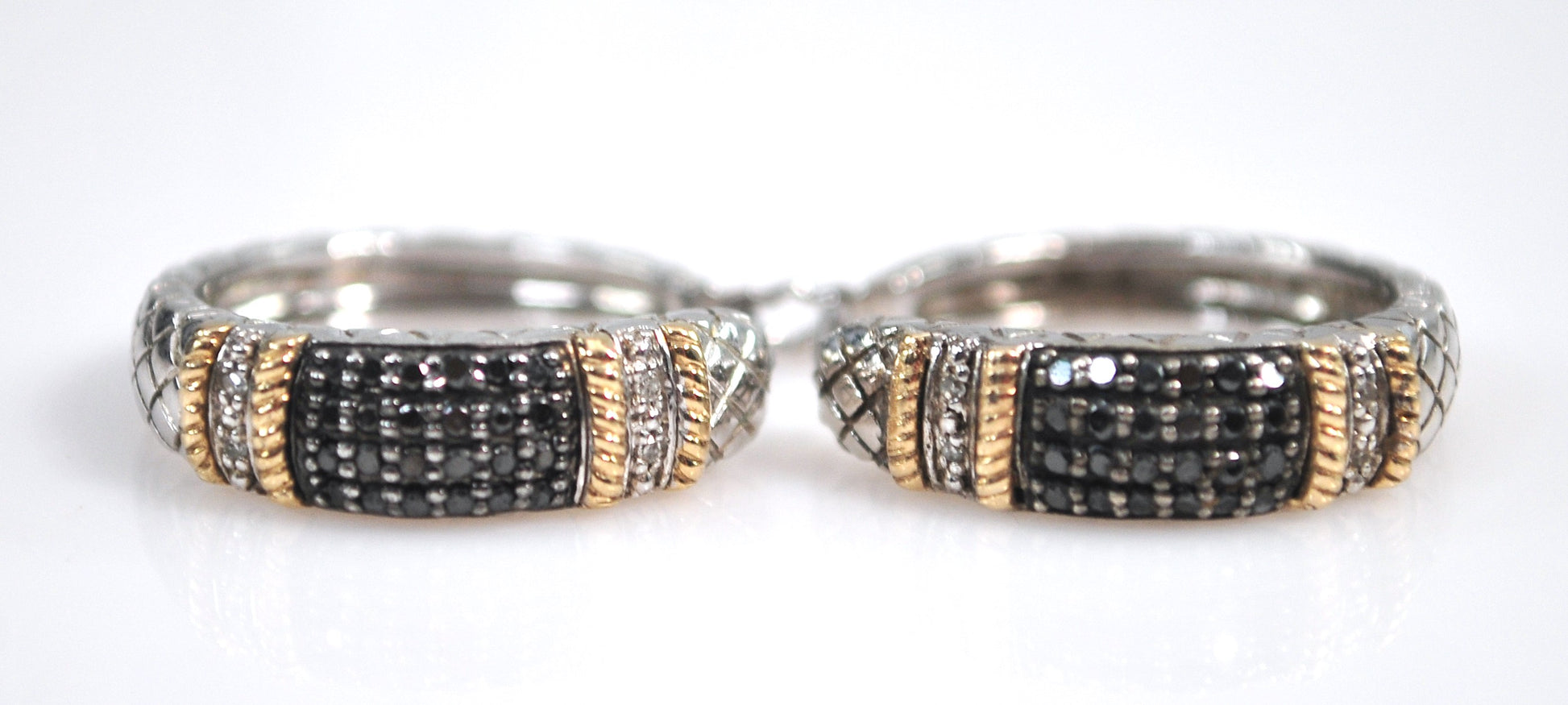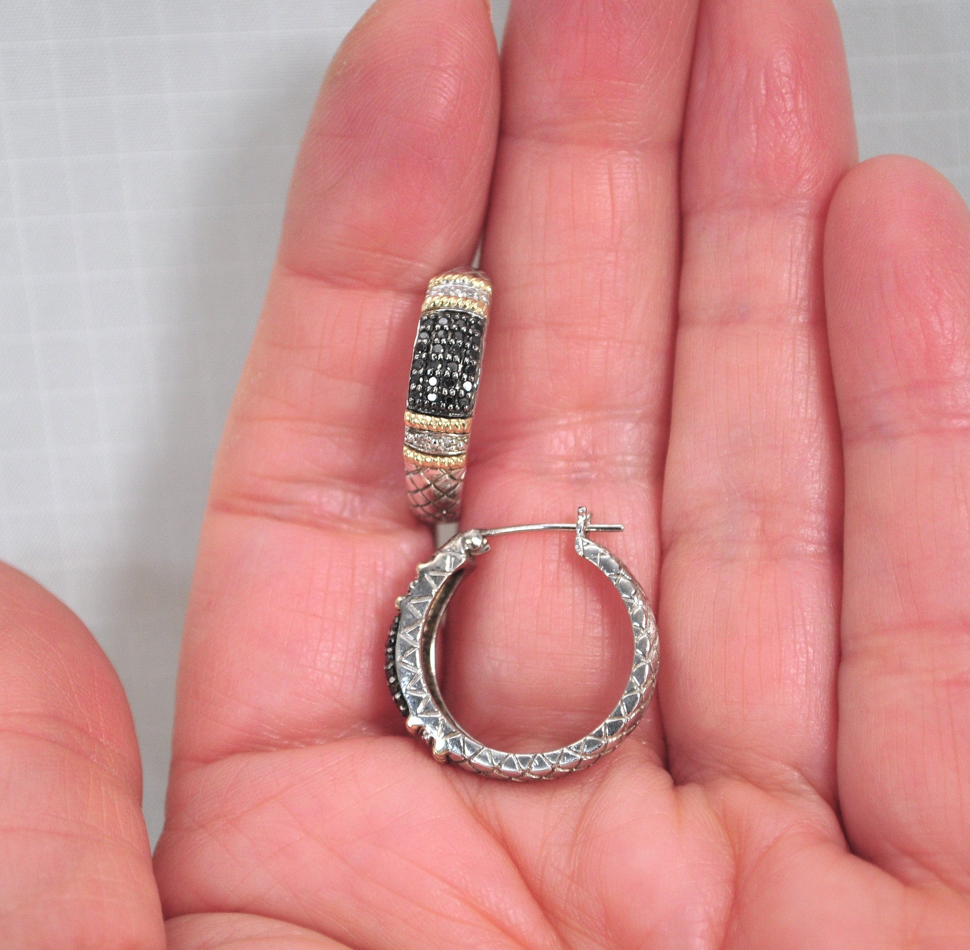 Mixed metal round hoop earrings are signed 925 14K and a maker's mark, and features 14K gold accents, with black Diamonds and four clear Diamonds in each earring.