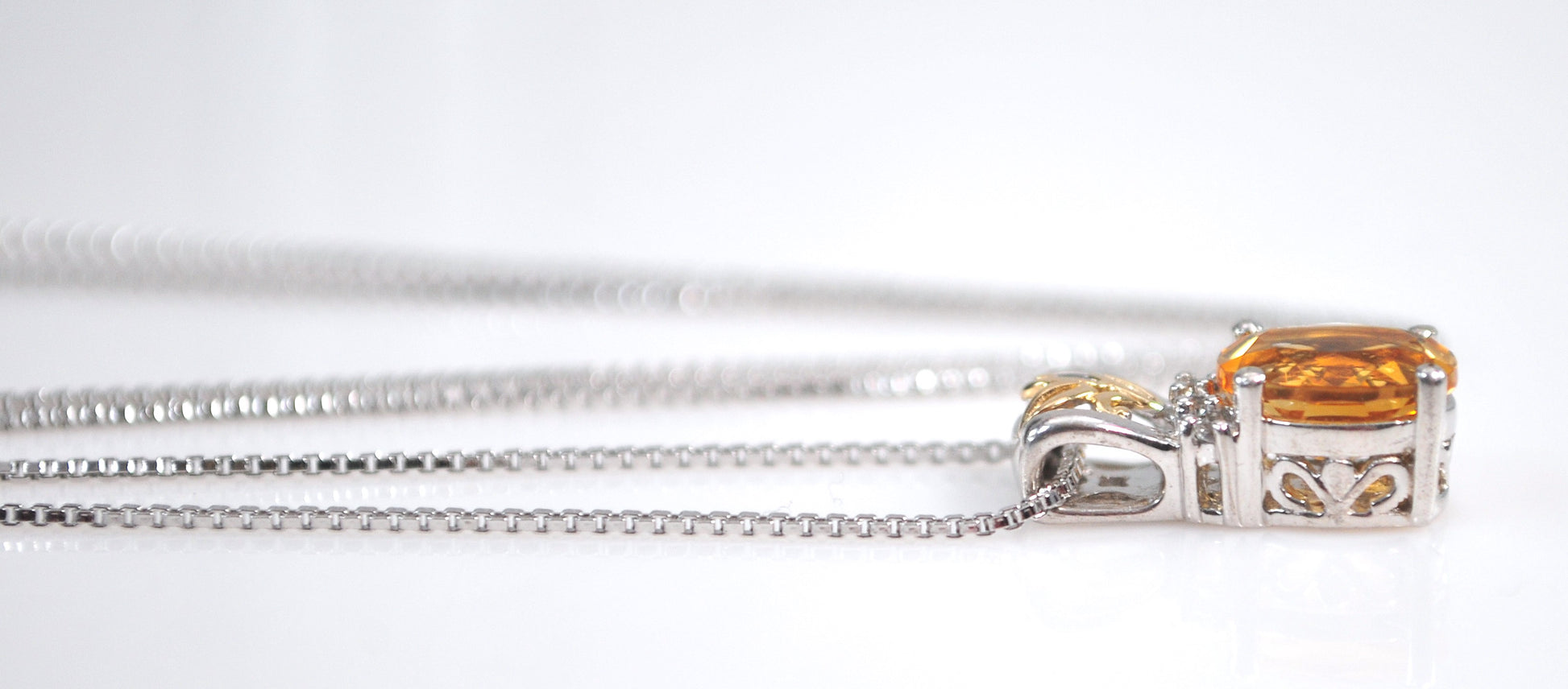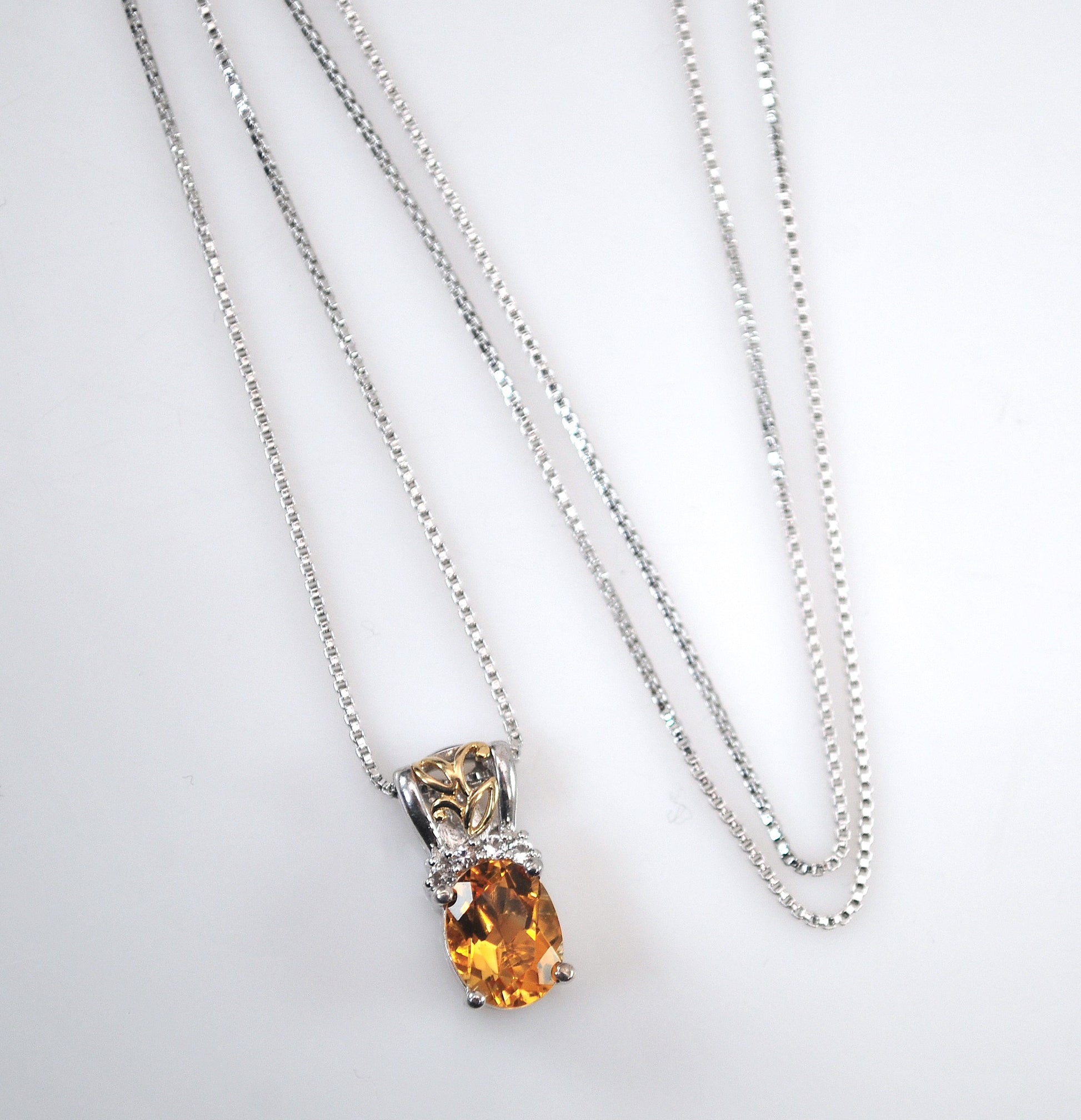 Signed Sterling Silver 14K Gold Citrine Diamond Pendant Necklace