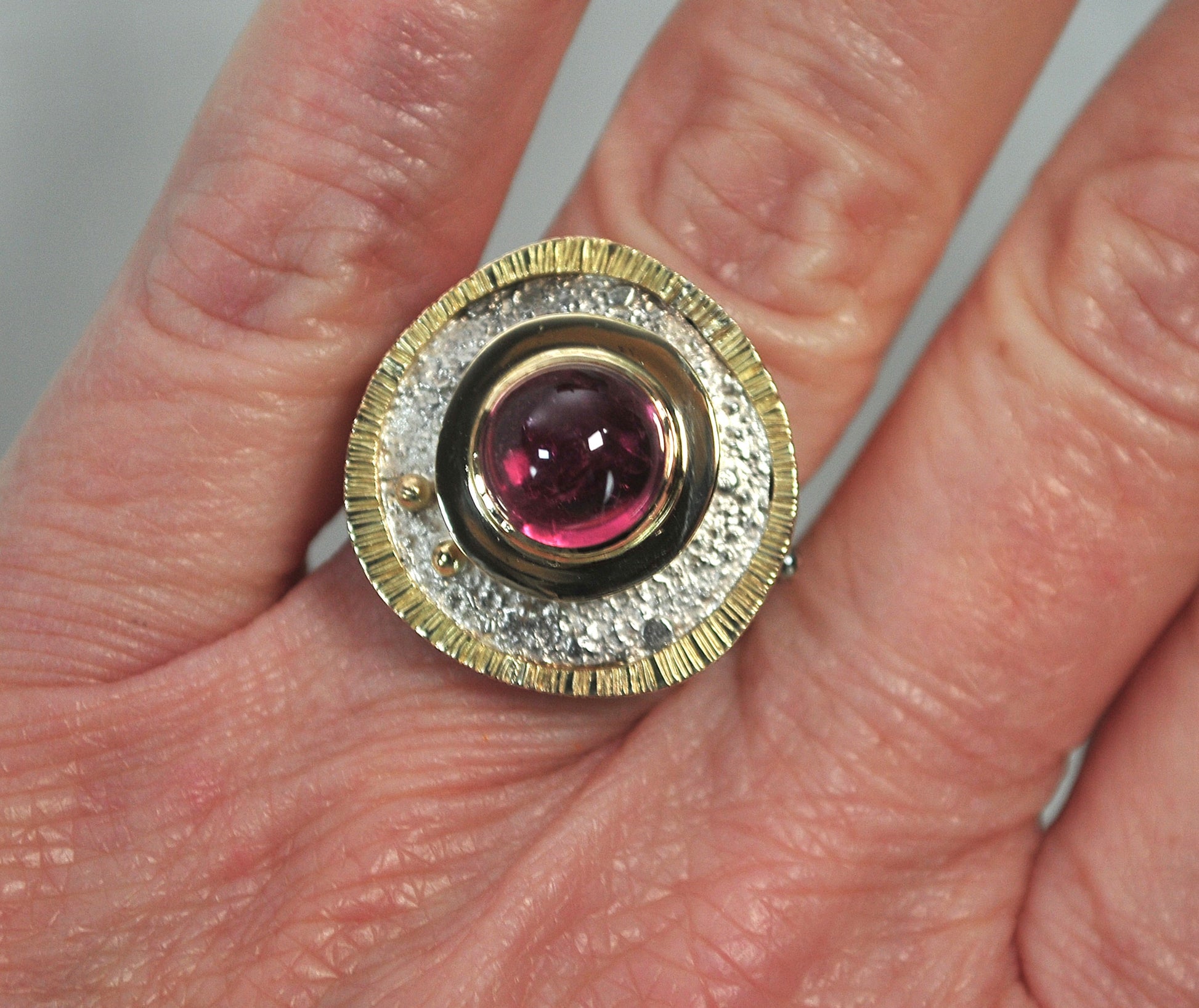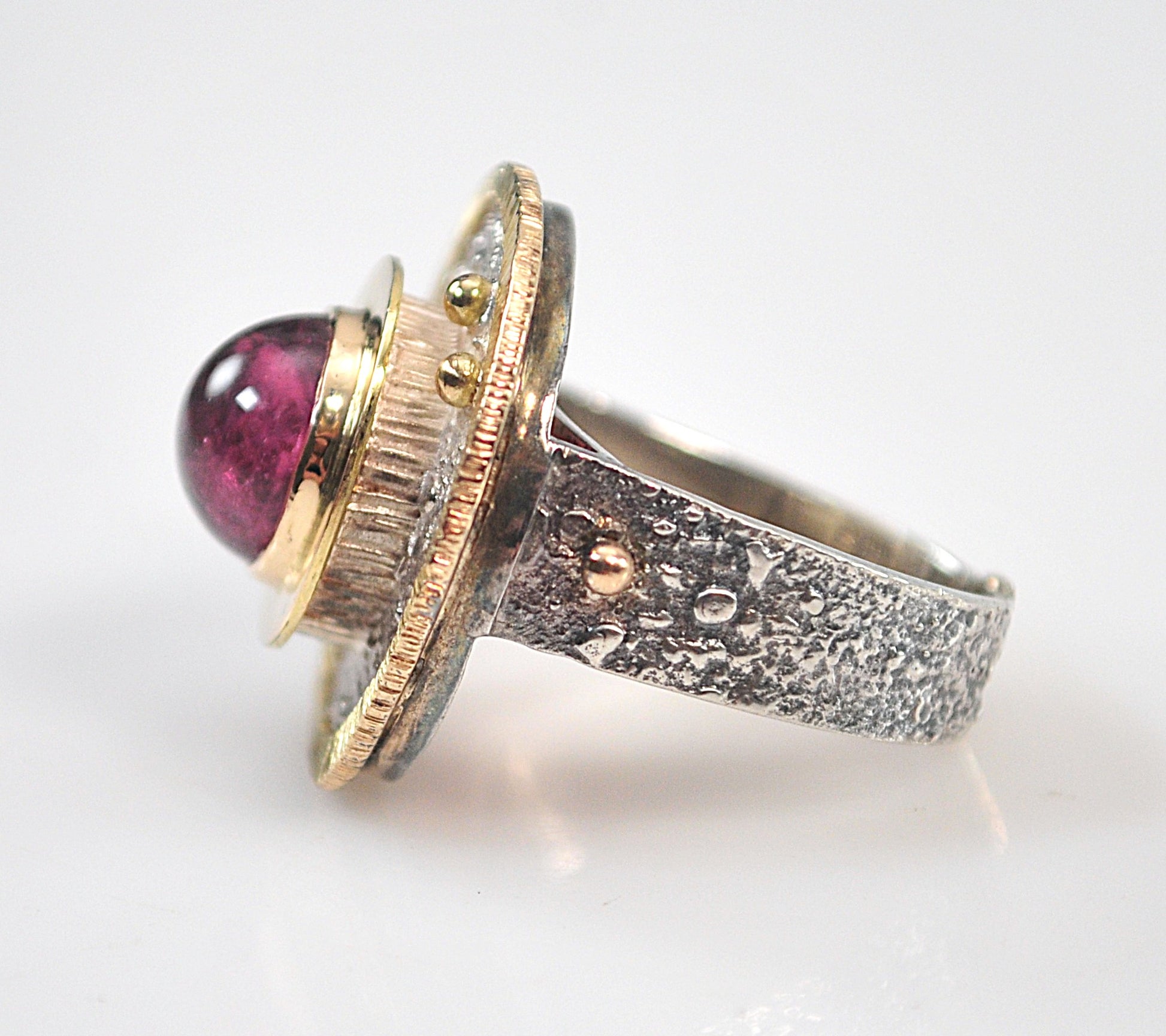 Handmade mixed metal ring is signed and numbered 14K Sterling 23/50 and features a 9mm purplish cabochon.