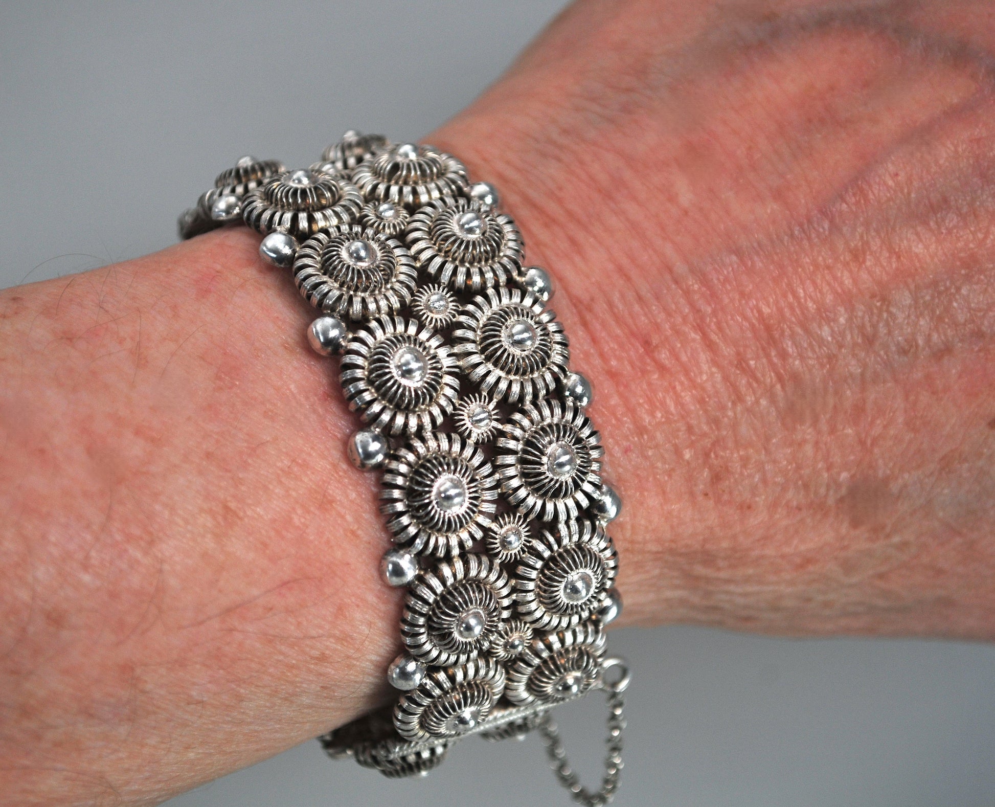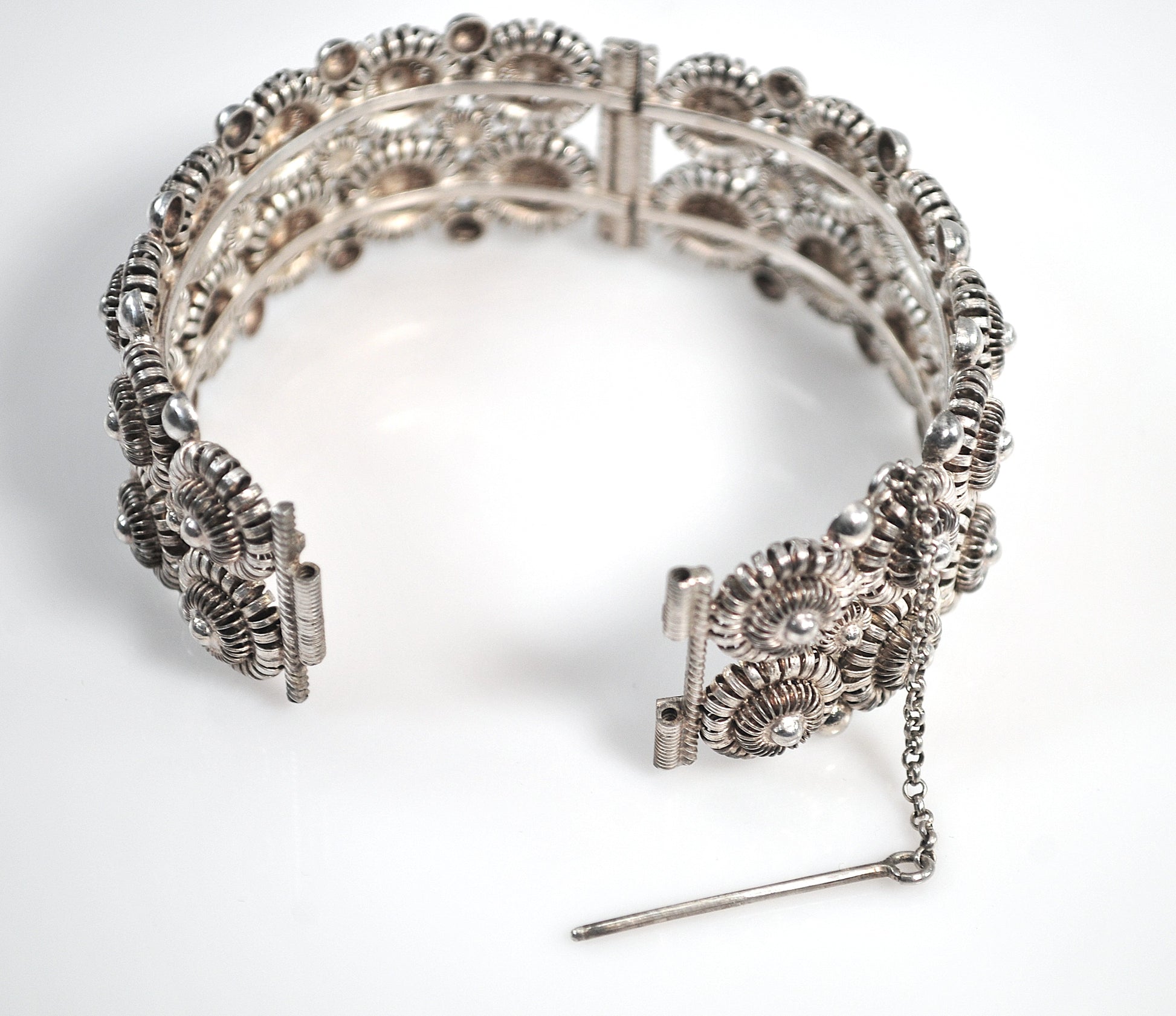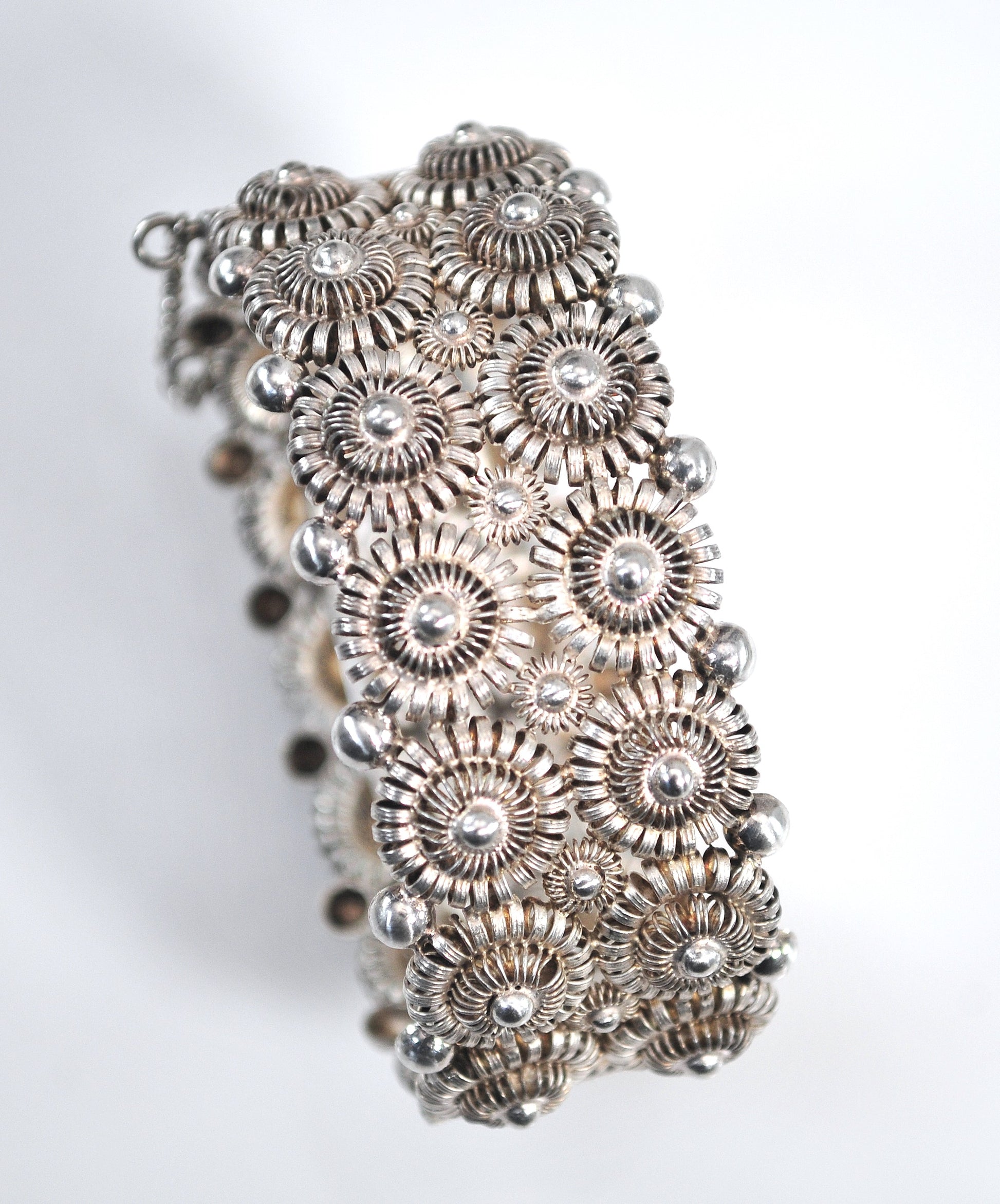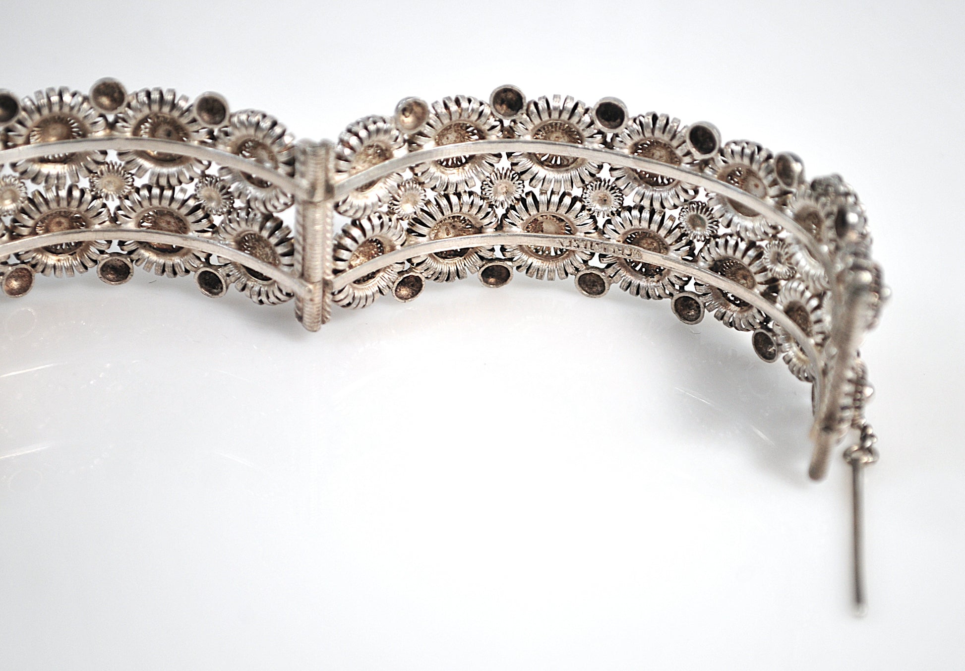 Beautiful handmade openwork cannetille style bangle bracelet is signed what looks like V Christesen, so I'm thinking it is Norwegian. It has been tested as sterling silver and it features a pin hinge closure.