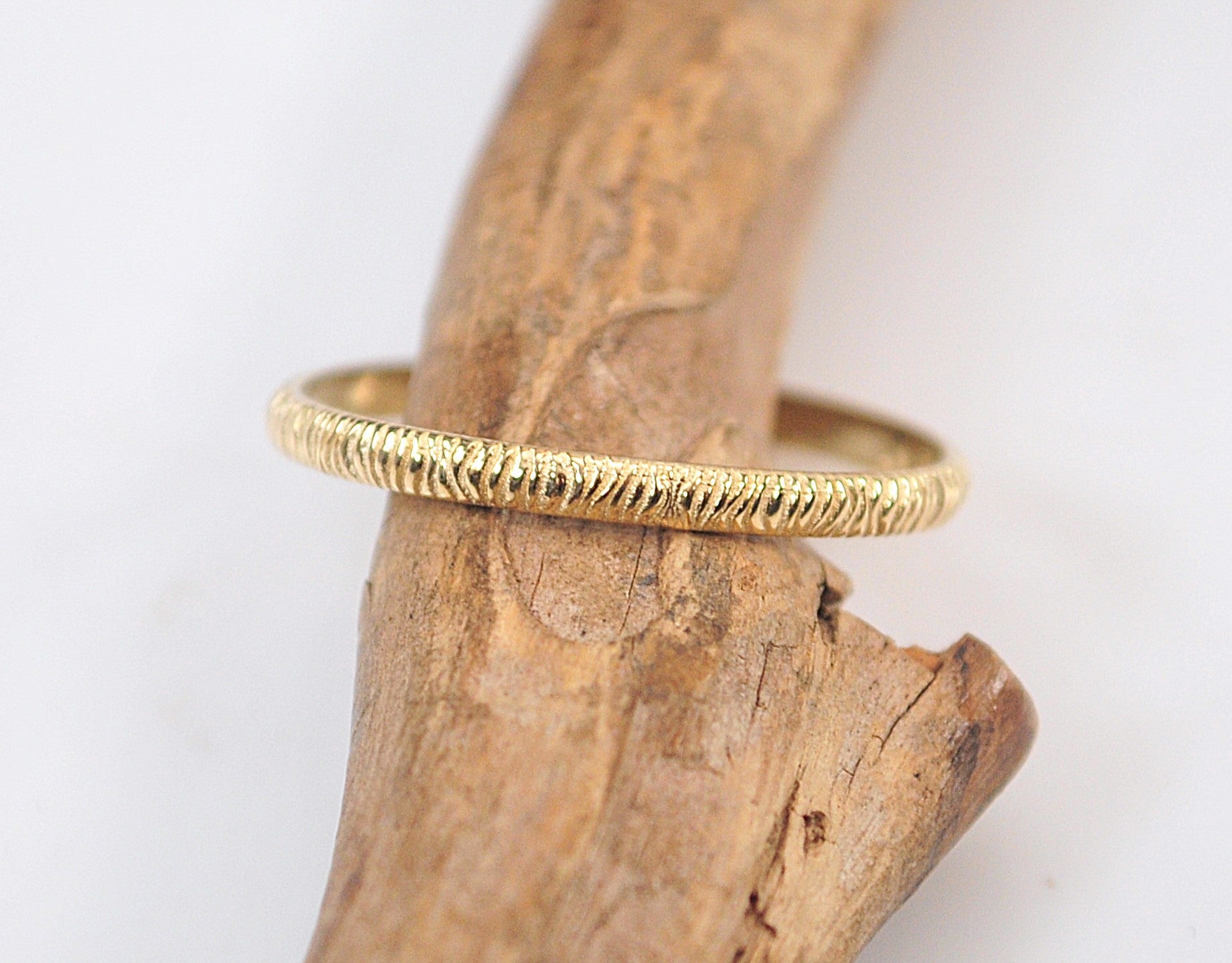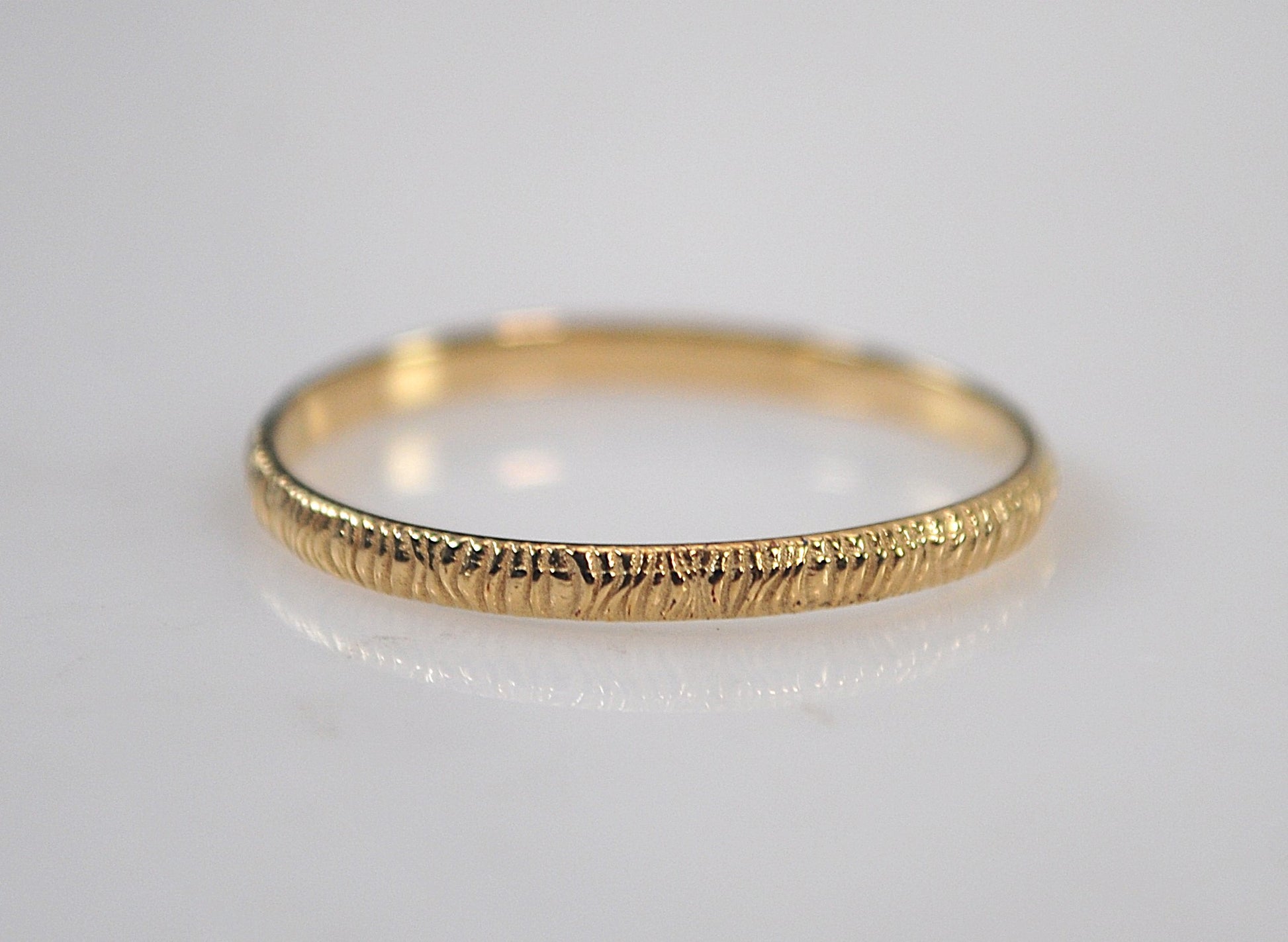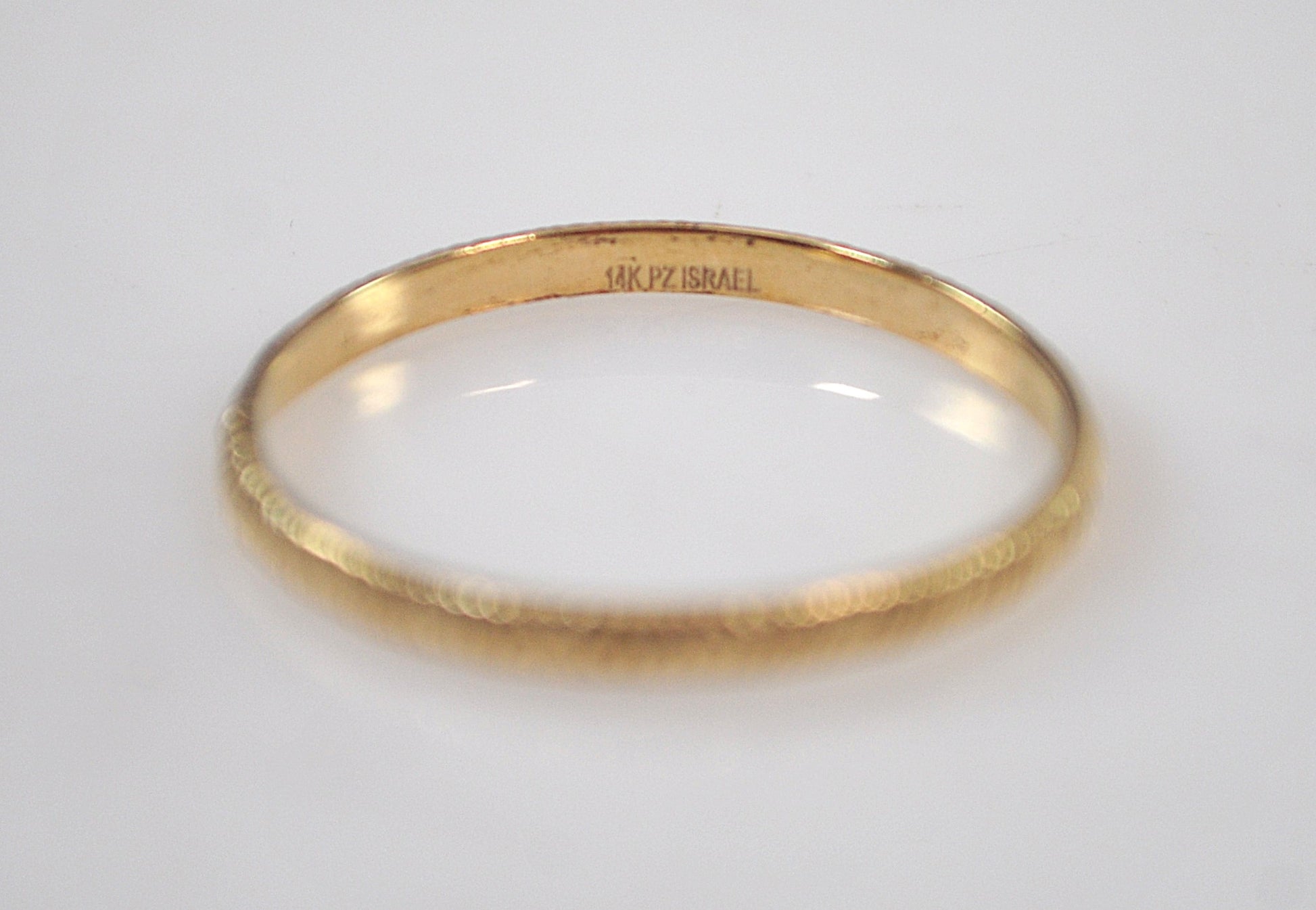 This listing is for only ONE ring in the video but two are available. Solid 14K yellow gold narrow ring is signed 14K PZ Israel and features a textured ribbed design. The other ring is available under a separate listing.