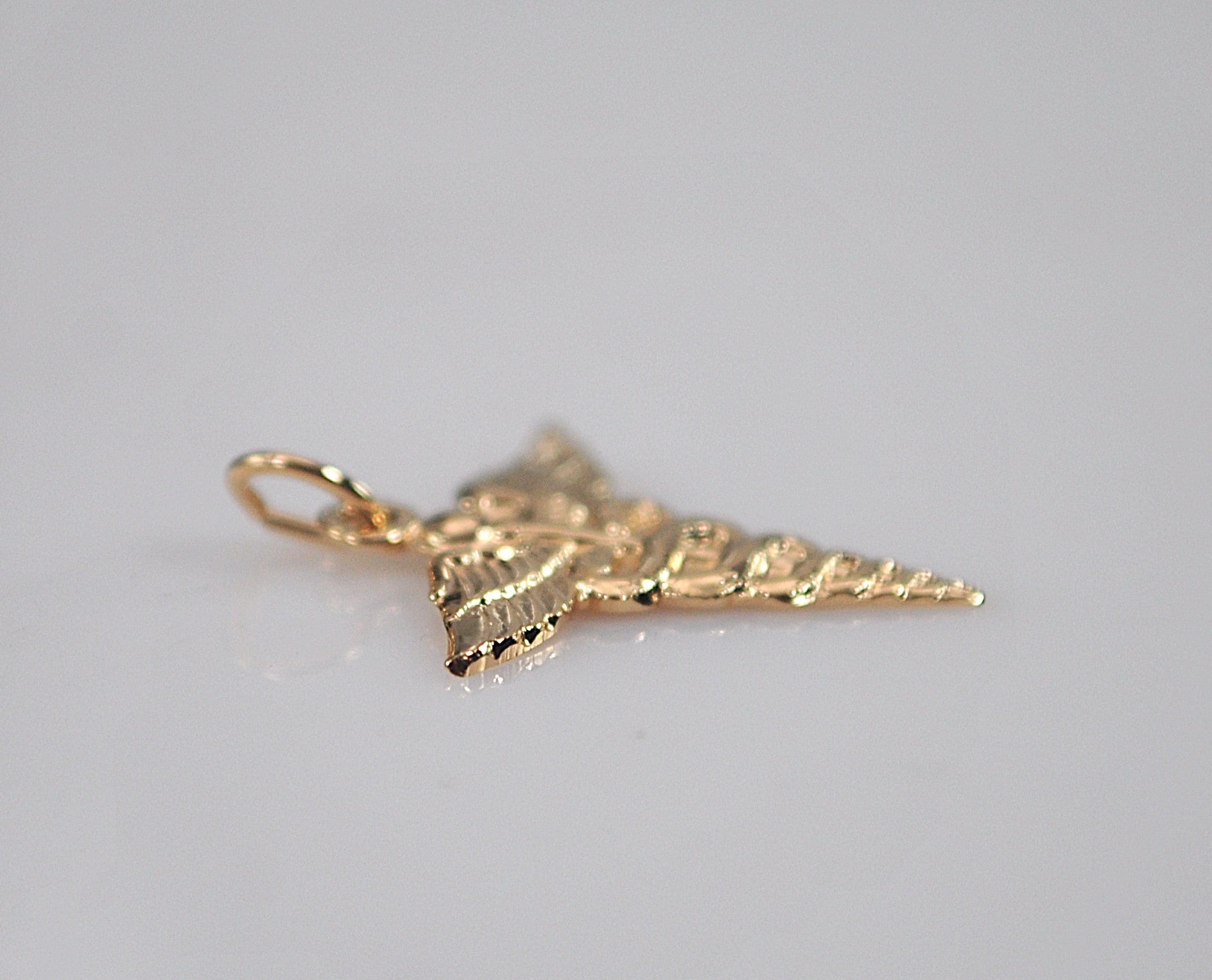 Solid 14K gold medical symbol charm or pendant is signed 14K and a maker's mark and features two snakes ascending a pole with wings.