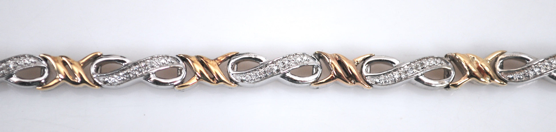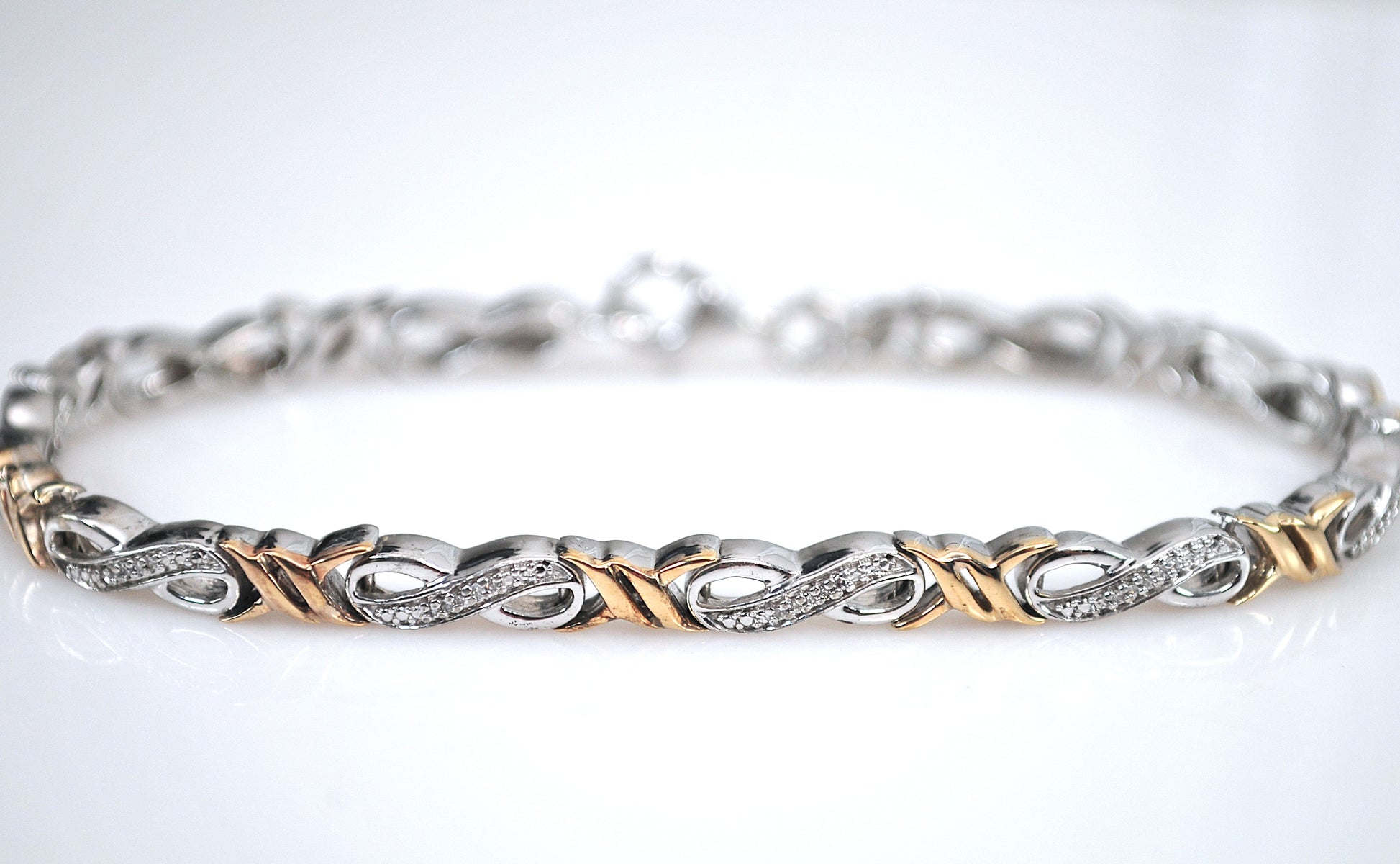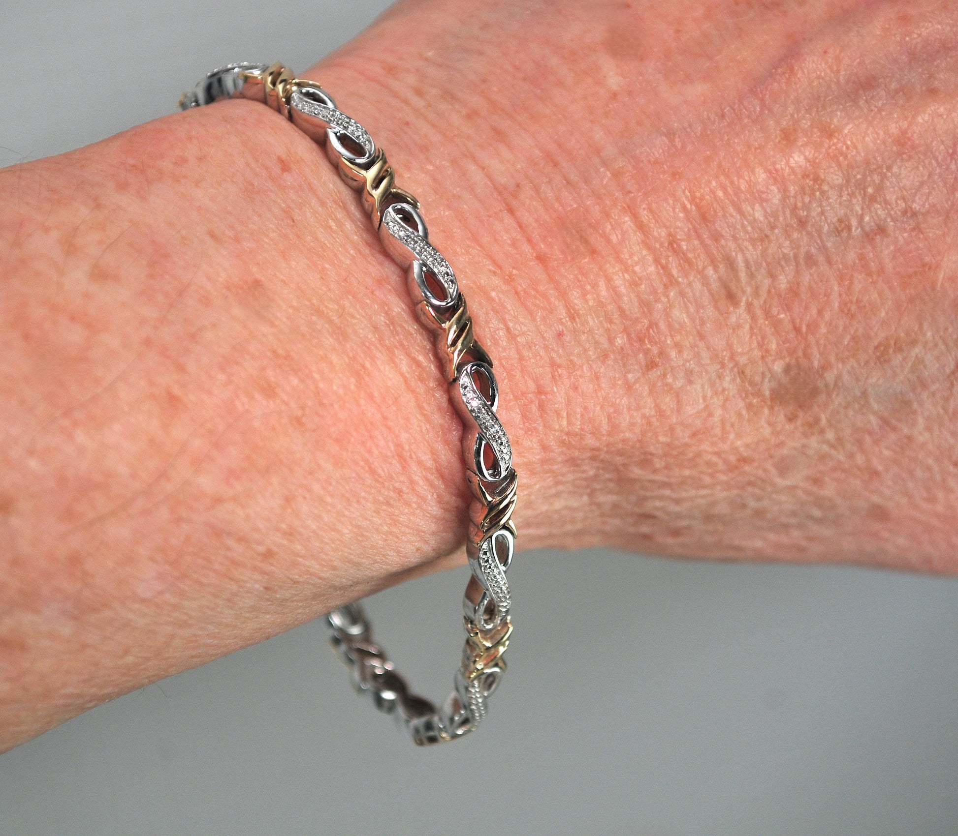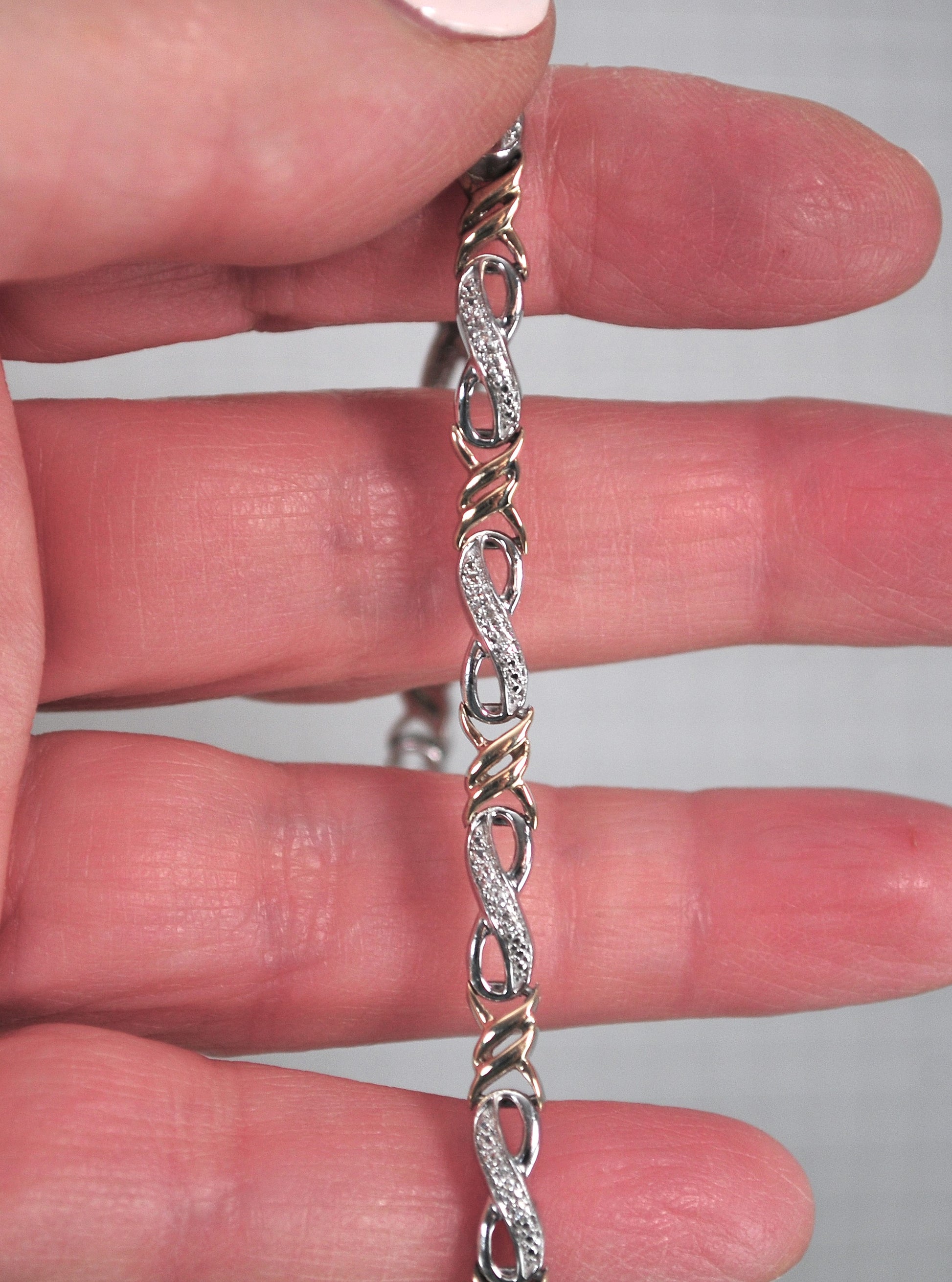 Designer mixed metal infinity link bracelet is signed 925 10K and a maker's mark and features five small genuine natural Diamonds in each link.