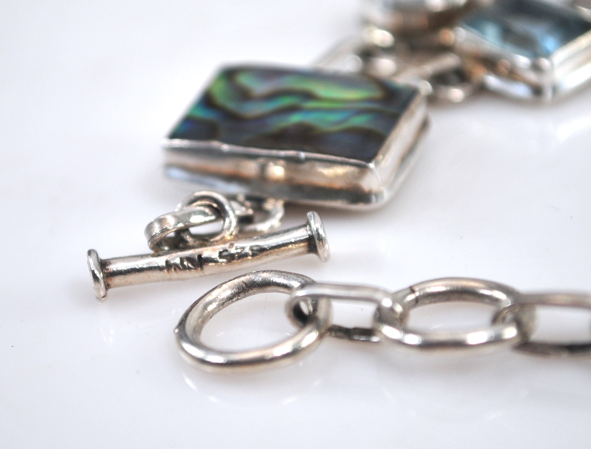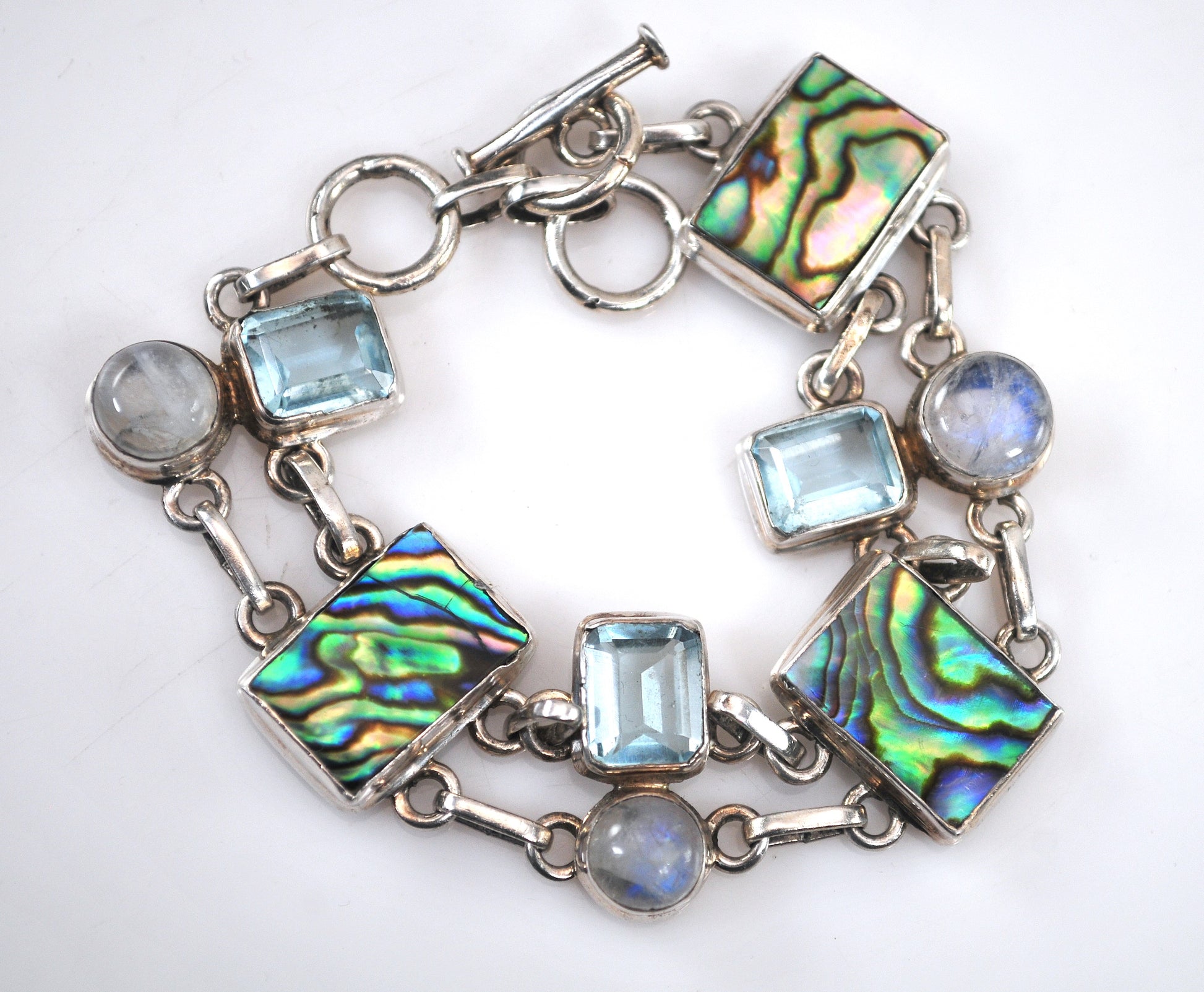 Adjustable iridescent sterling silver double link bracelet is signed NM 925 and features Abalone inlay panels alternating with round Moonstone cabochons and faceted blue stones.