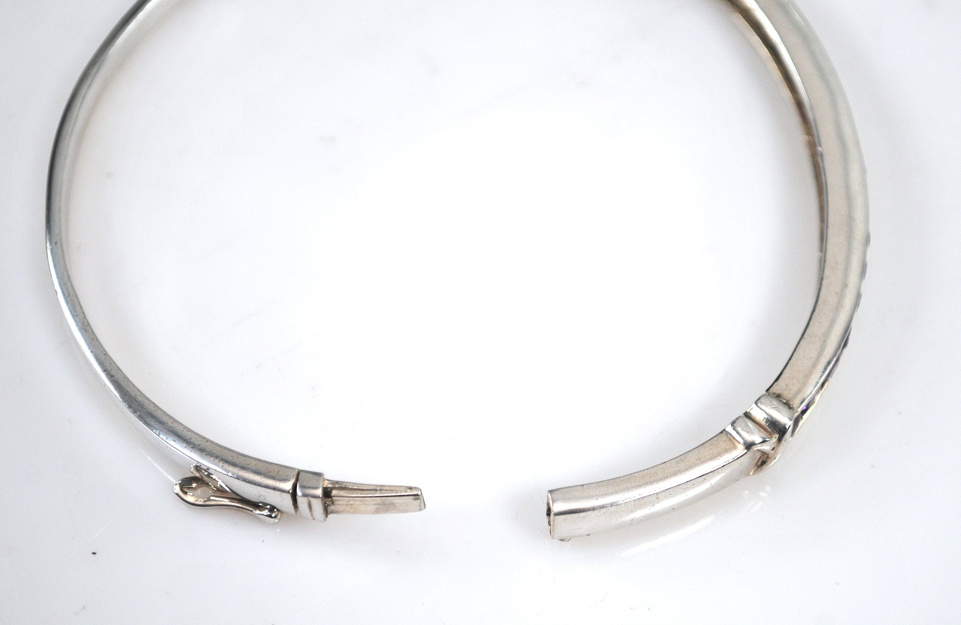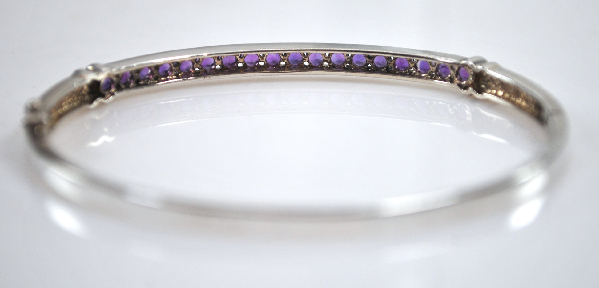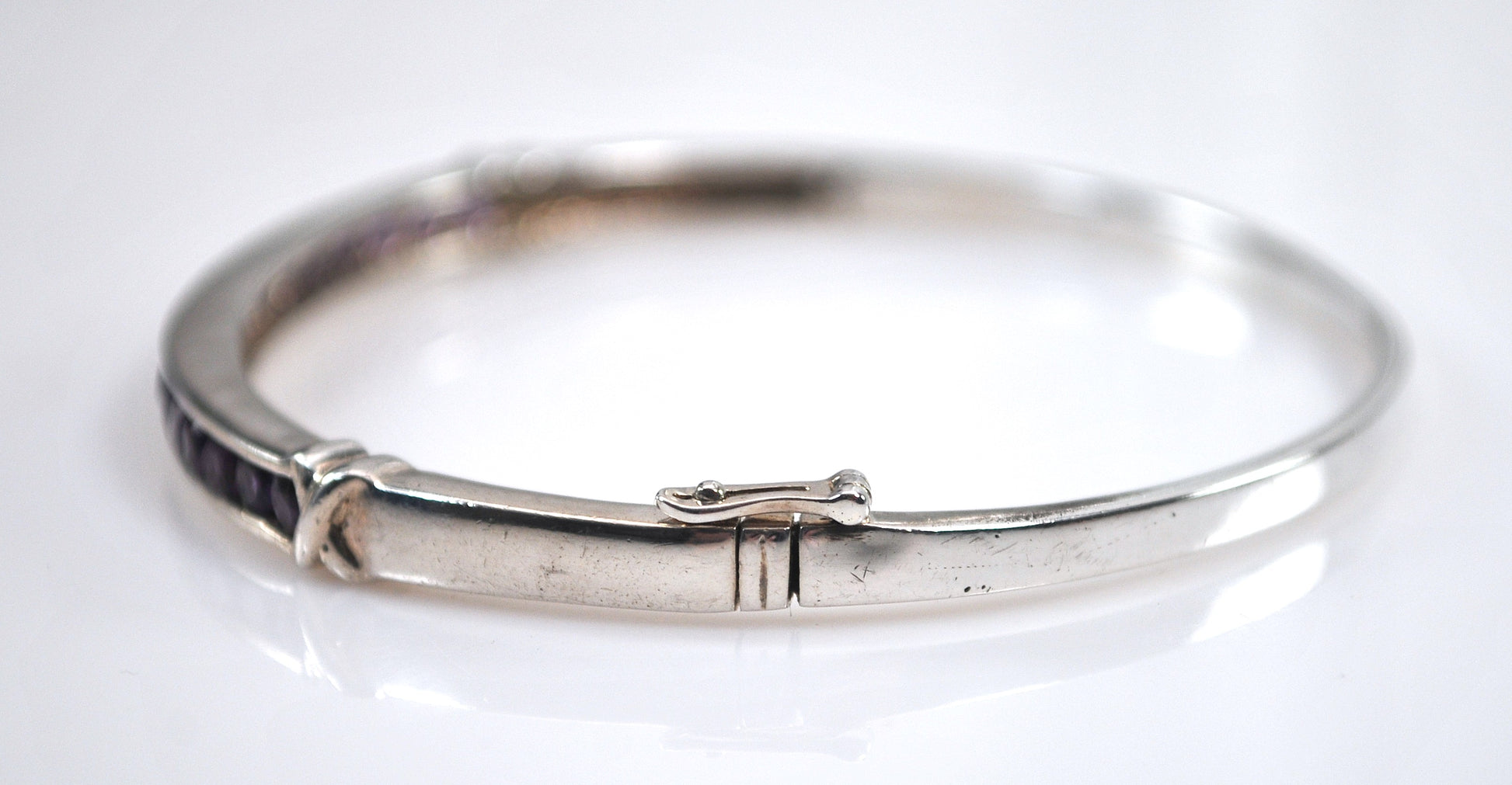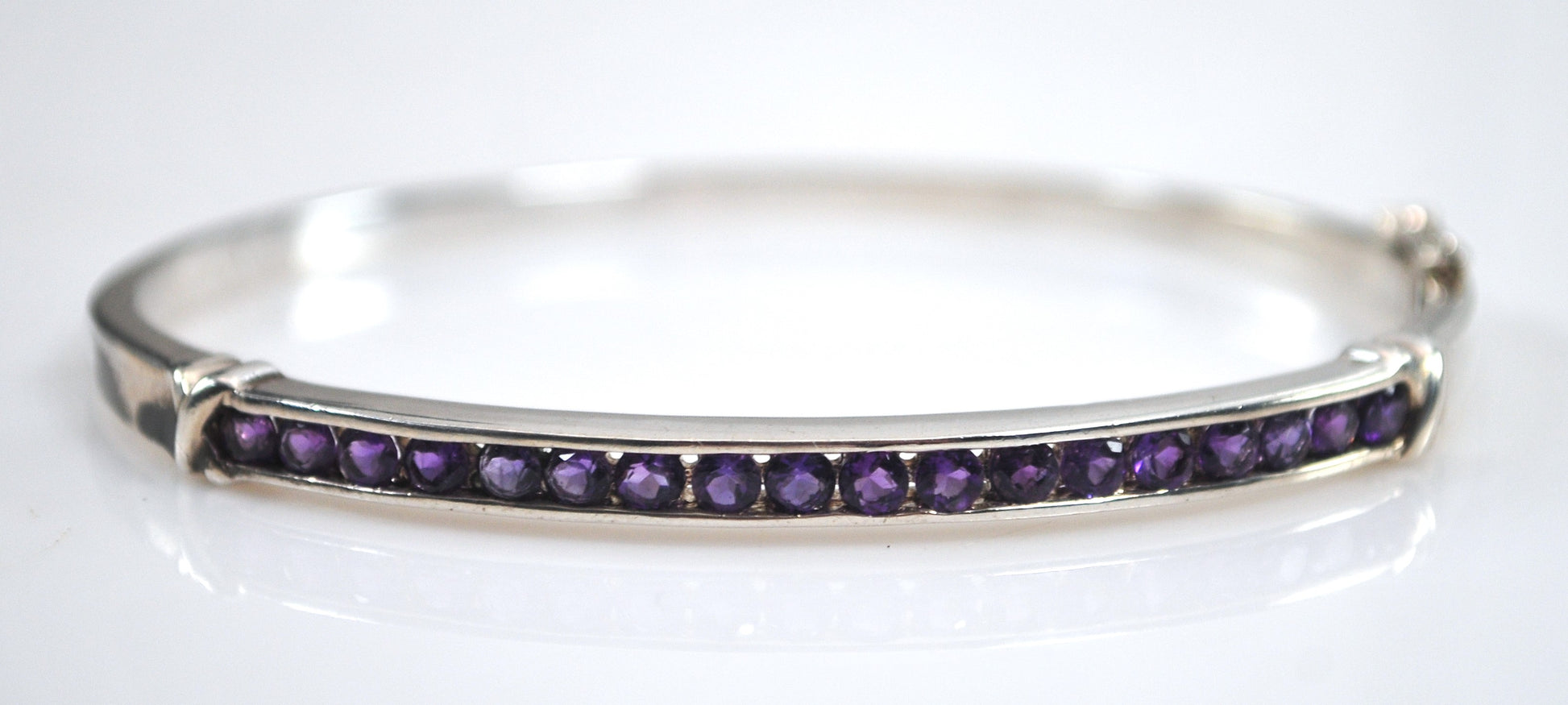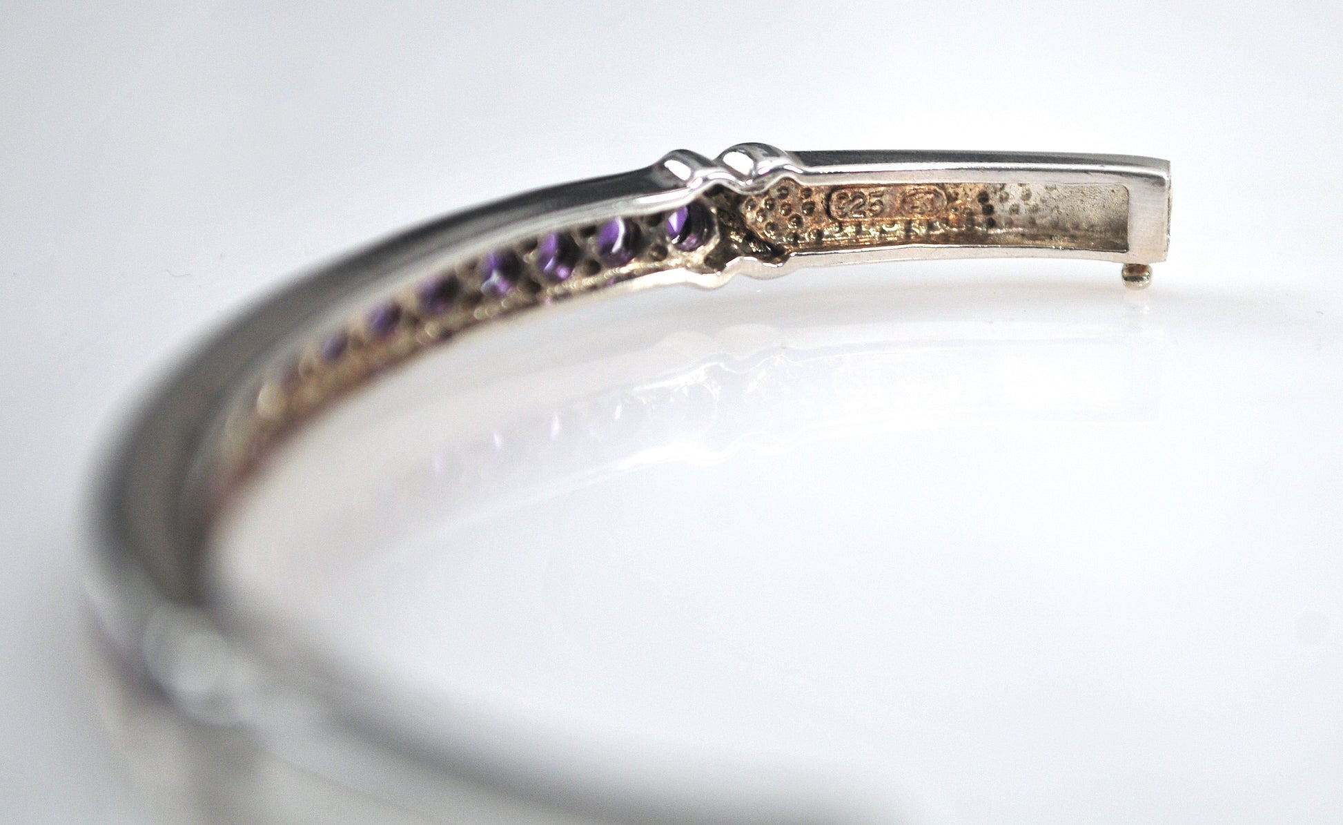 This bracelet shows wear upon close inspection but looks fine when worn. Narrow sterling silver hinged bangle bracelet is signed 925 and a maker's mark and features small channel set Amethysts.