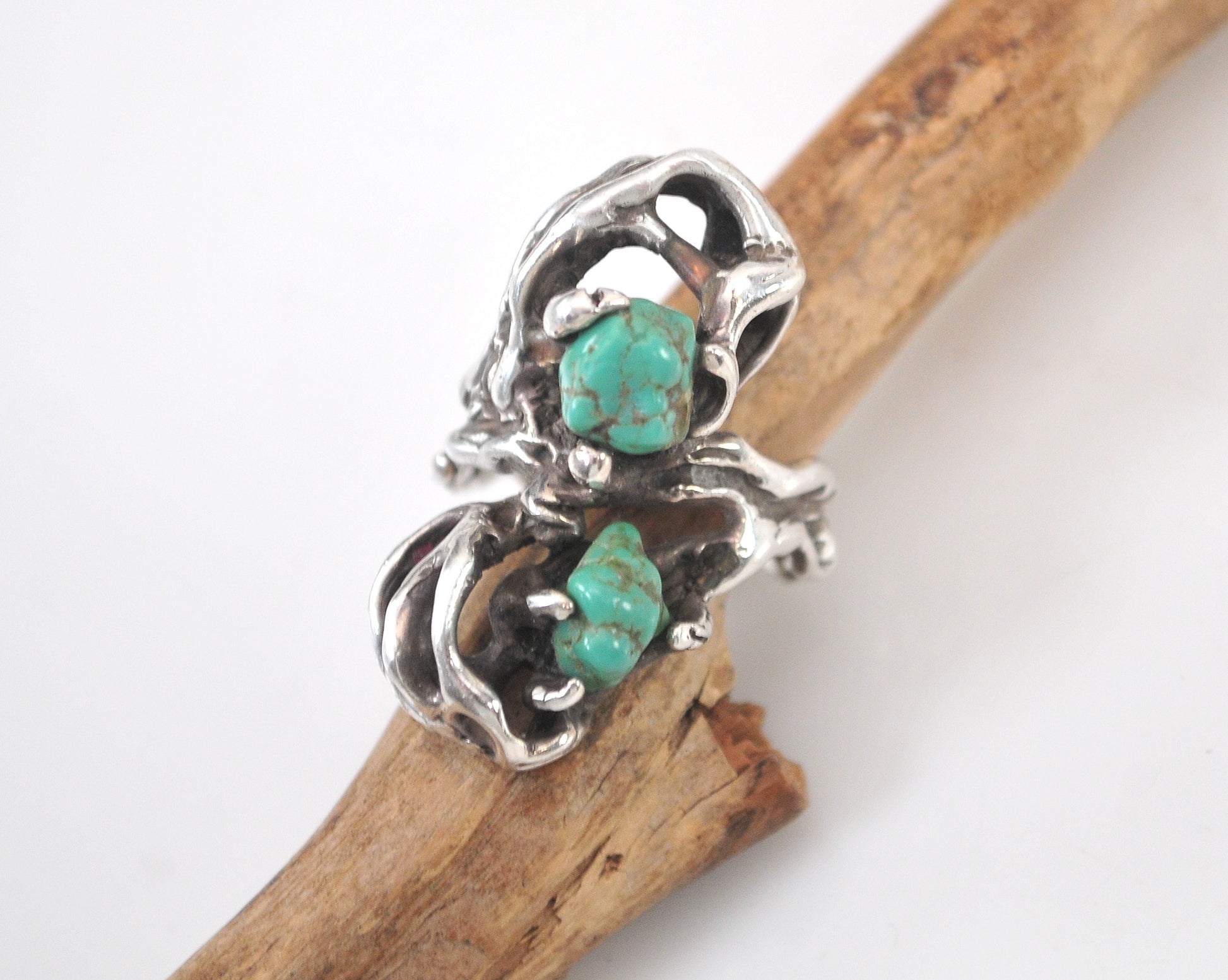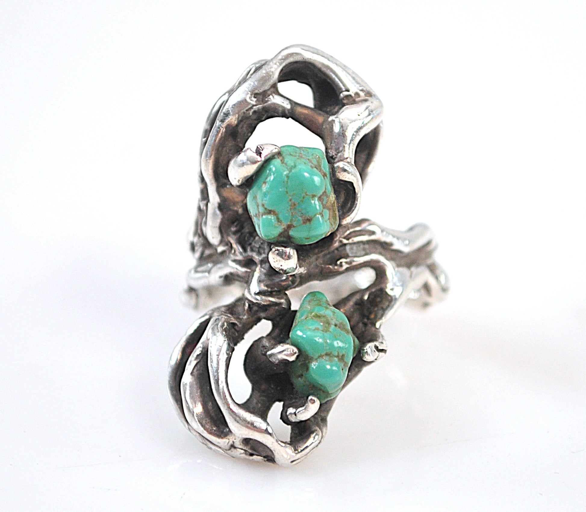 This ring is handmade and very nicely made. It is unmarked and has tested as 925 or higher purity. Southwestern double Turquoise nugget ring features a freeform Brutalist design.