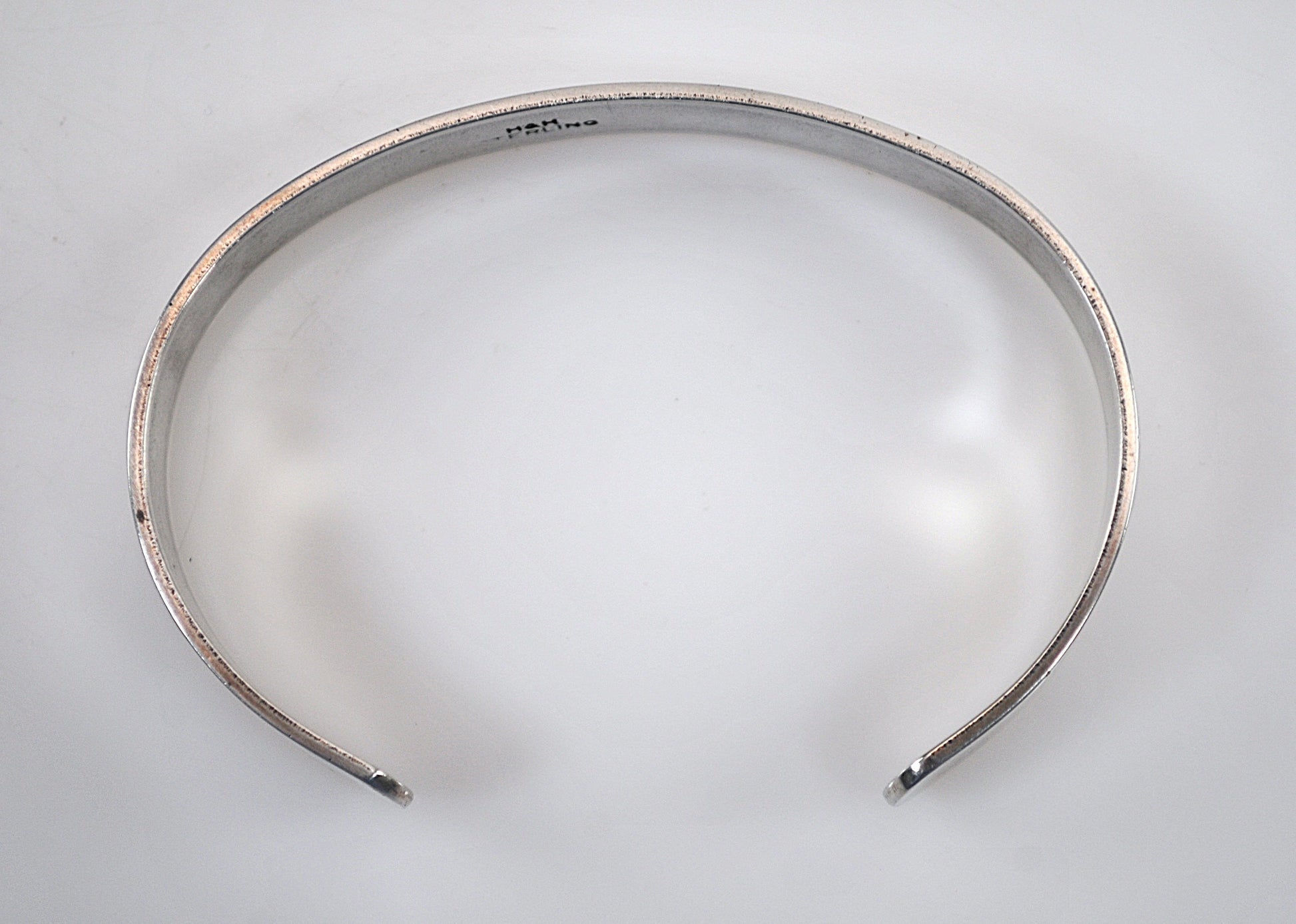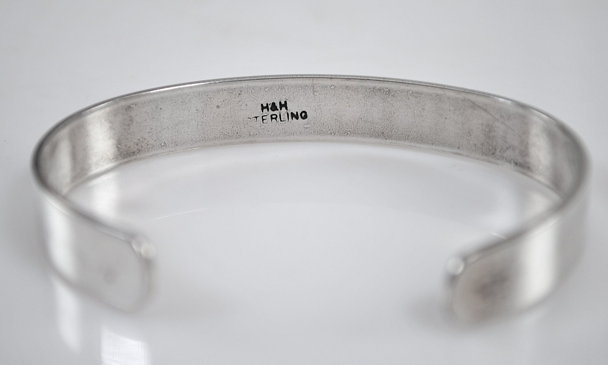 Handmade sterling silver cuff bracelet is signed H&H STERLING and is inscribed "BARN GODDESS".