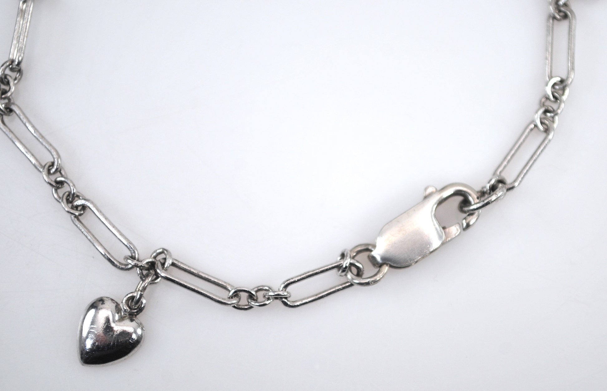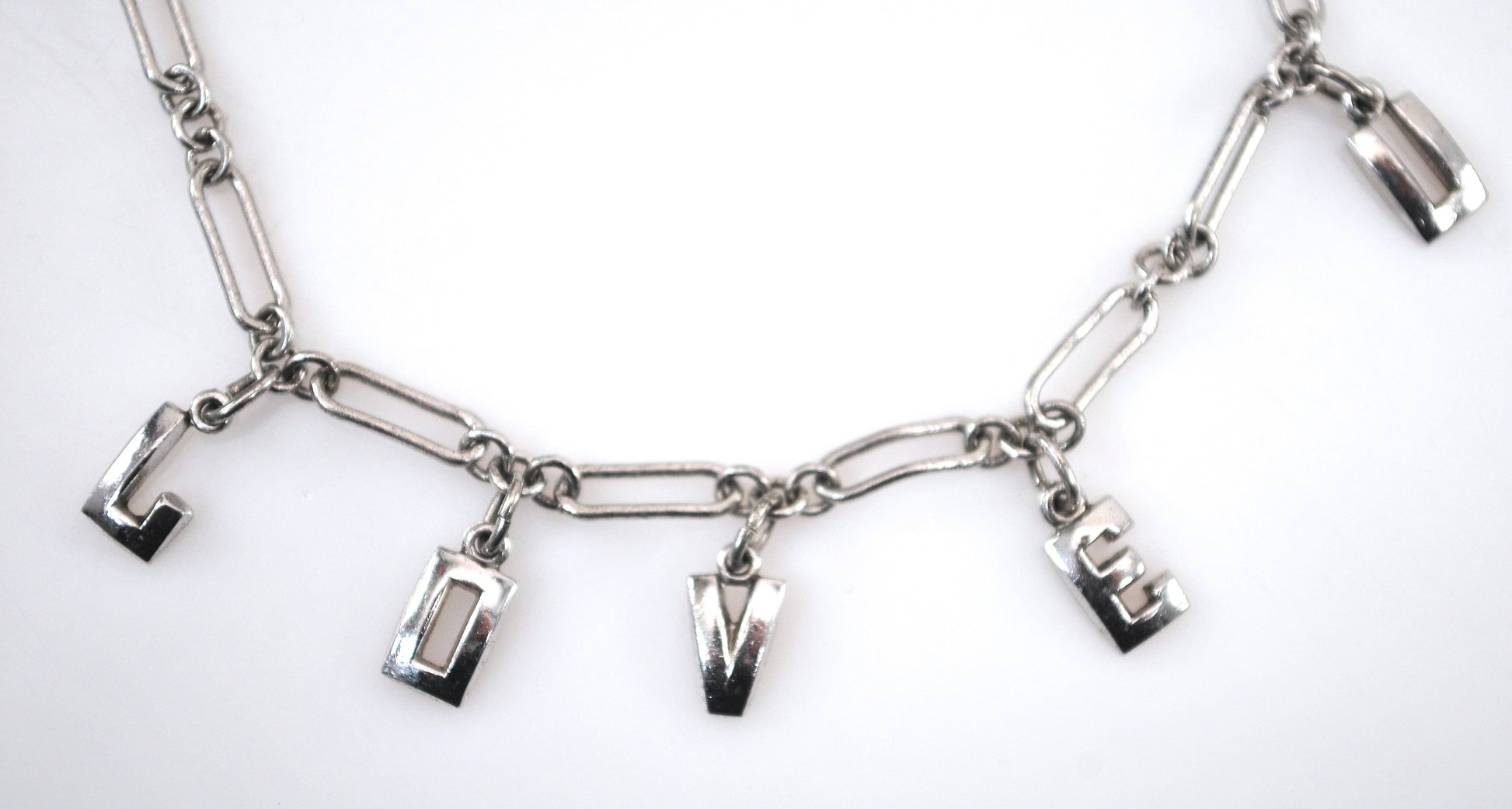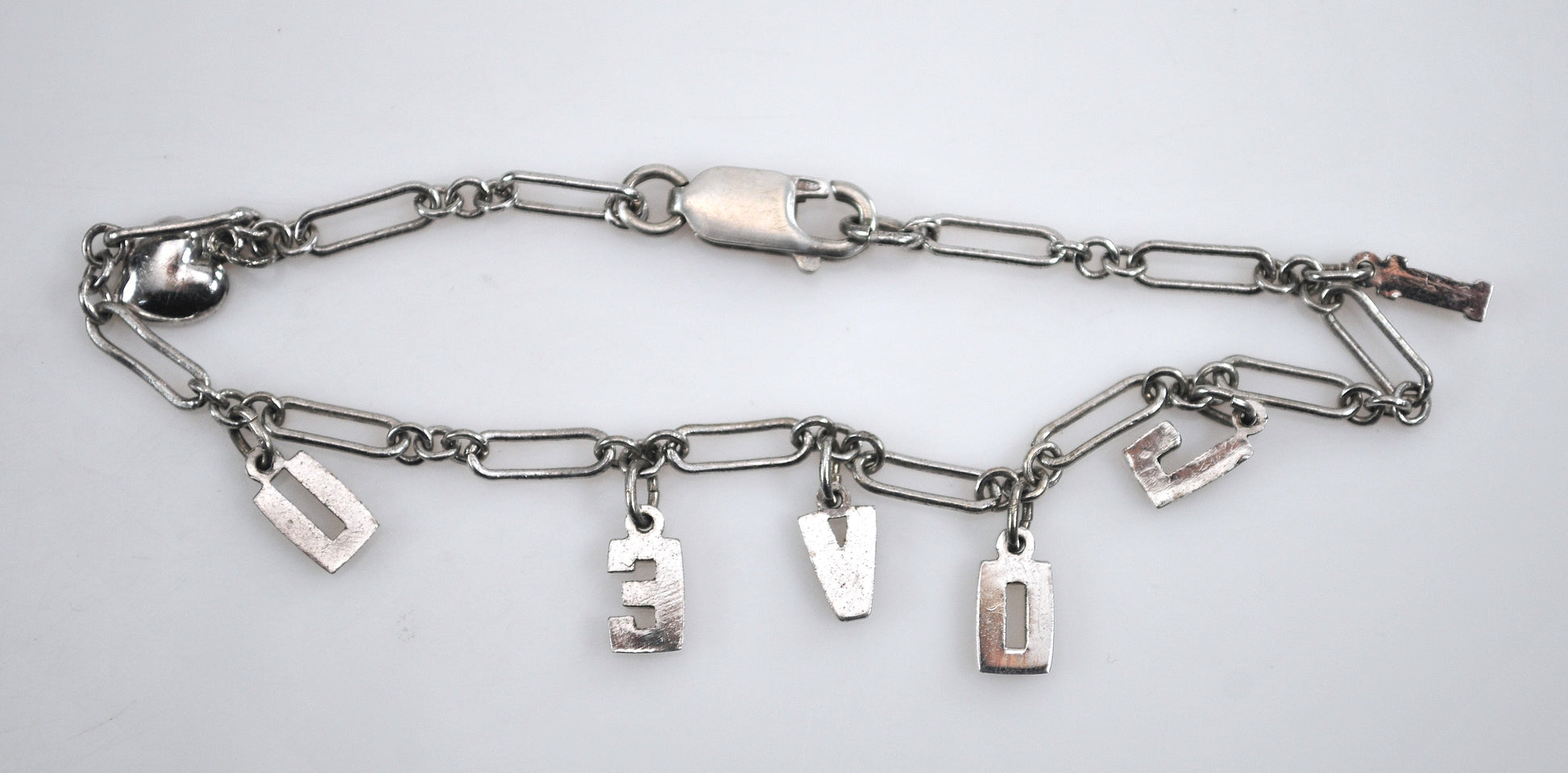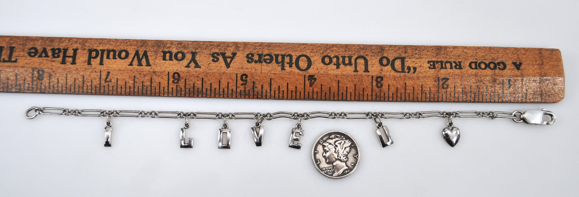 Dainty sterling silver bracelet is marked 925 on the clasp and has been tested as sterling silver, and features letter charms spelling out "I LOVE U" and a heart charm.