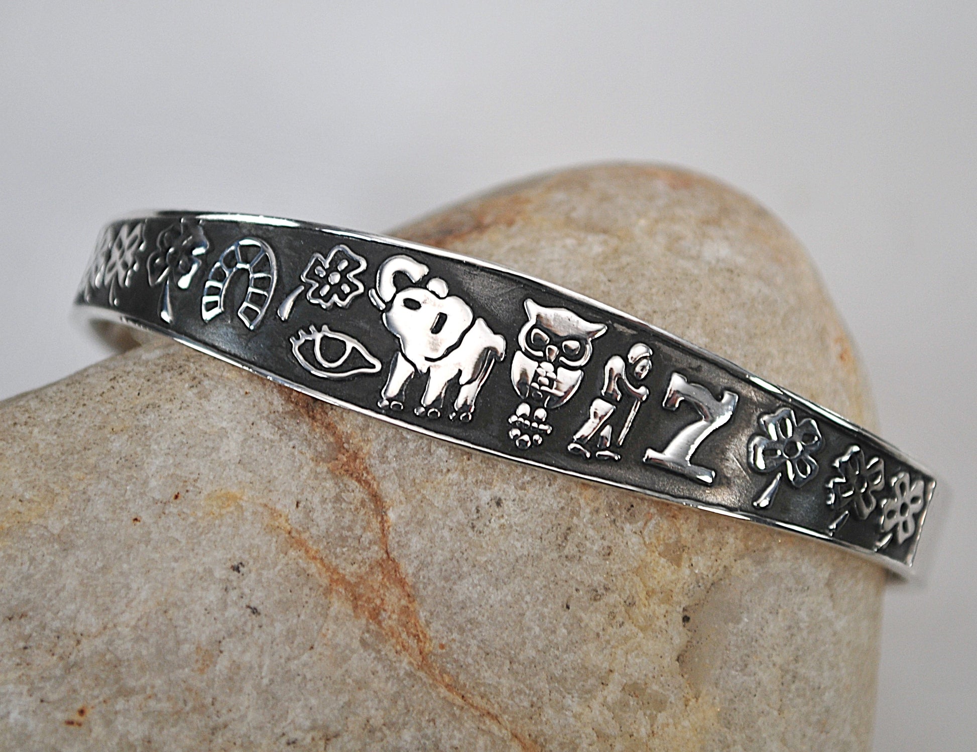 This bracelet is slightly misshapen from previous wear and can only be adjusted larger, not smaller. Vintage sterling silver good luck cuff bracelet is marked 925 Mexico and features lucky images of 4 leaf clovers, a horseshoe, an evil eye, an elephant, an owl, number 7 and a walking man of which I don't know the significance.
