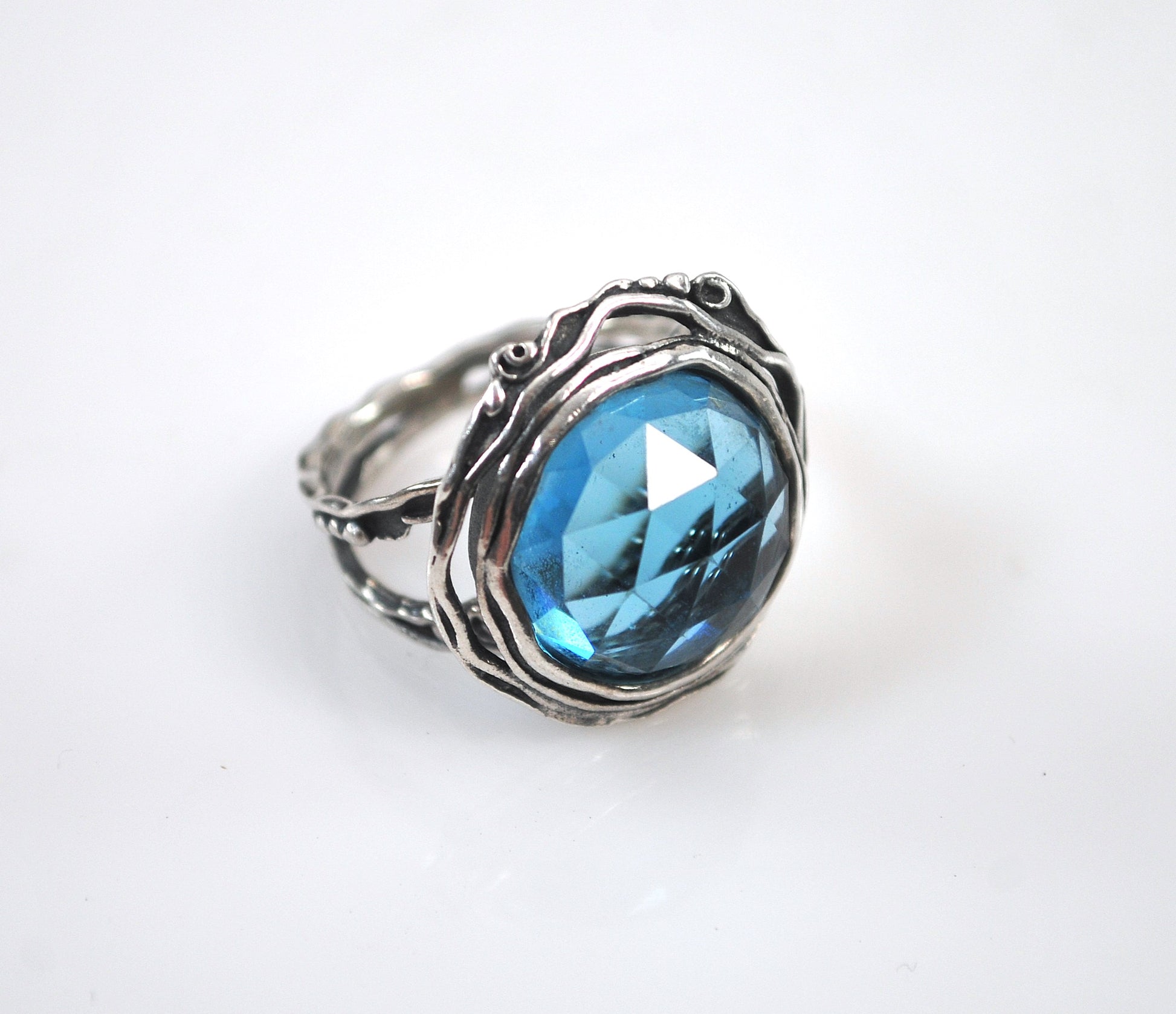 Vintage sterling silver vine design ring is marked 925 and features an approximately 13mm faceted blue stone that I believe is glass.
