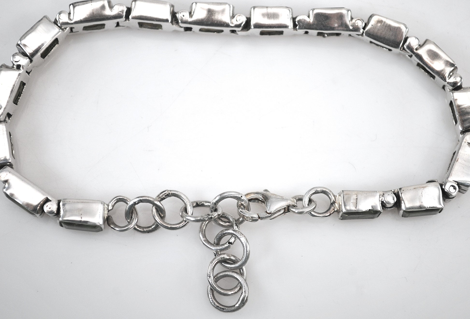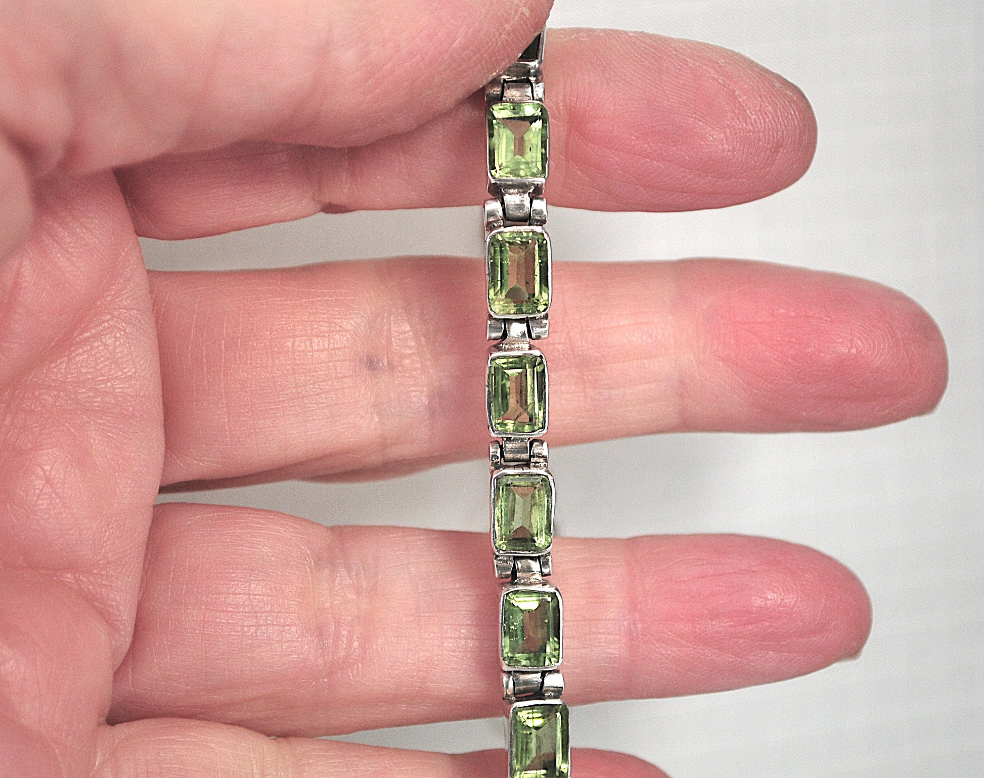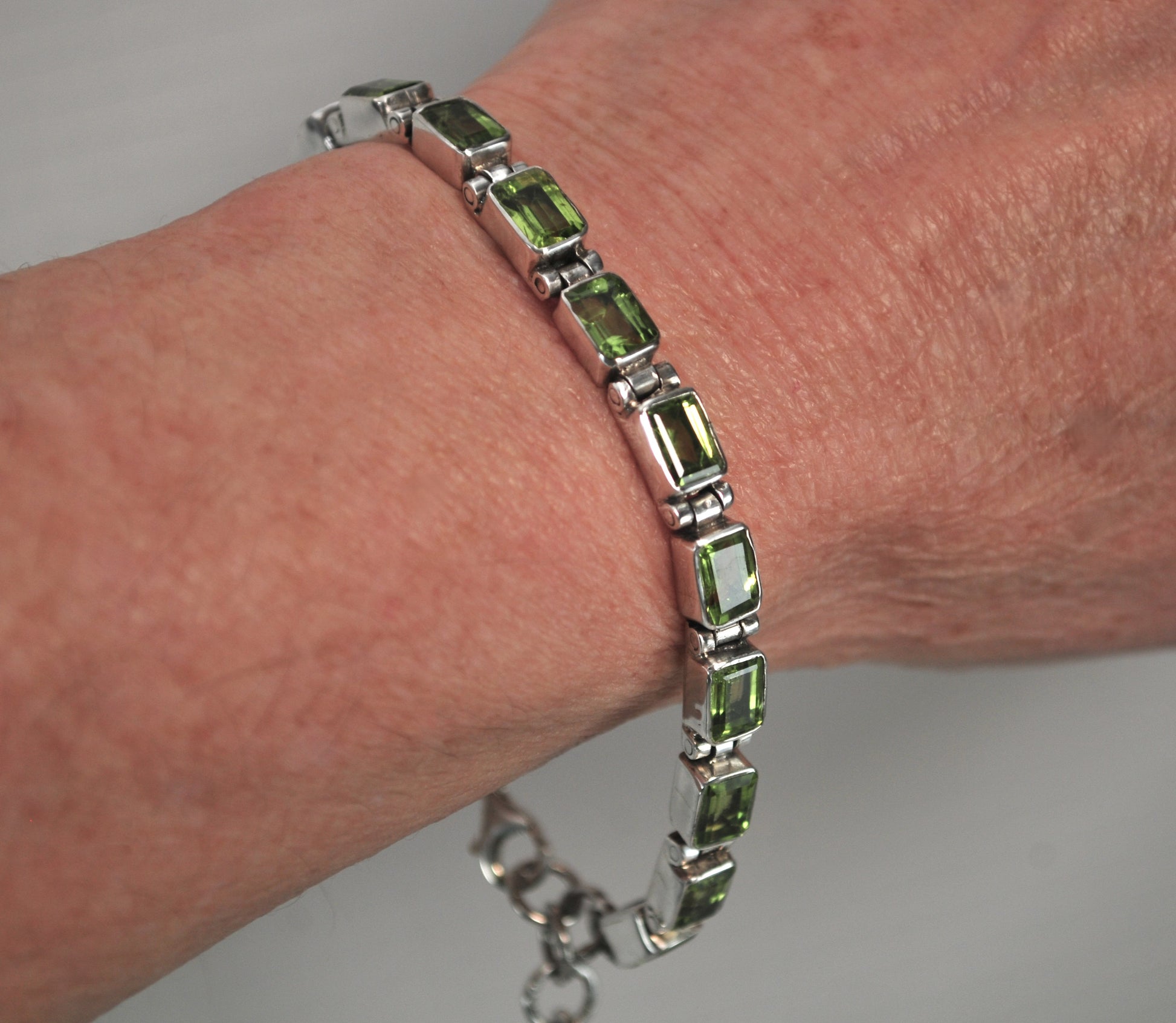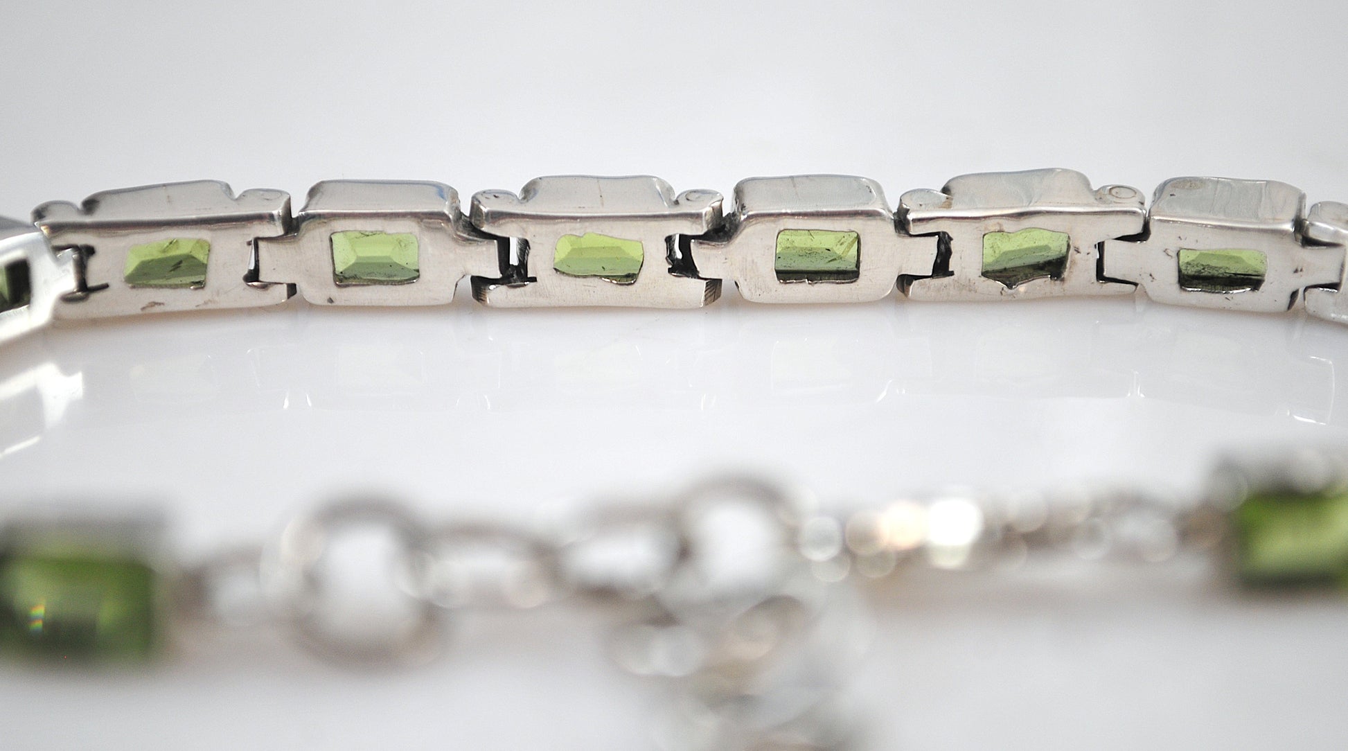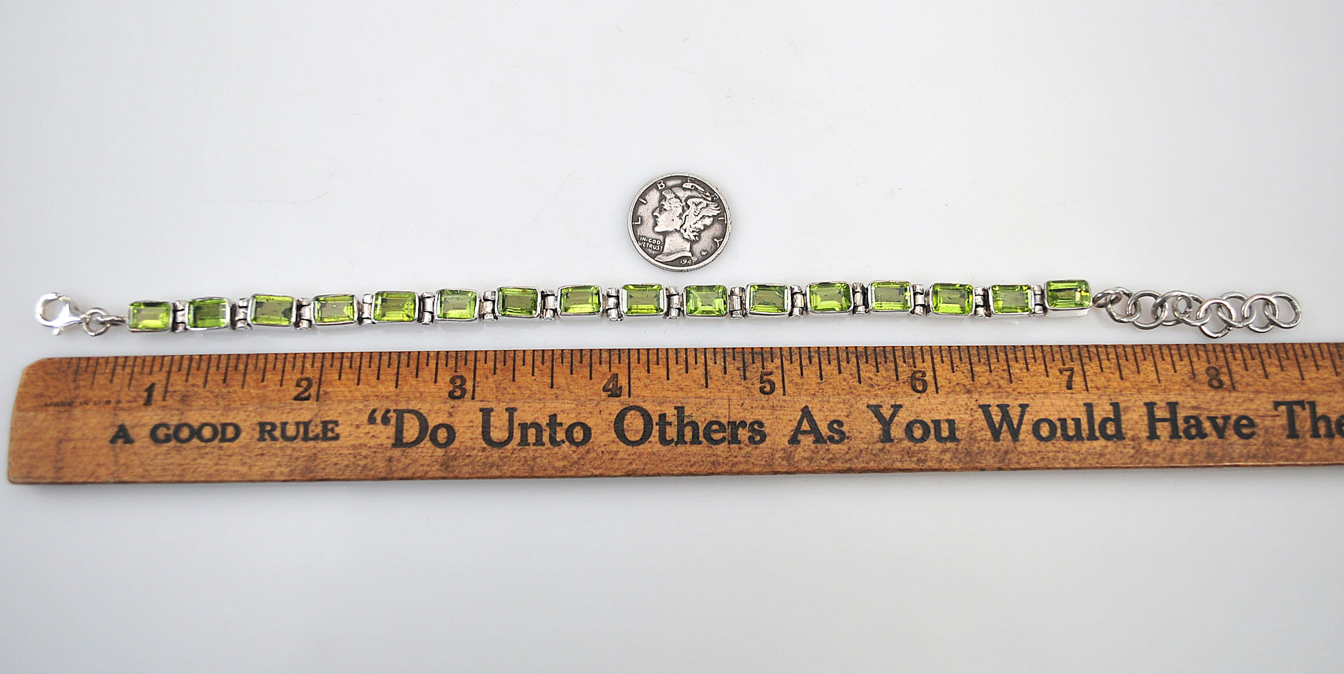 Sterling silver Peridot bracelet is marked 925 and features approximately 7x5.5mm rectangle stones and offers adjustable lengths.