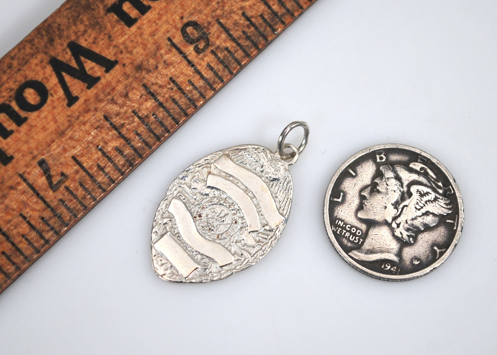 Sterling silver police badge charm or pendant is unmarked and has been tested as sterling silver. It is new old stock so it is unworn and unused and I have others.