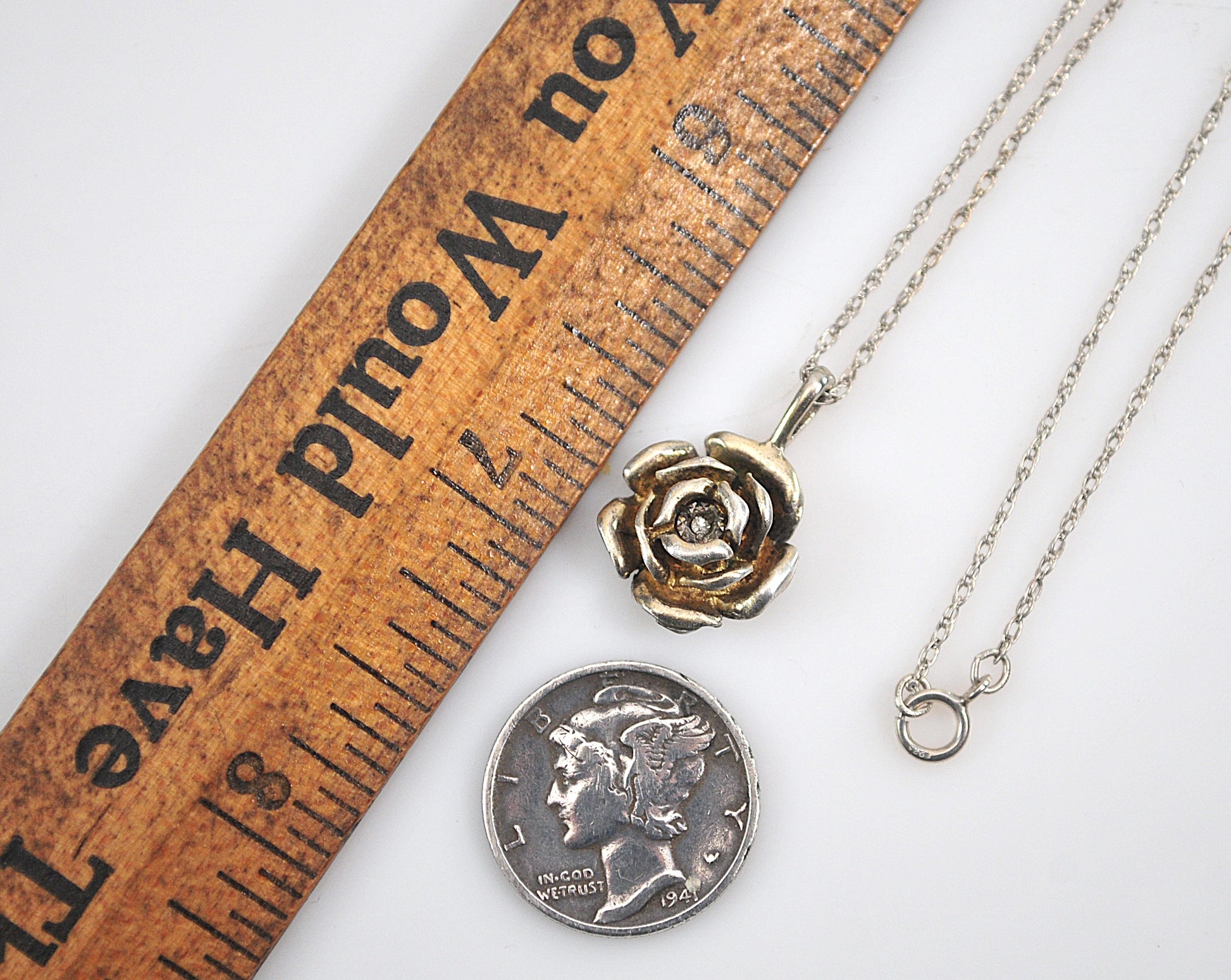 Vintage sterling silver flower pendant is signed AVON Sterling and features a tiny Diamond in a miracle setting. I'm not sure if the pendant has a gold wash on the inside of the petals or if it is just tarnish.