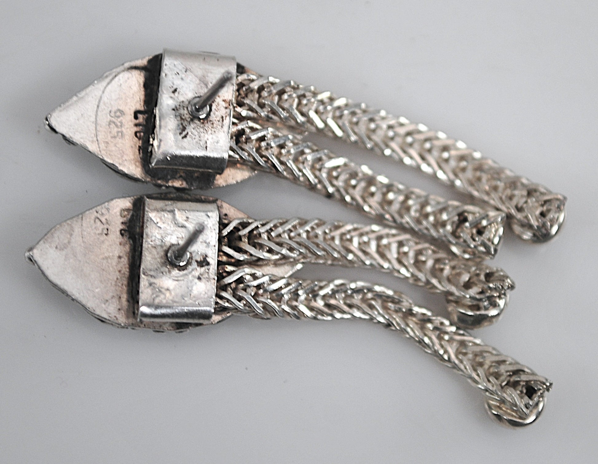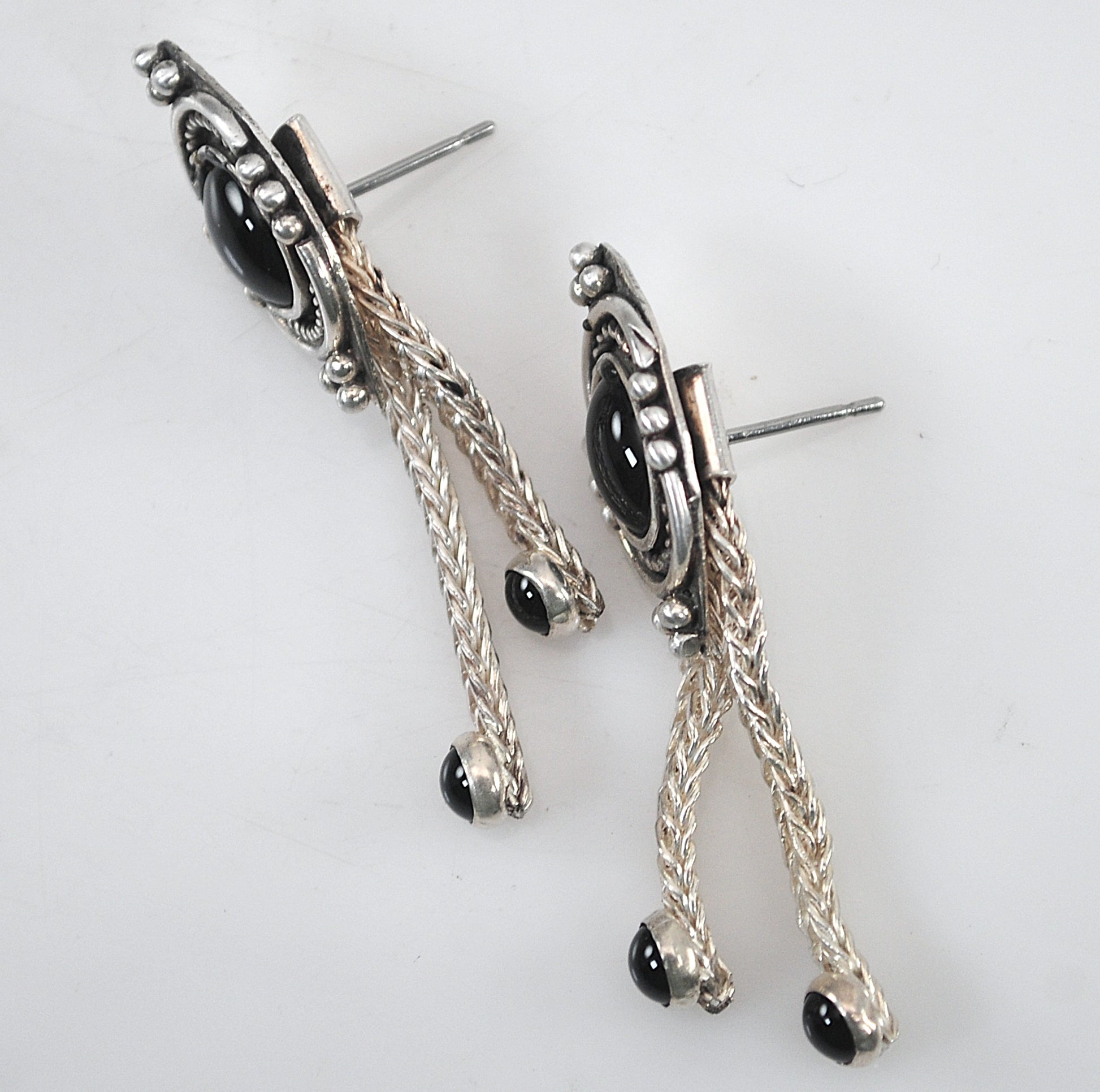 Exotic Black Onyx sterling silver foxtail chain earrings are signed 925 and a maker's mark I cannot read. They come with silicone backs.