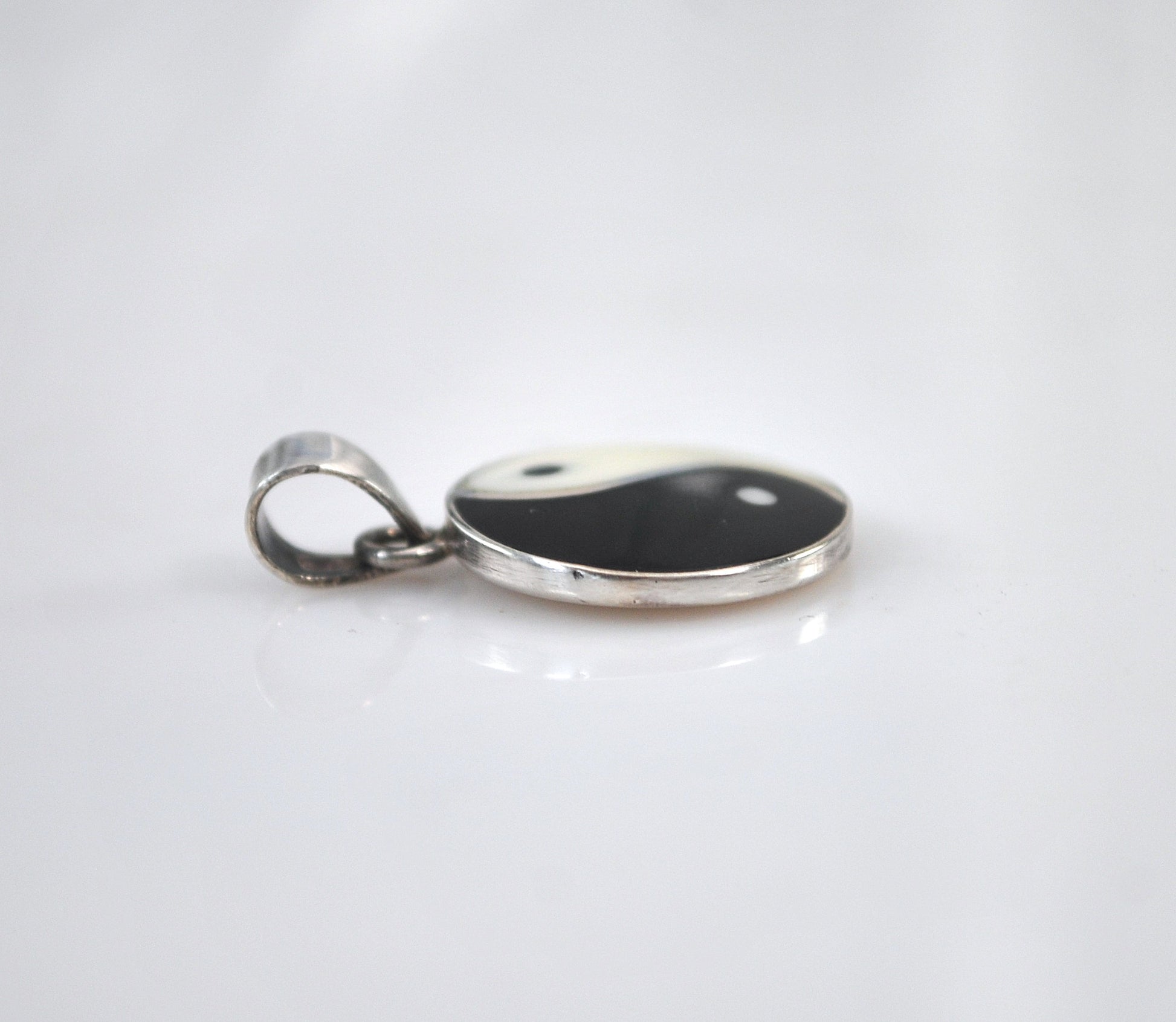 Round sterling silver and black and white enamel Yin Yang pendant is marked 925.