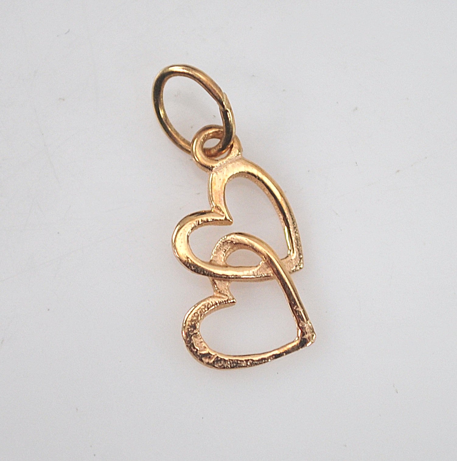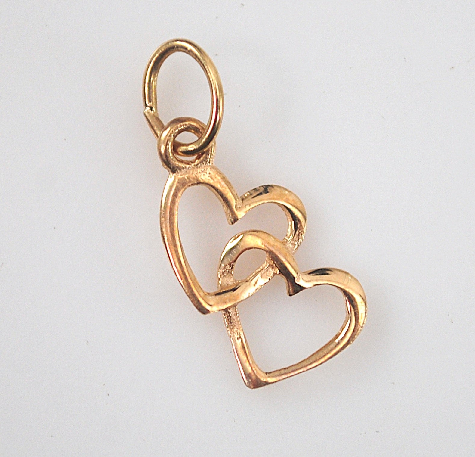 SMALL 14K yellow gold twin open heart pendant is signed 14K and a maker's mark.