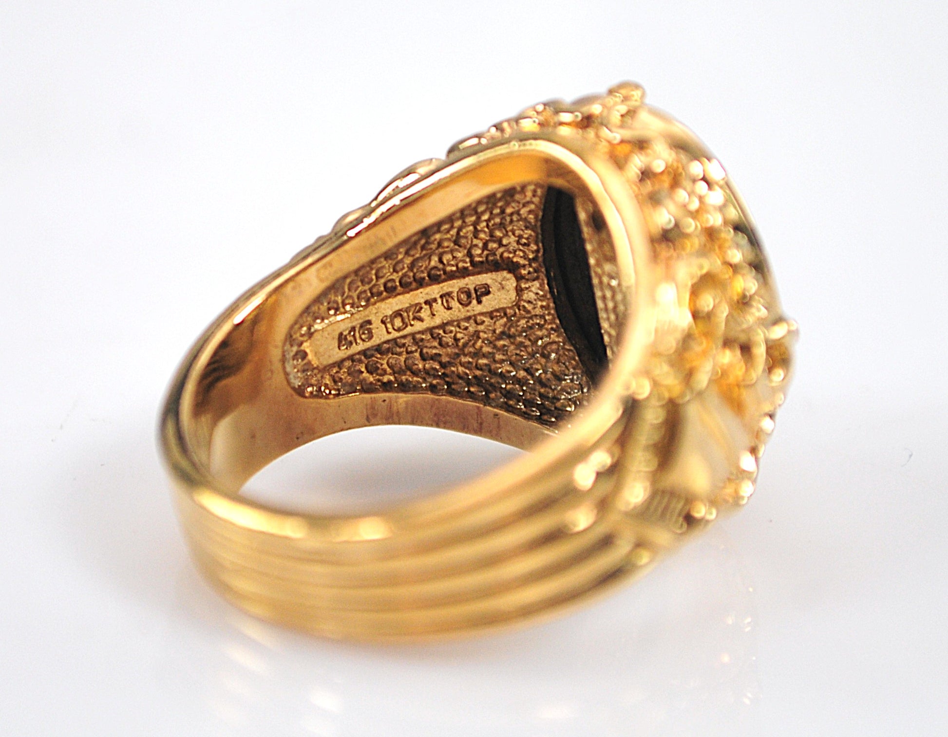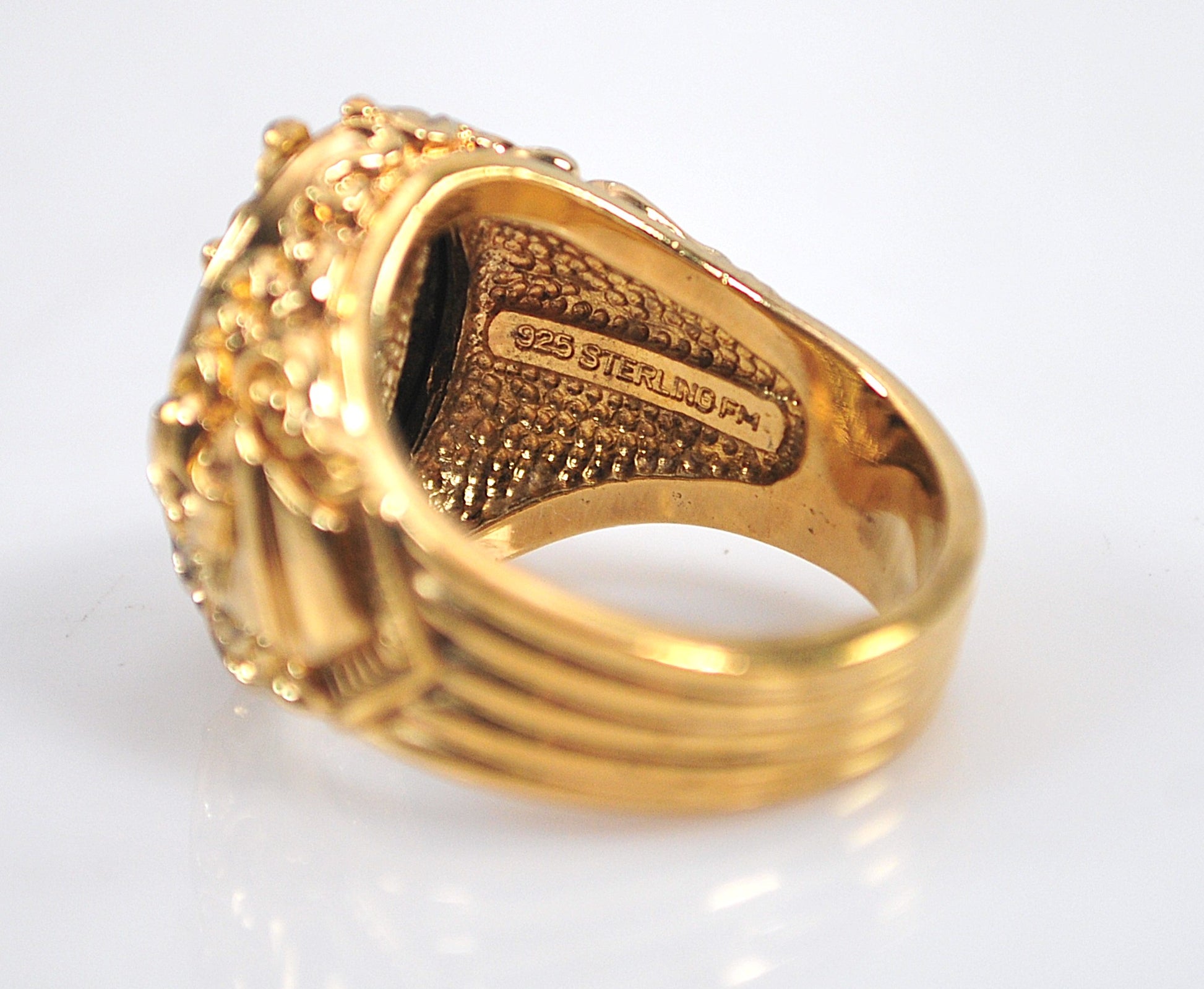 Chunky gold plated sterling silver Franklin Mint excalibur statement ring is signed 925 STERLING FM 416 10K top, and features an applied 10K gold image of a sword in a stone on a Black Onyx base with a small Diamond.