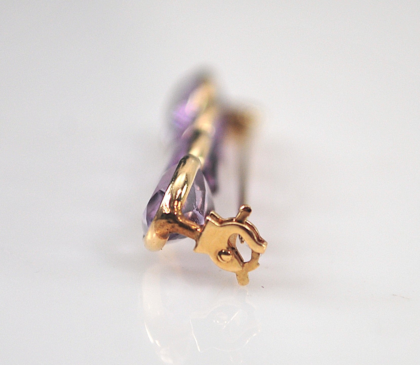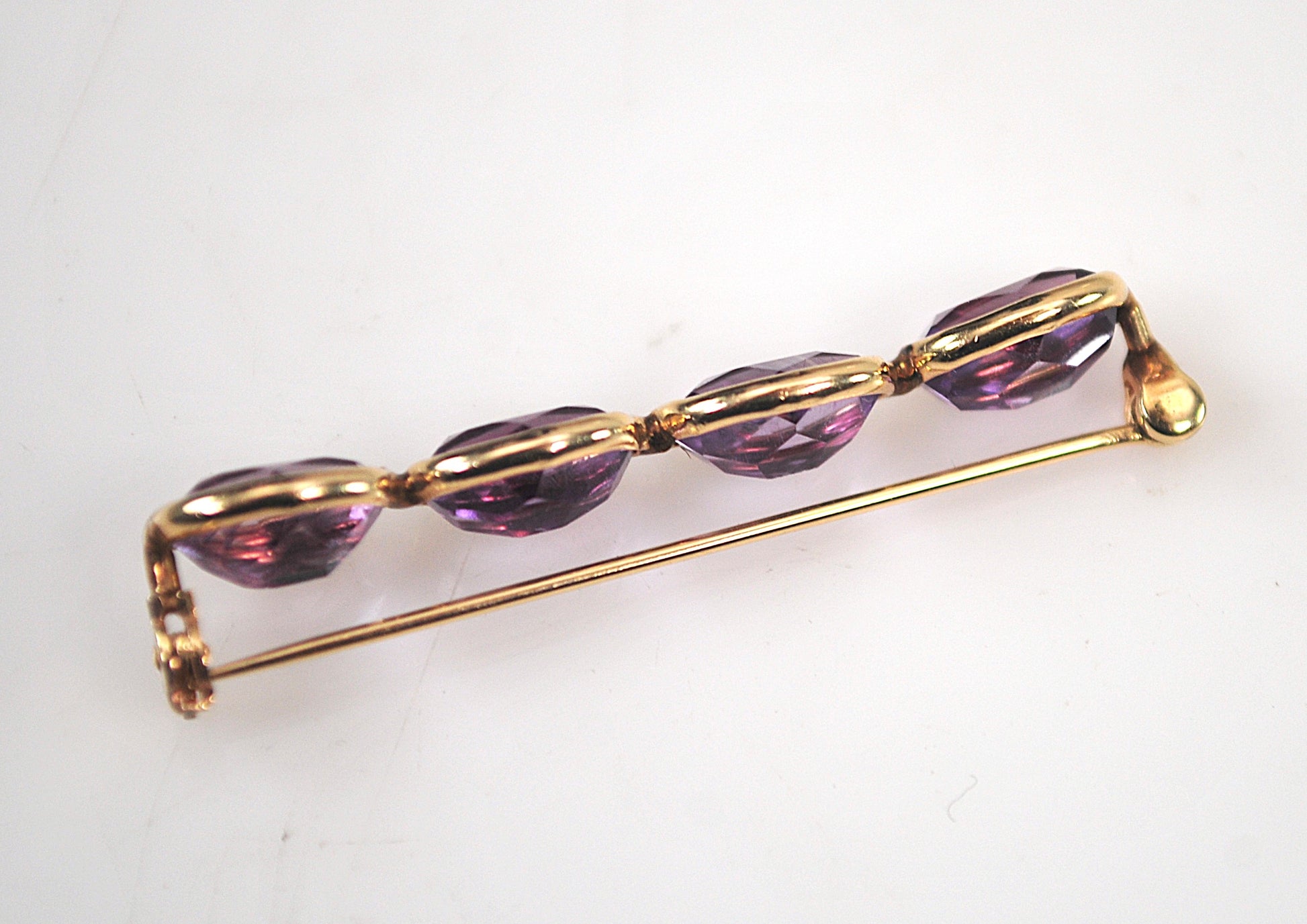 14K yellow gold brooch is unmarked and tests as 14K gold, and features four oval approximately 7.5x6mm faceted Amethysts.