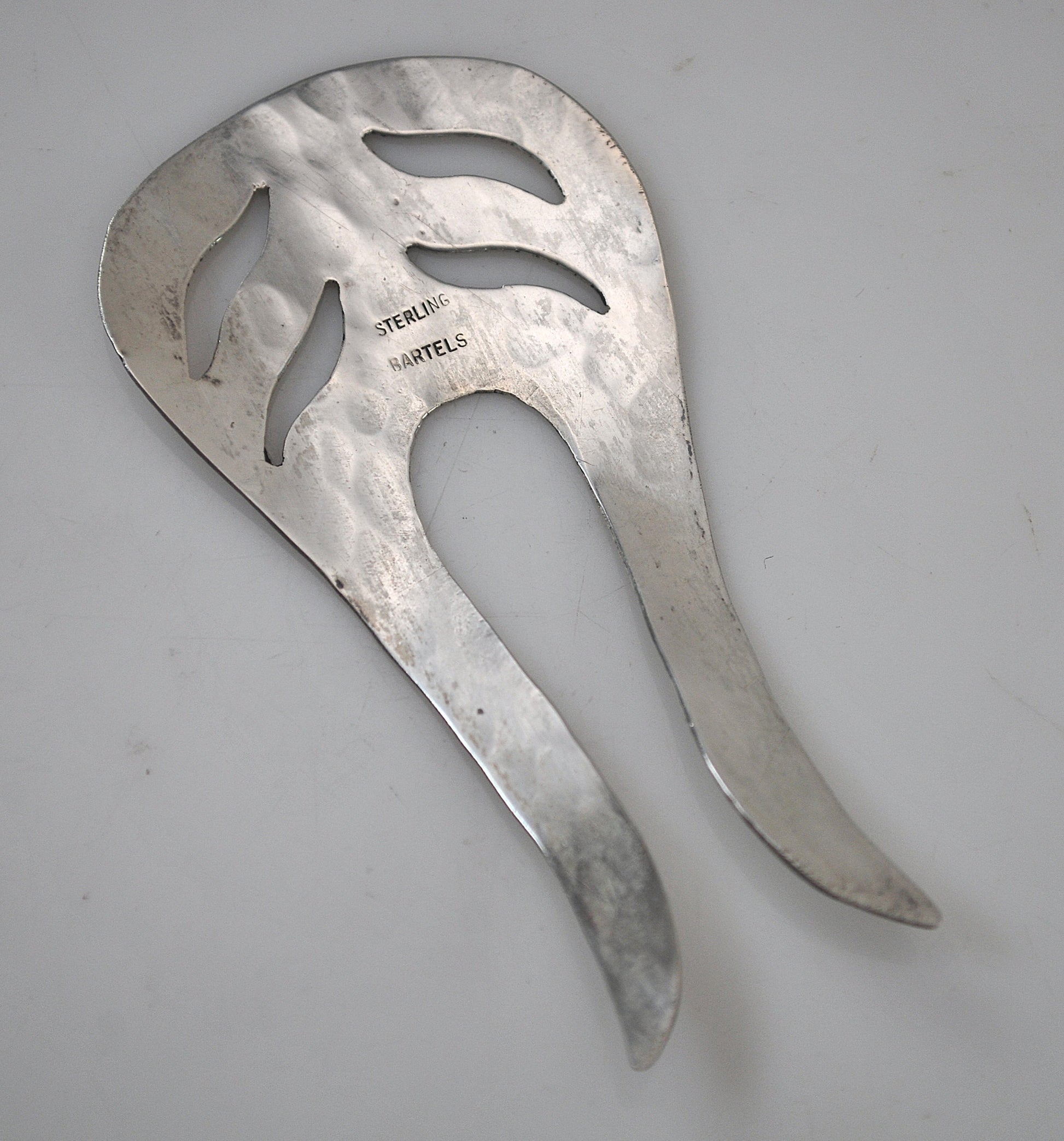 Vintage handmade sterling silver hair pin is signed Sterling Bartels and features a hammered finish.