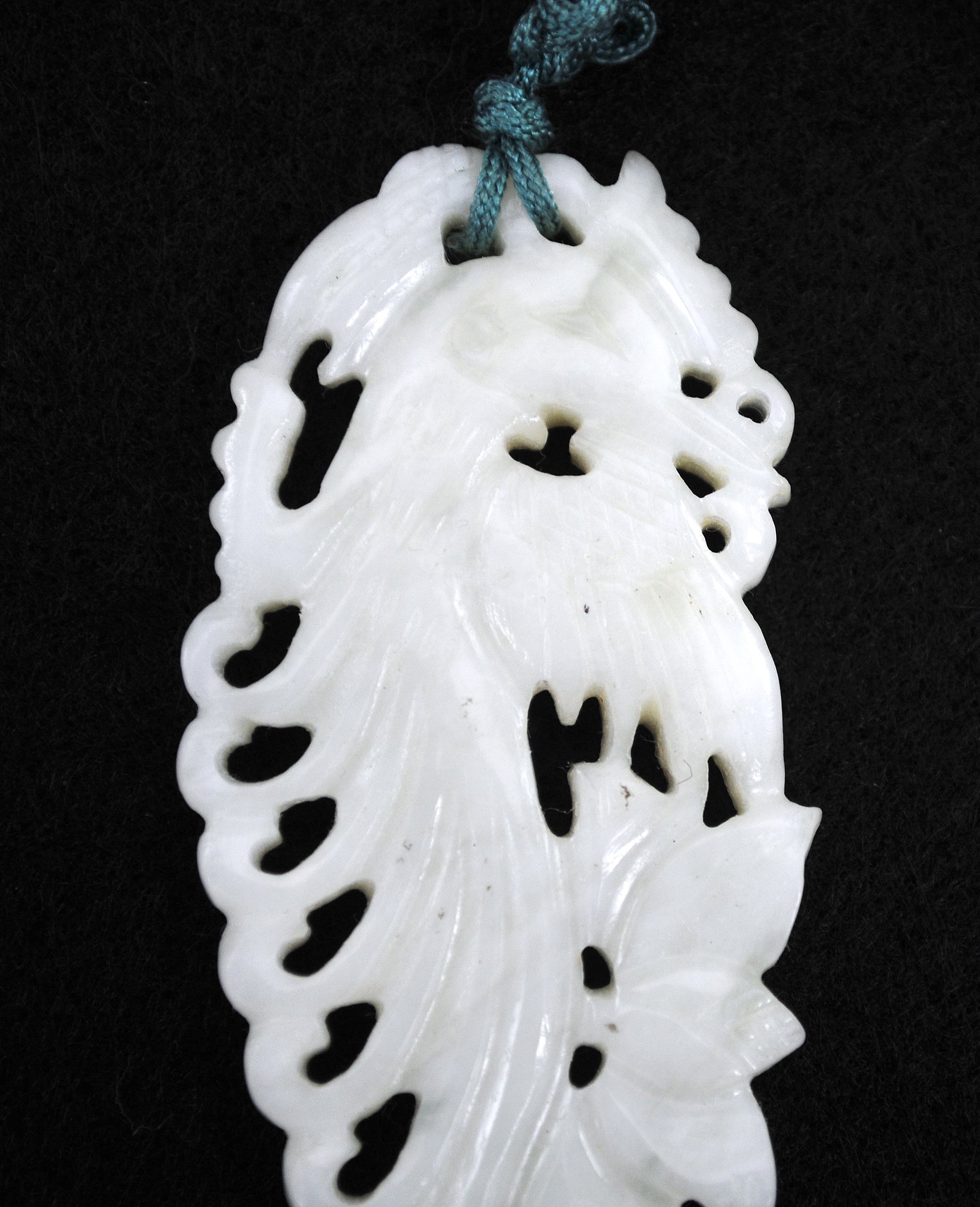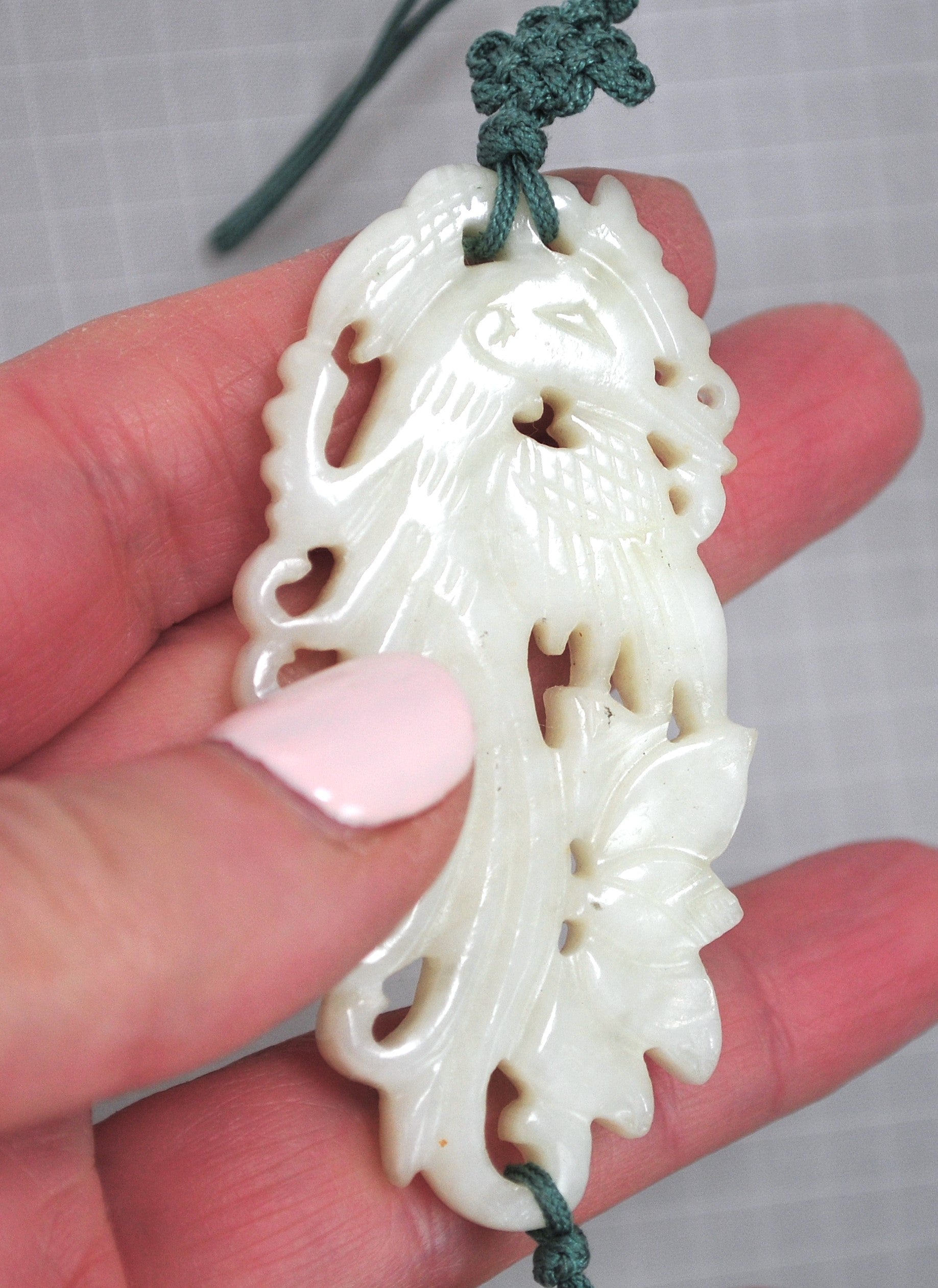 This was very difficult to photograph so refer to the video for a better view. As can be seen, this is new old stock so it is unused and unworn. Chinese carved Jadeite bird, a Phoenix I believe, with green silk double tassels.