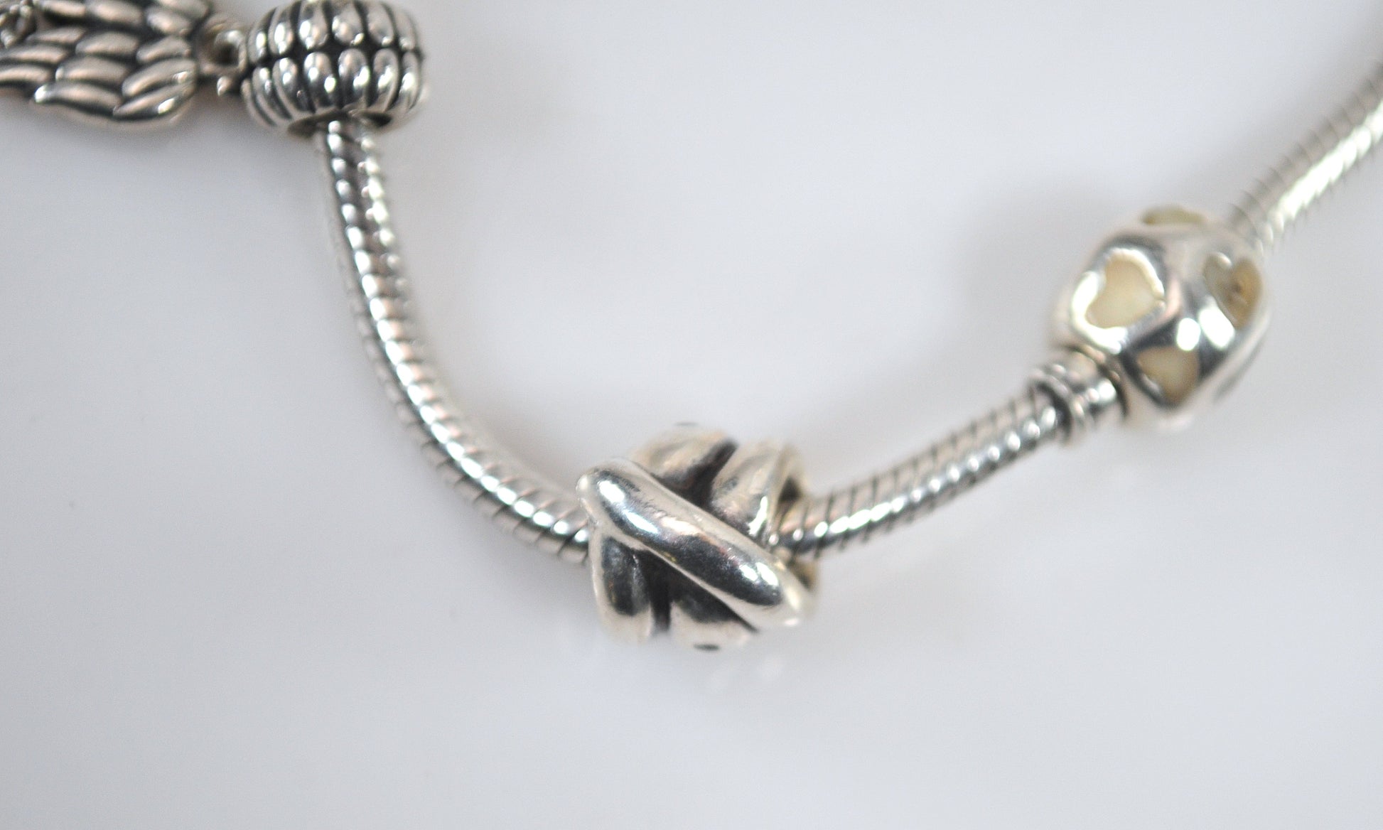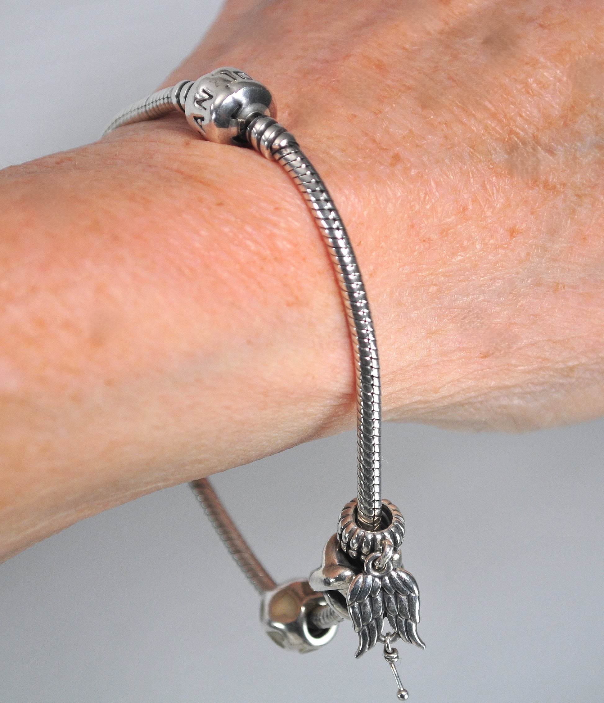 Authentic Pandora sterling silver 3mm snake chain starter charm bracelet is fully hallmarked and includes three charms. The angel wing charm had a Pearl dangle which is now missing.