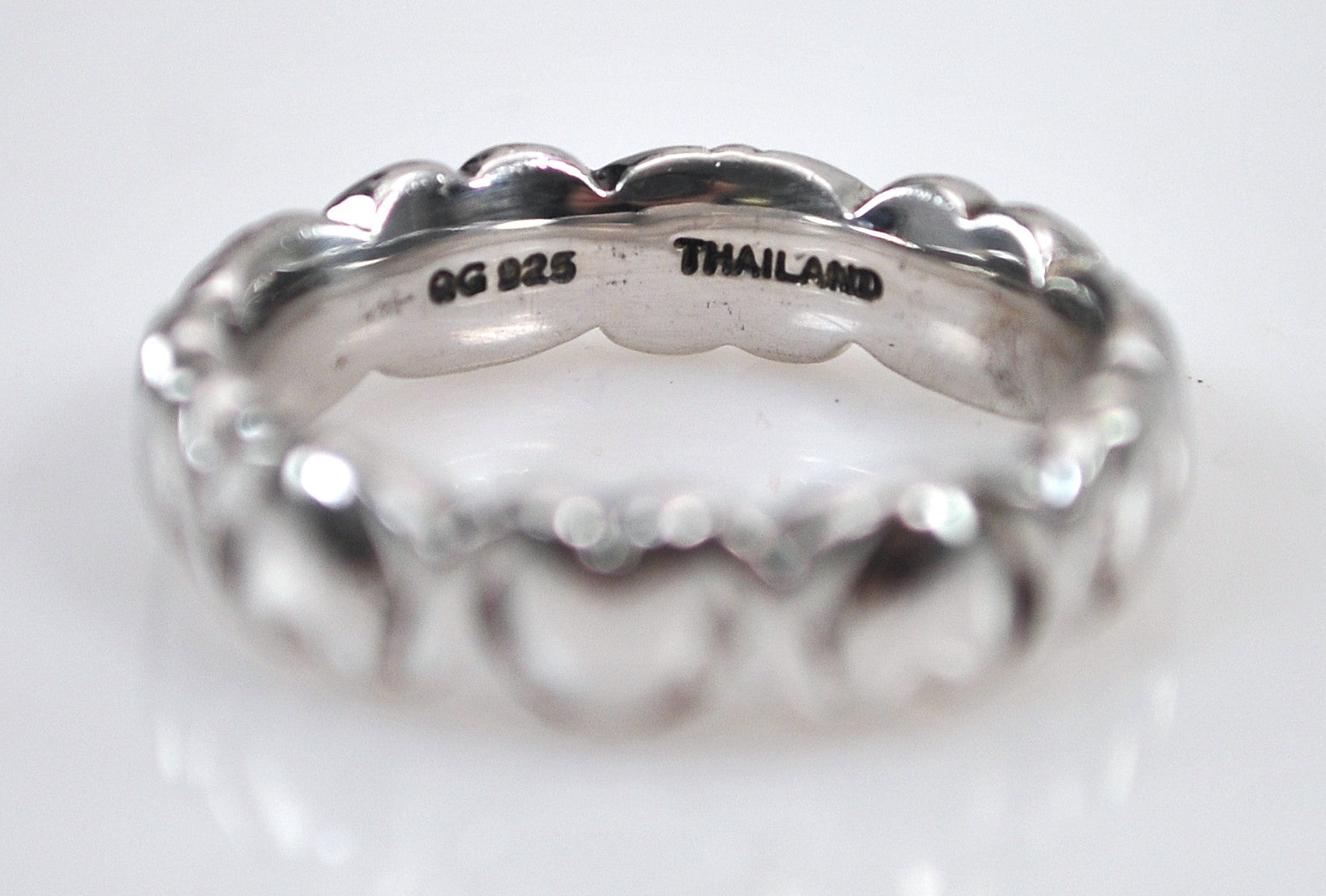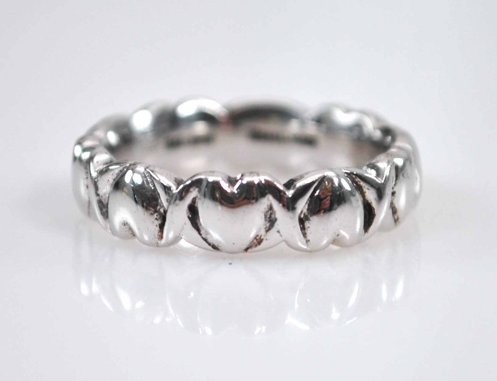 Nicely made designer sterling silver hearts and kisses ring is signed QG 925 Thailand and features alternating hearts with x's in between. The black on the ring is jewelry polish.