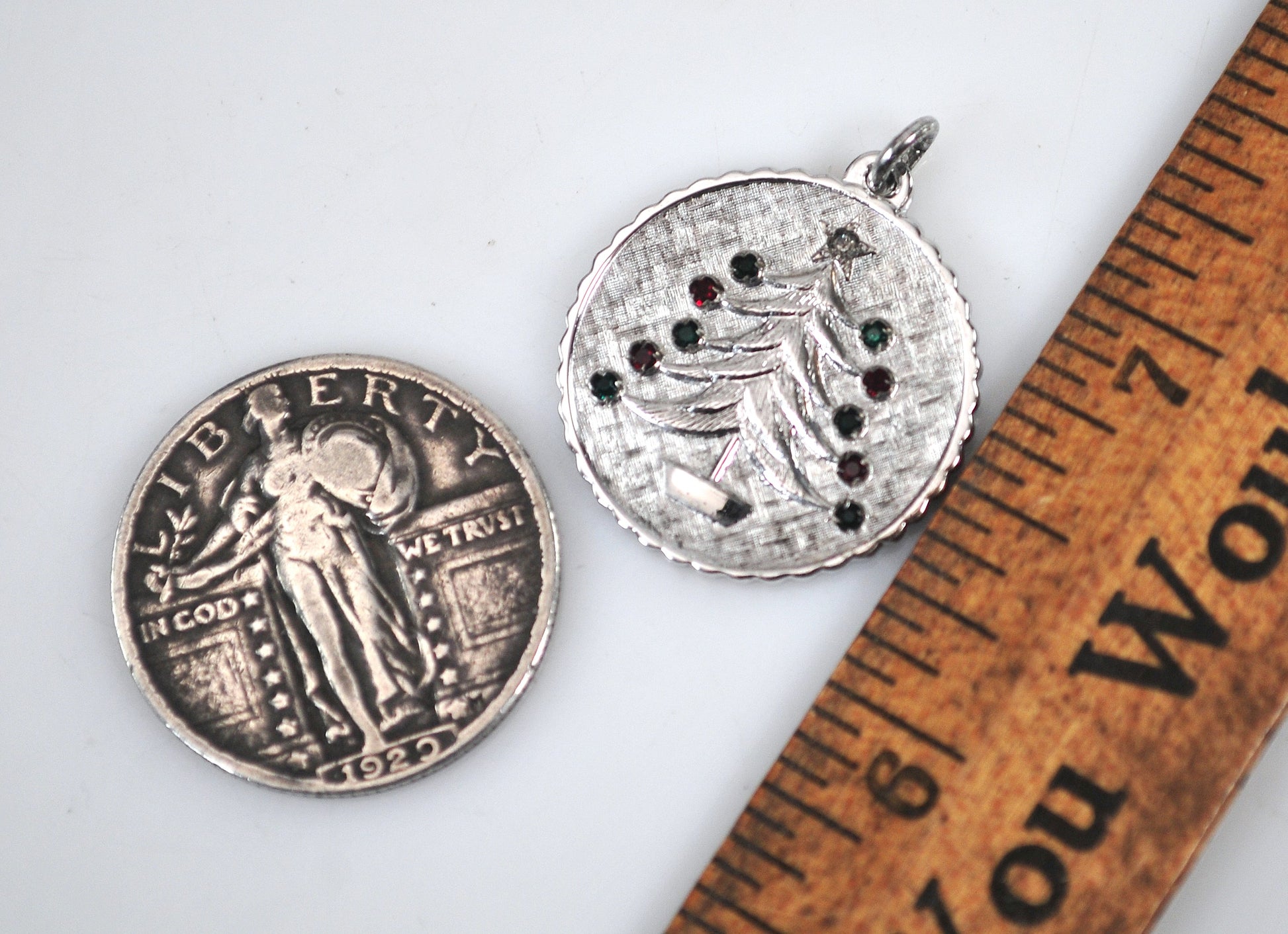 Vintage Mid-Century sterling silver Christmas pendant/charm is marked STERLING on the bail and is Rhodium plated to prevent tarnish. It features red and green rhinestone decorations on the tree and a clear stone at the top. It looks to be unused and unworn.