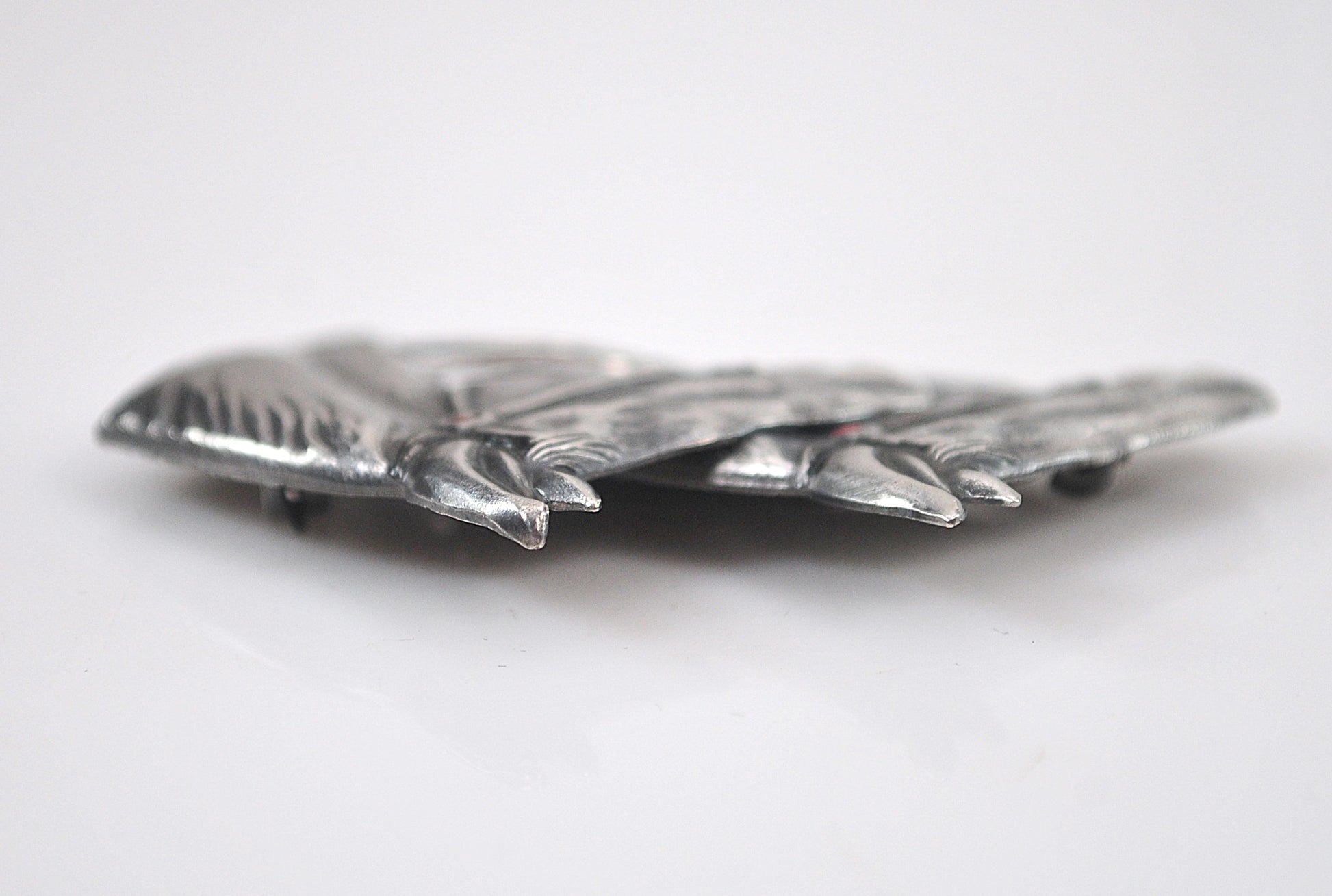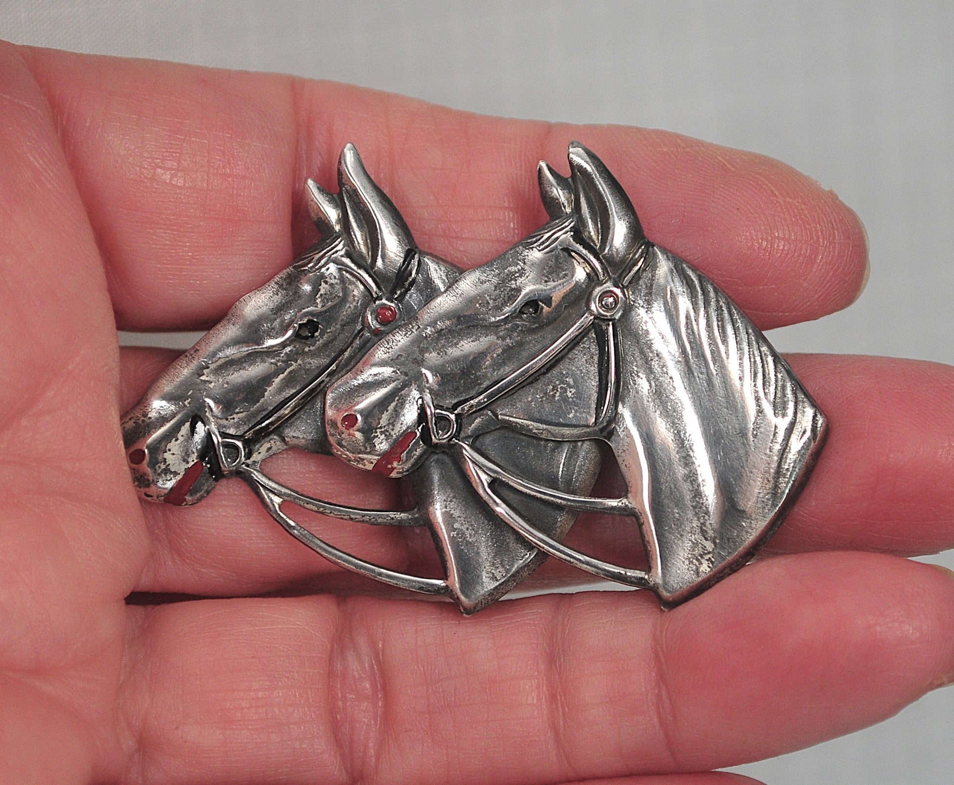 Uncas sterling silver bridled horses heads brooch is hallmarked and features red enamel accents.