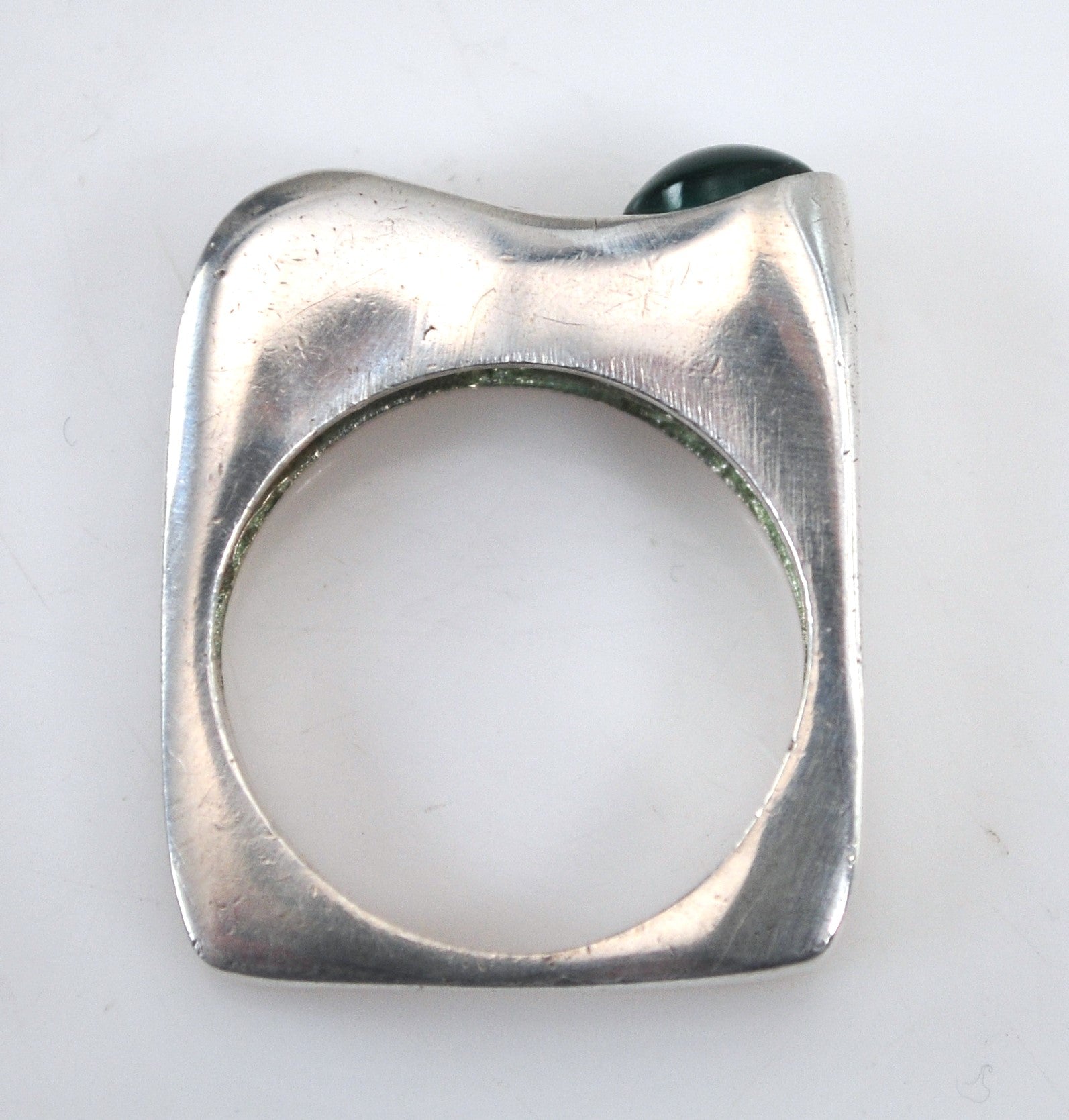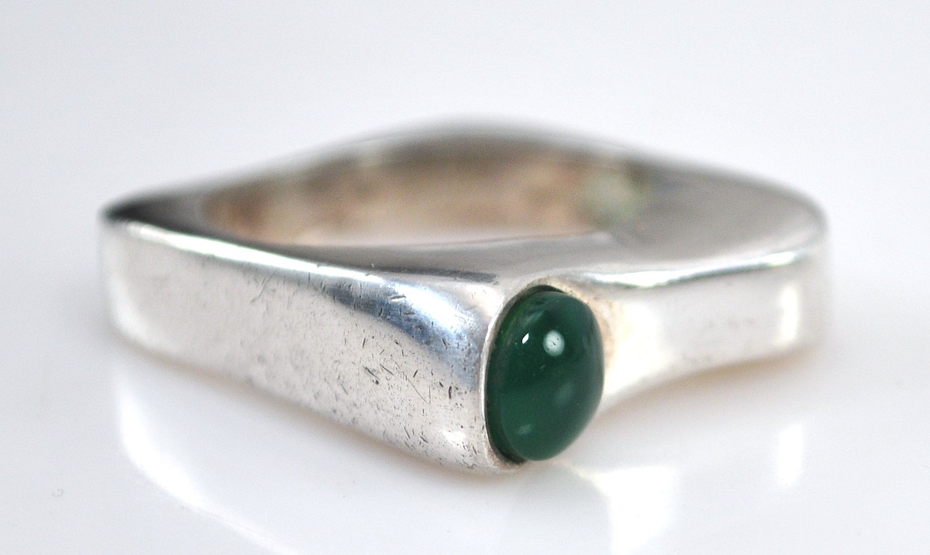Sterling silver Modernist ring is unmarked and tests as sterling silver, and features an offset 5.5mm Green Onyx cabochon.