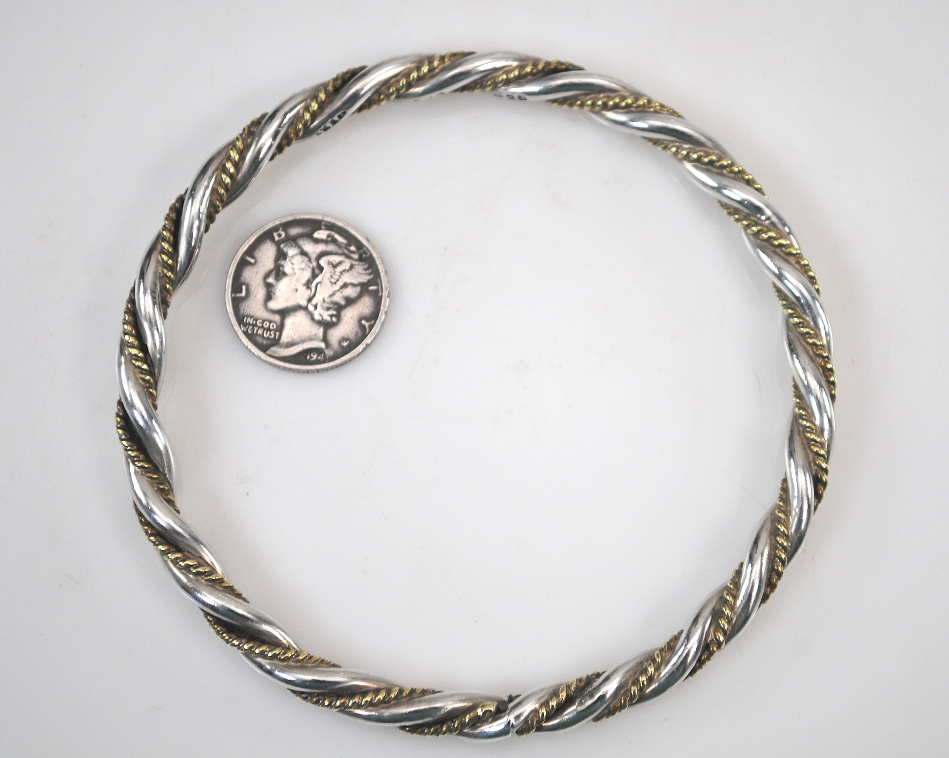 Handmade two tone sterling silver bangle bracelet is signed by its maker and marked 925 and features brass twisted wire.