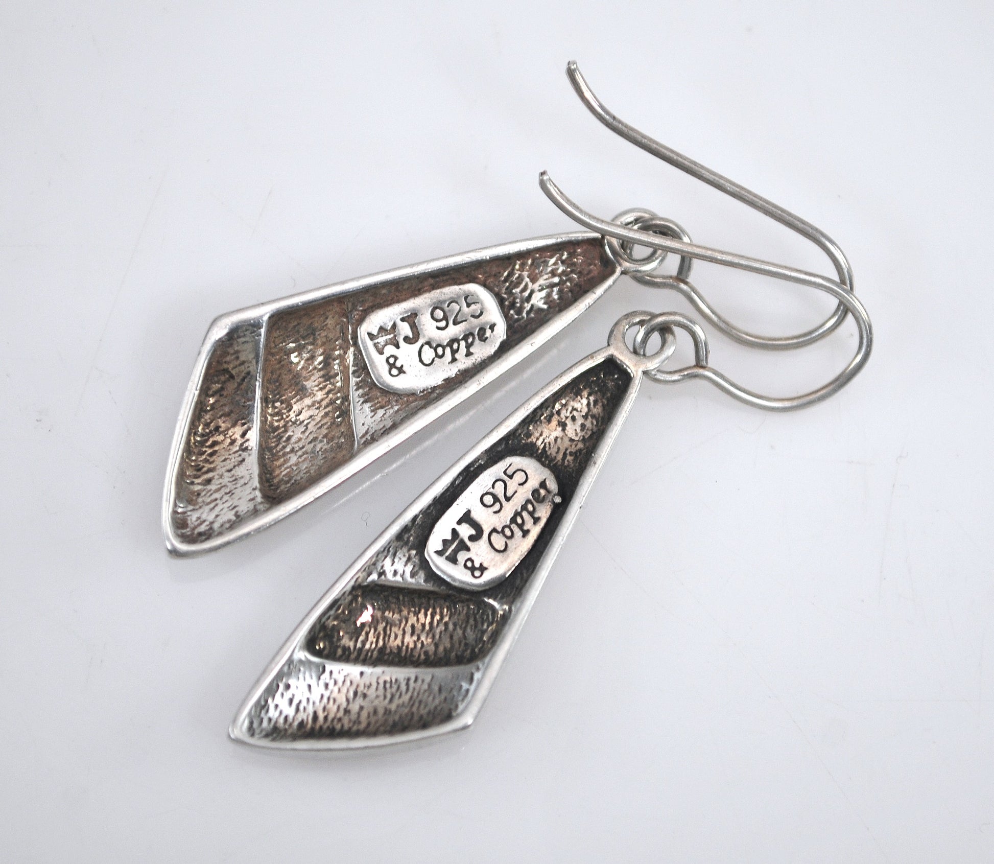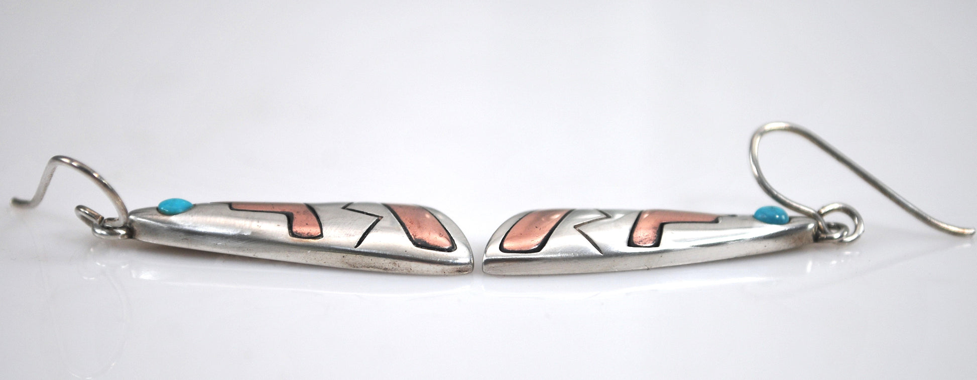 Nicely made mixed metal earrings are signed WJ 925 and Copper and feature Southwestern designs and a small Turquoise cabochon.