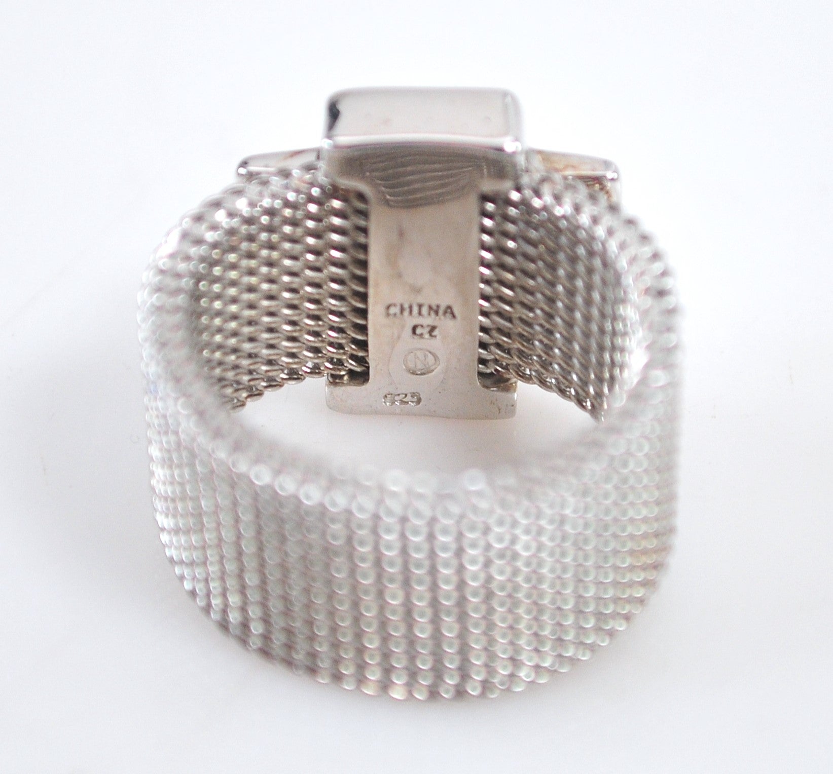 Sparkly sterling silver wide mesh CZ cross ring is signed 925 CZ China and a maker's mark of an N in a circle and features a 3/8 inch band.