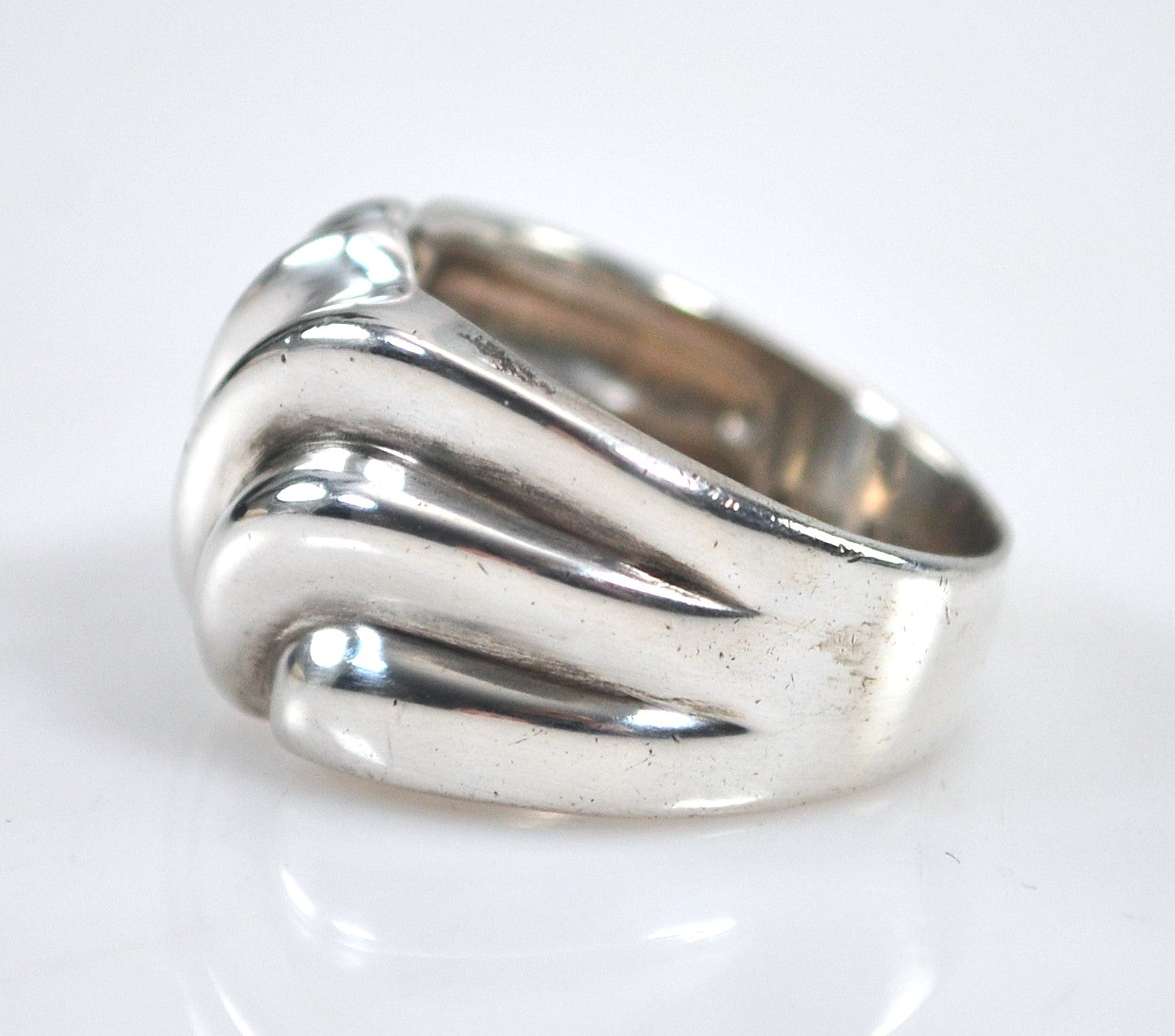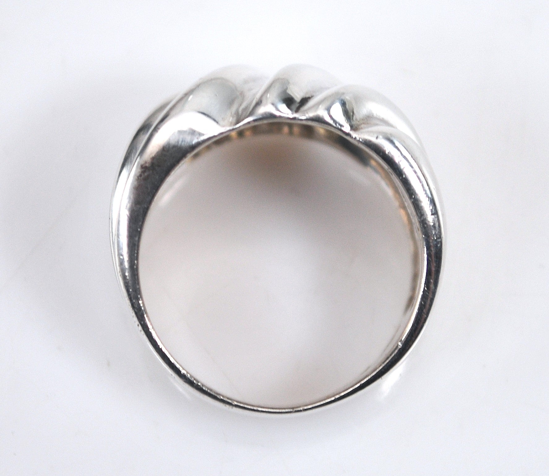 Shiny sterling silver ring is signed 925 NF and features a Modernist rib design.